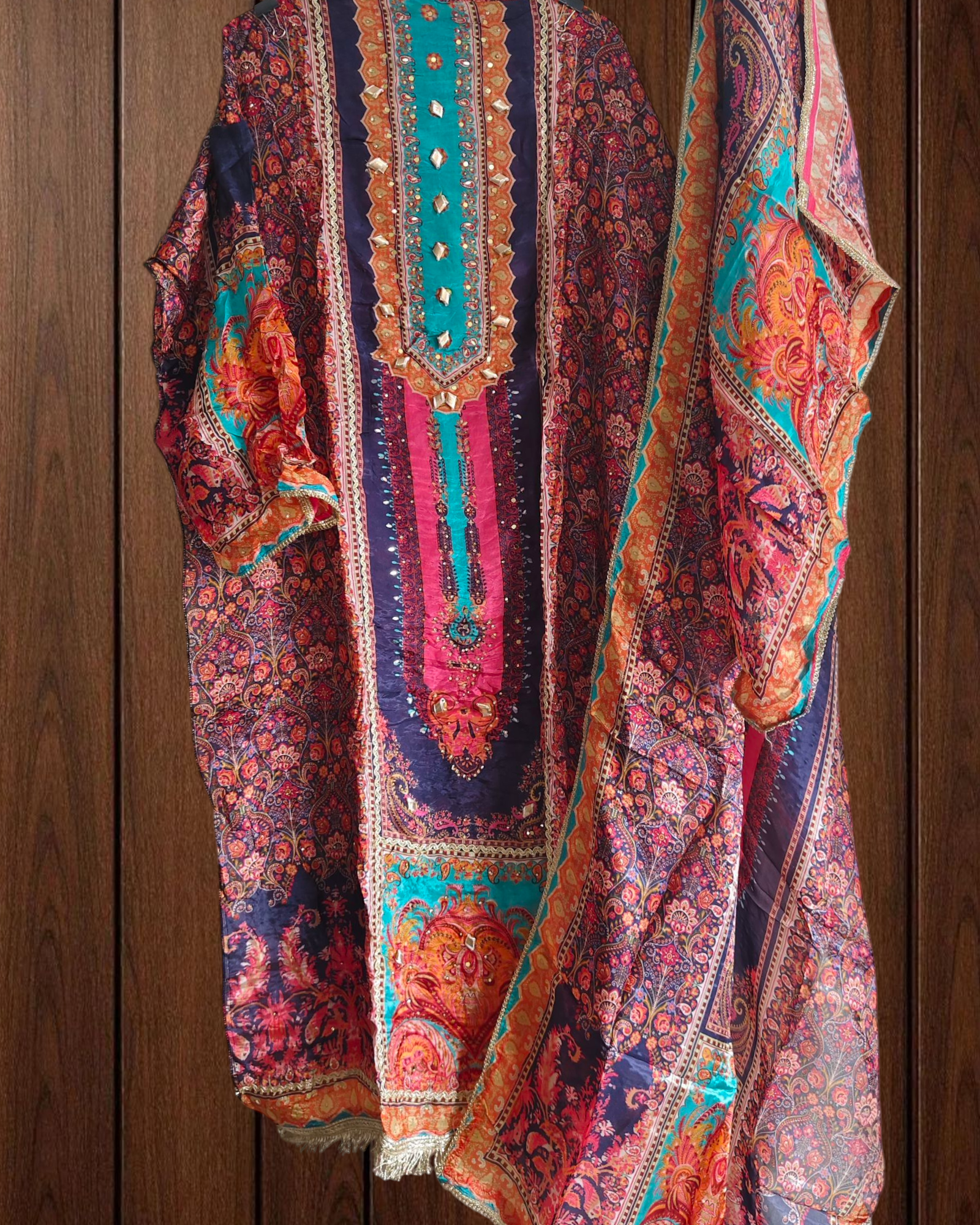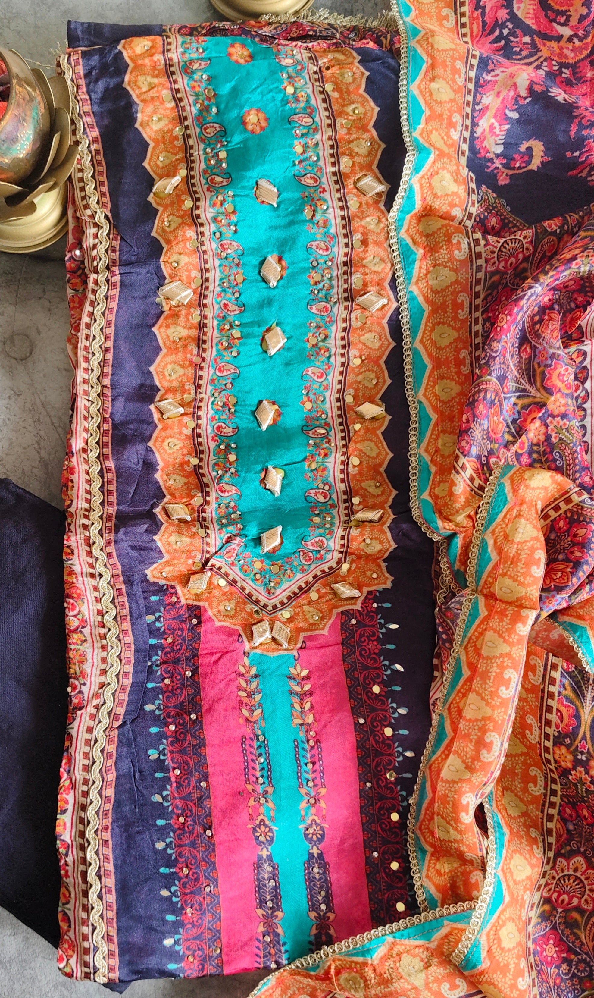 Dazzle in this stunning Upara Silk ensemble, featuring intricate gotta and mirror work that lends a rich, festive charm. The digital prints on luxurious silk fabric create a perfect balance of traditional artistry and modern elegance, making it an ideal choice for special occasions and celebrations.