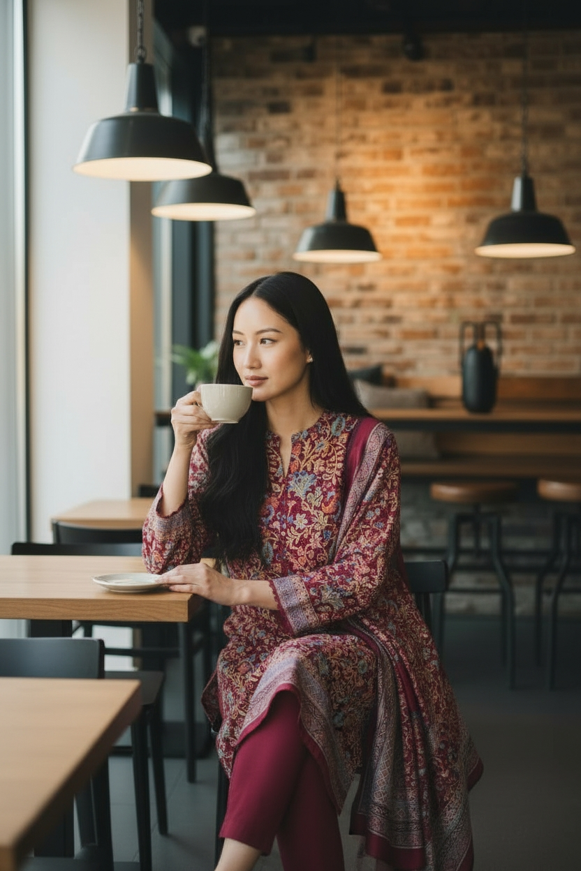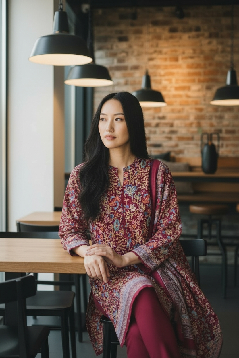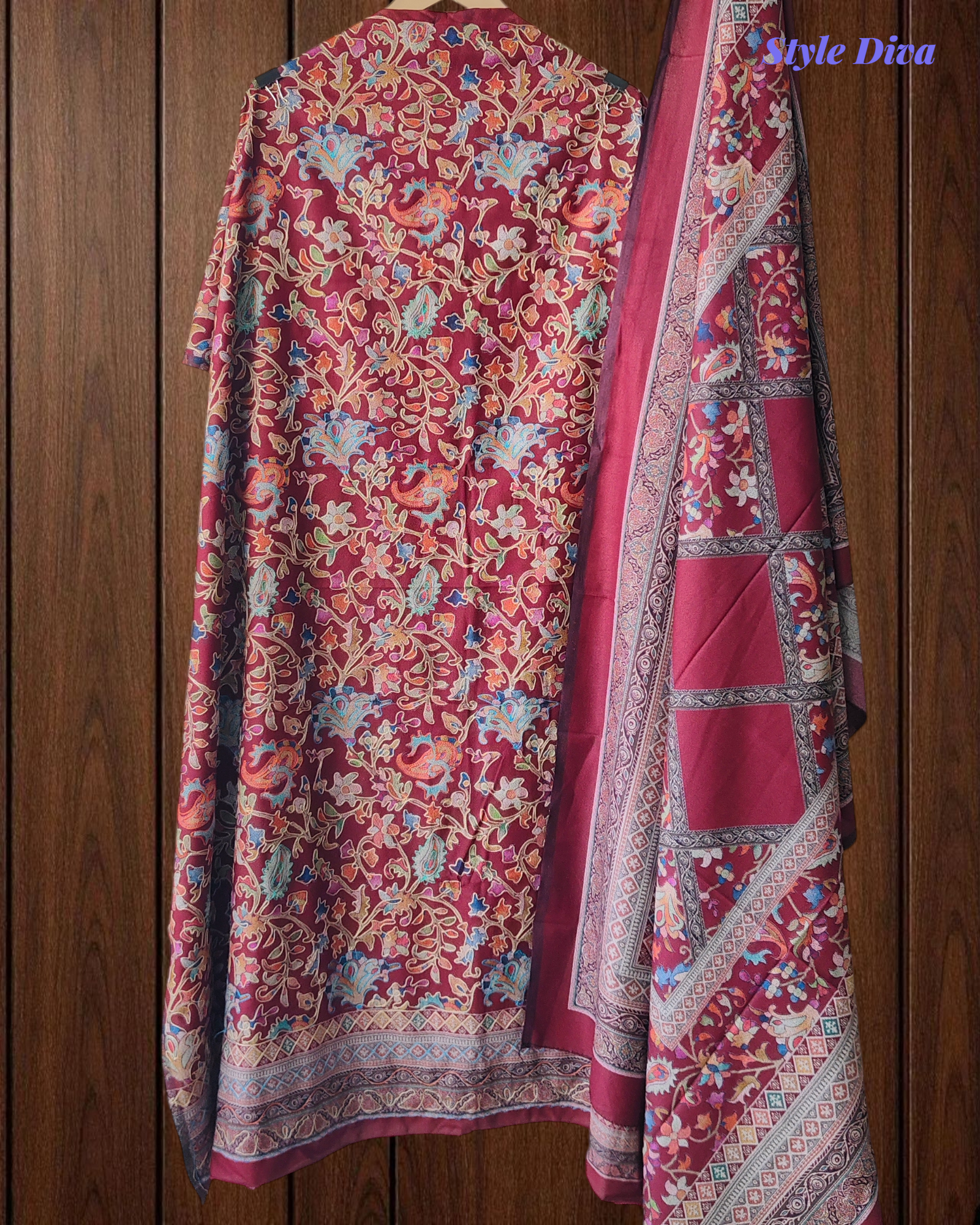 (MAROON)Winter Wear- Premium Pashmina Kurta Set with Digital Prints & All-Over Embroidery