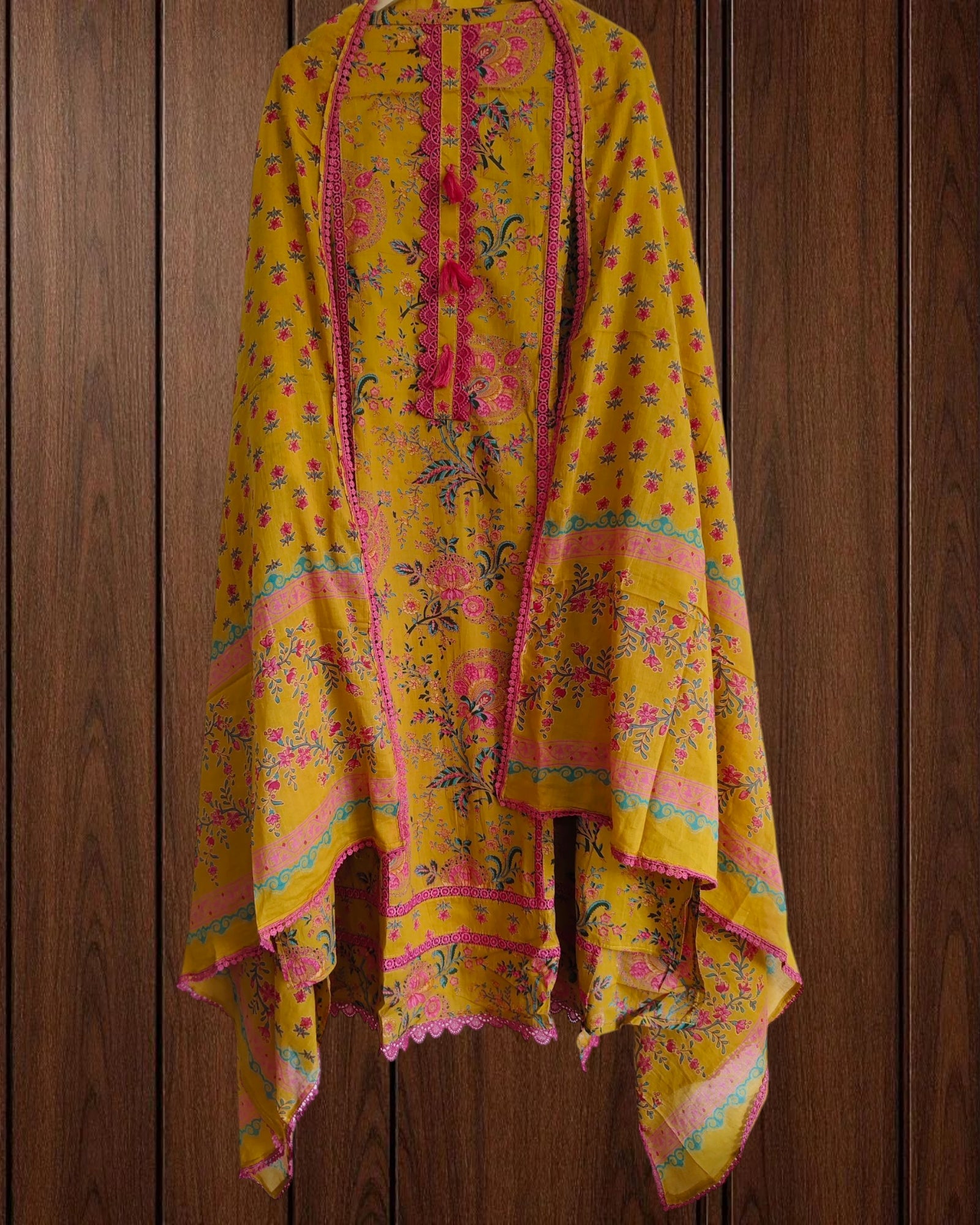 Unveil elegance with this Pakistani-inspired cotton suit adorned in classic Croatia lacing. The printed cotton dupatta beautifully complements the kurta, creating a refined ethnic look perfect for festive gatherings and daywear charm. Complete with a soft rayon bottom, this unstitched set promises comfort with style.