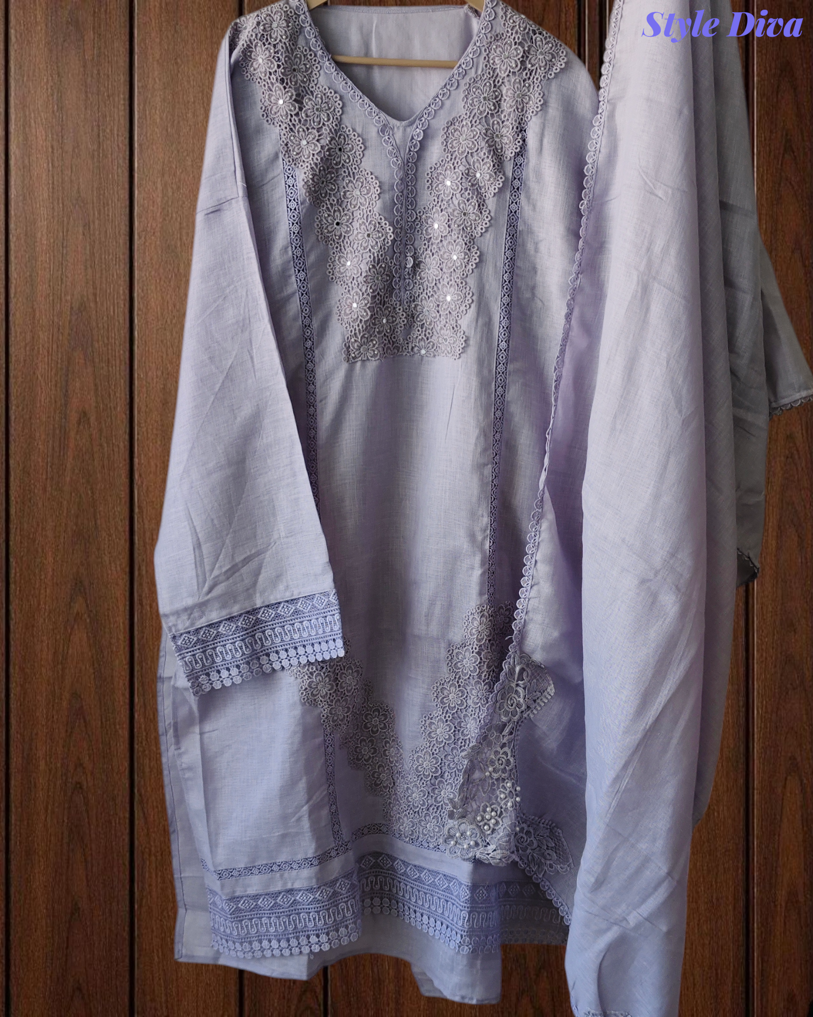 Kurta: Pure Cotton (Khadi) Pakistani-style kurta adorned with elegant crochet lacing that adds a handcrafted, artisanal charm.