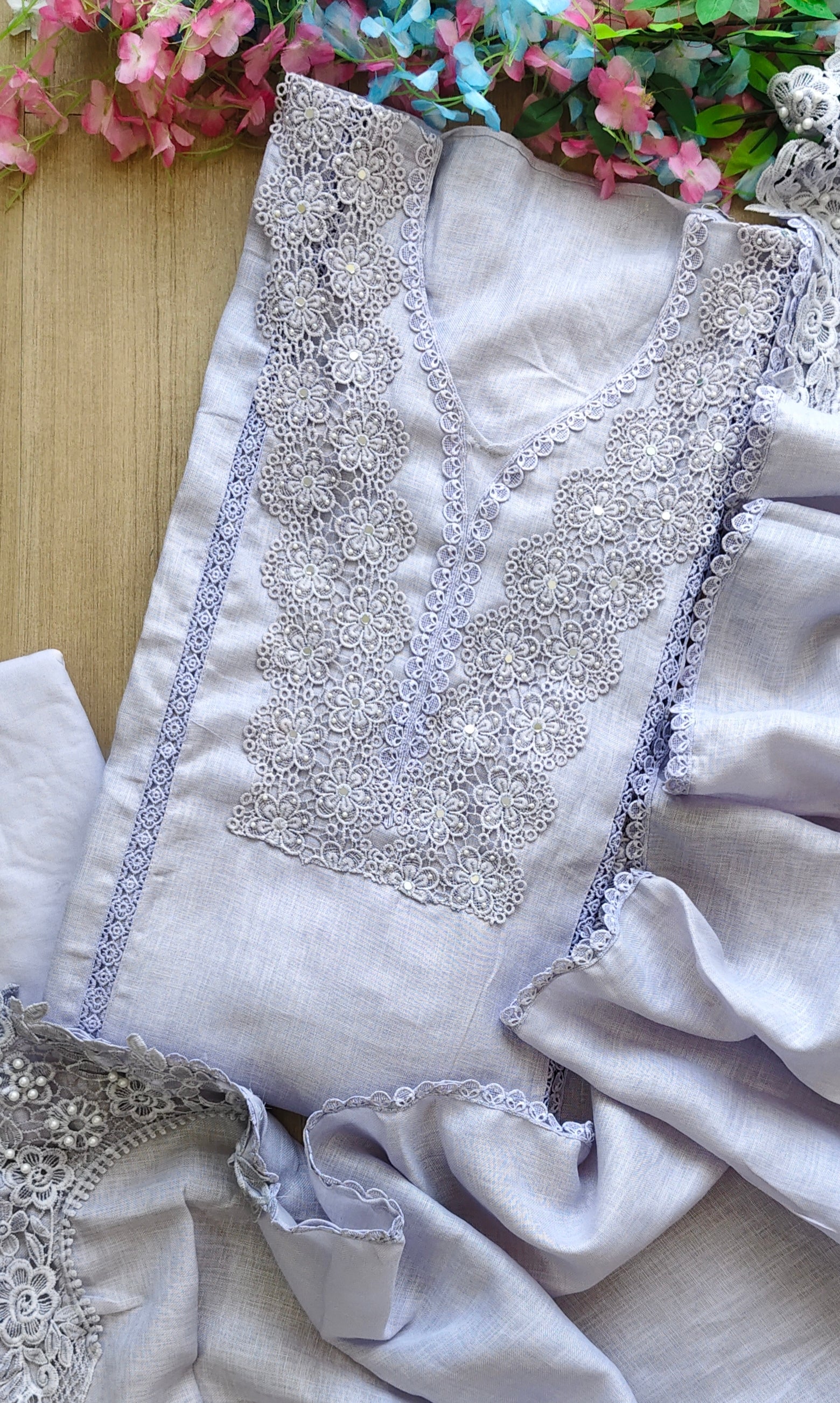Dupatta: Matching Cotton (Khadi) dupatta detailed with delicate crochet lacing for a coordinated and graceful look.