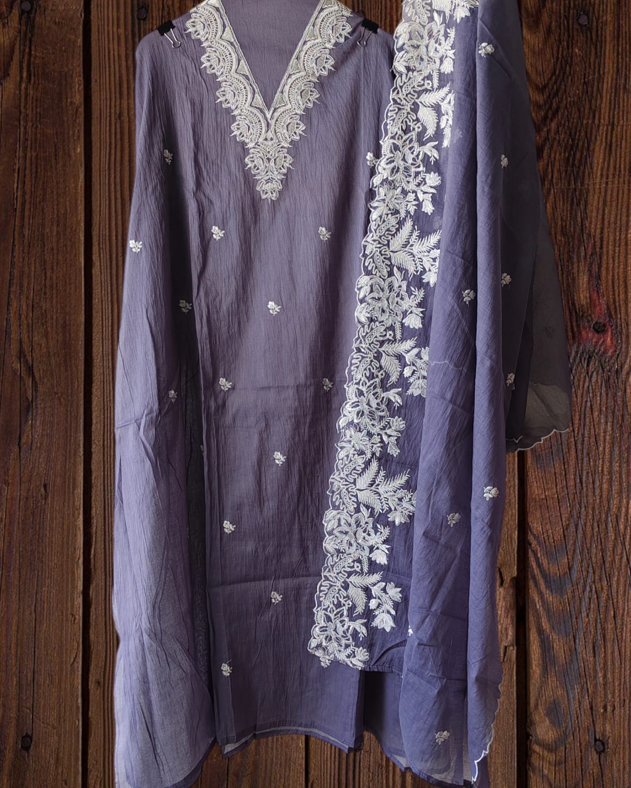 Add elegance to your festive wardrobe with this beautifully designed Mul unstitched suit set. The kurta features stylish laser cut detailing enhanced with intricate thread embroidery, giving it a refined and contemporary look. Paired with a graceful Mul embroidered dupatta, the set offers a perfect blend of tradition and modern design. The soft rayon bottom fabric ensures comfort while completing the outfit, making it an ideal choice for festive celebrations and special occasions.