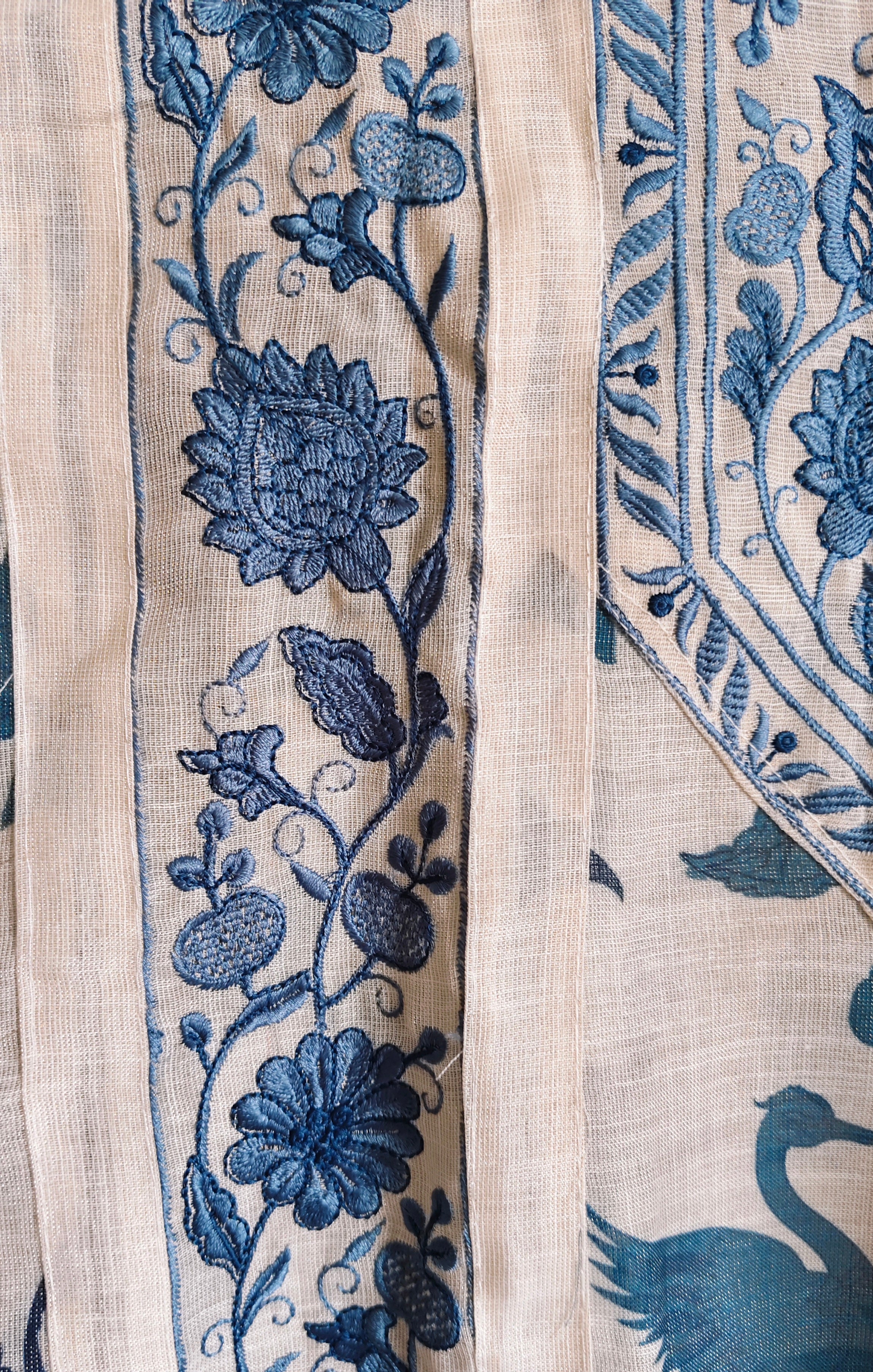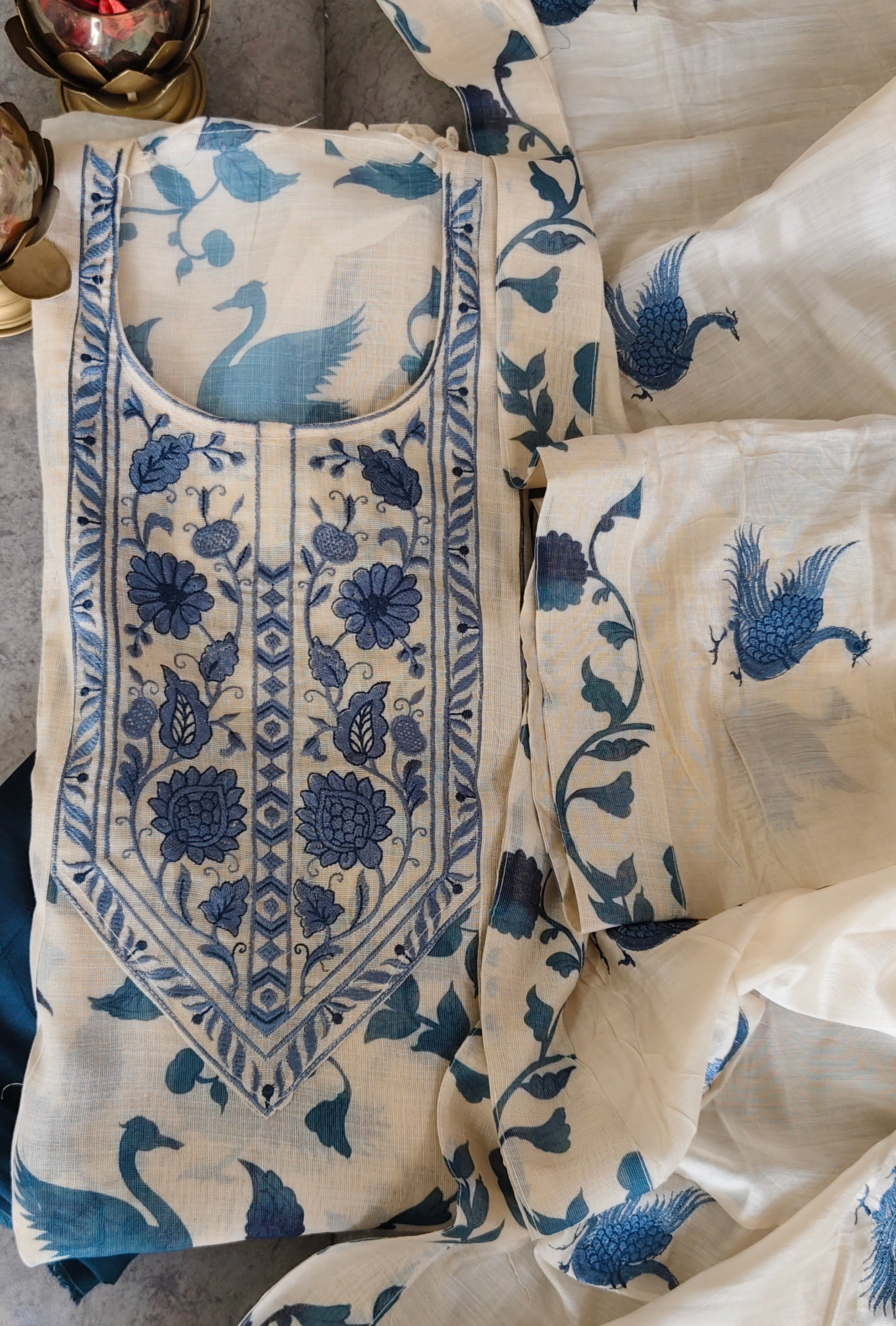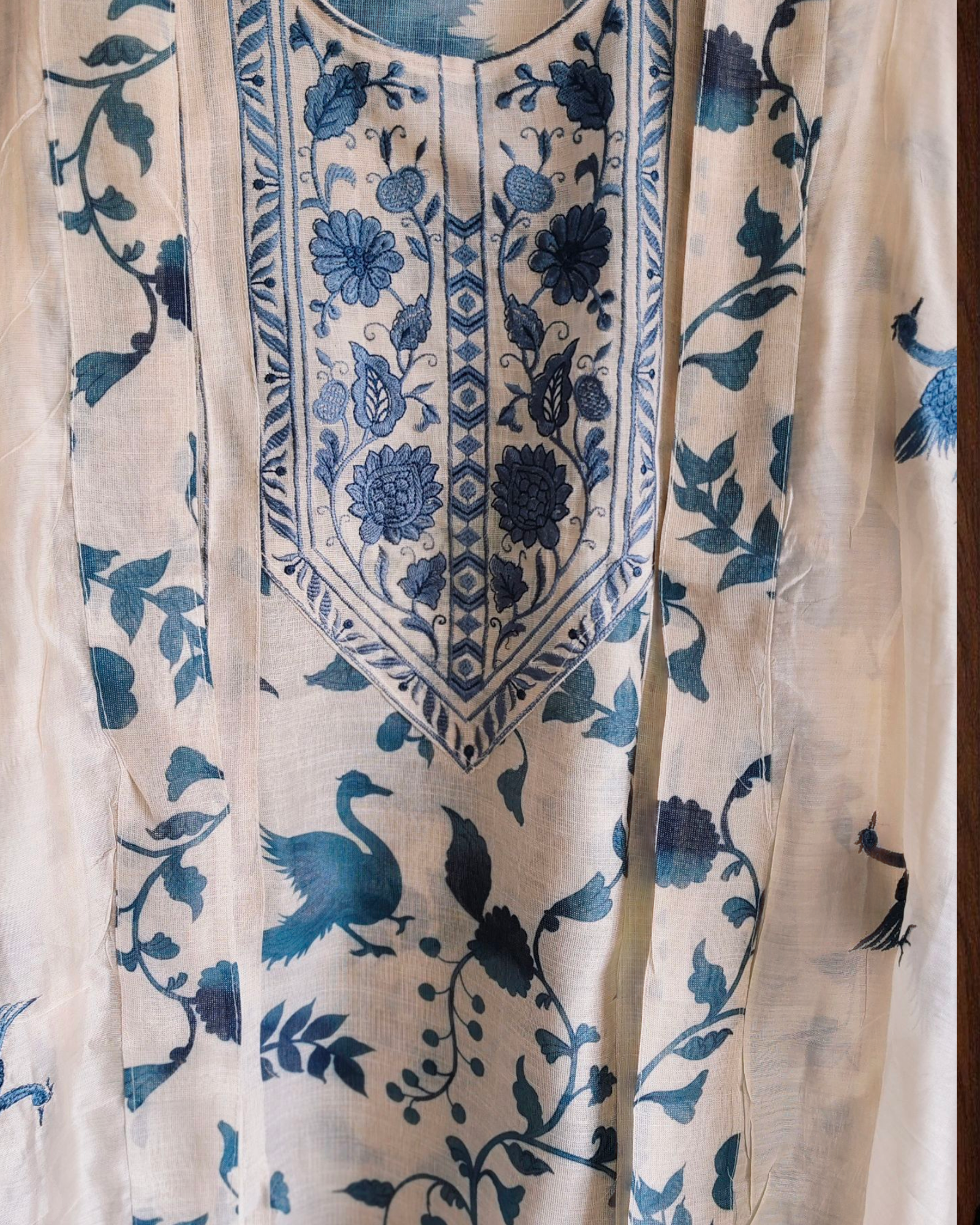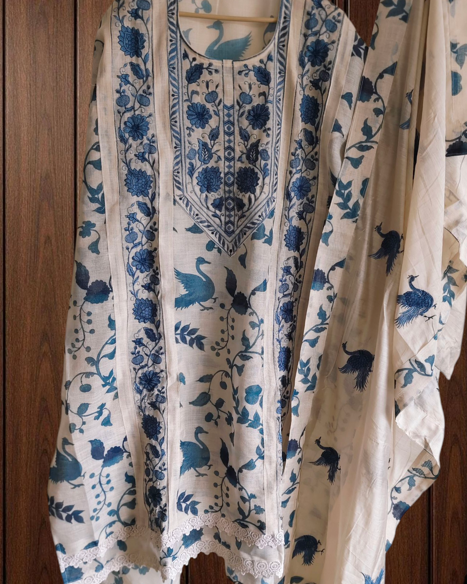 Step into everyday elegance with this linen printed kurta, highlighted by refined embroidery on the neckline and subtle crochet lacing for a touch of charm. Paired with a soft mul embroidered dupatta and a comfortable contrast rayon bottom, this set blends style with ease — perfect for casual outings and daily wear.