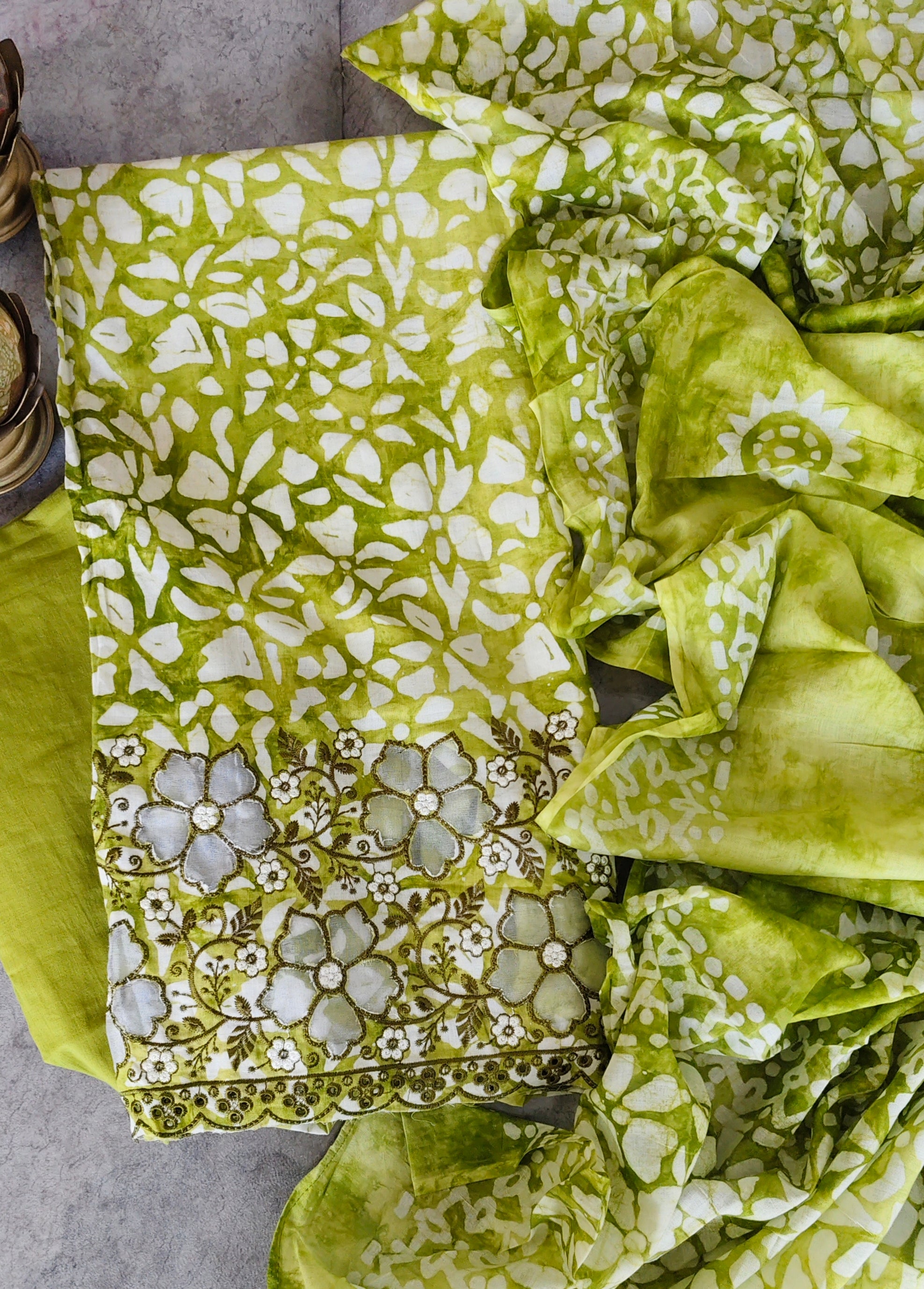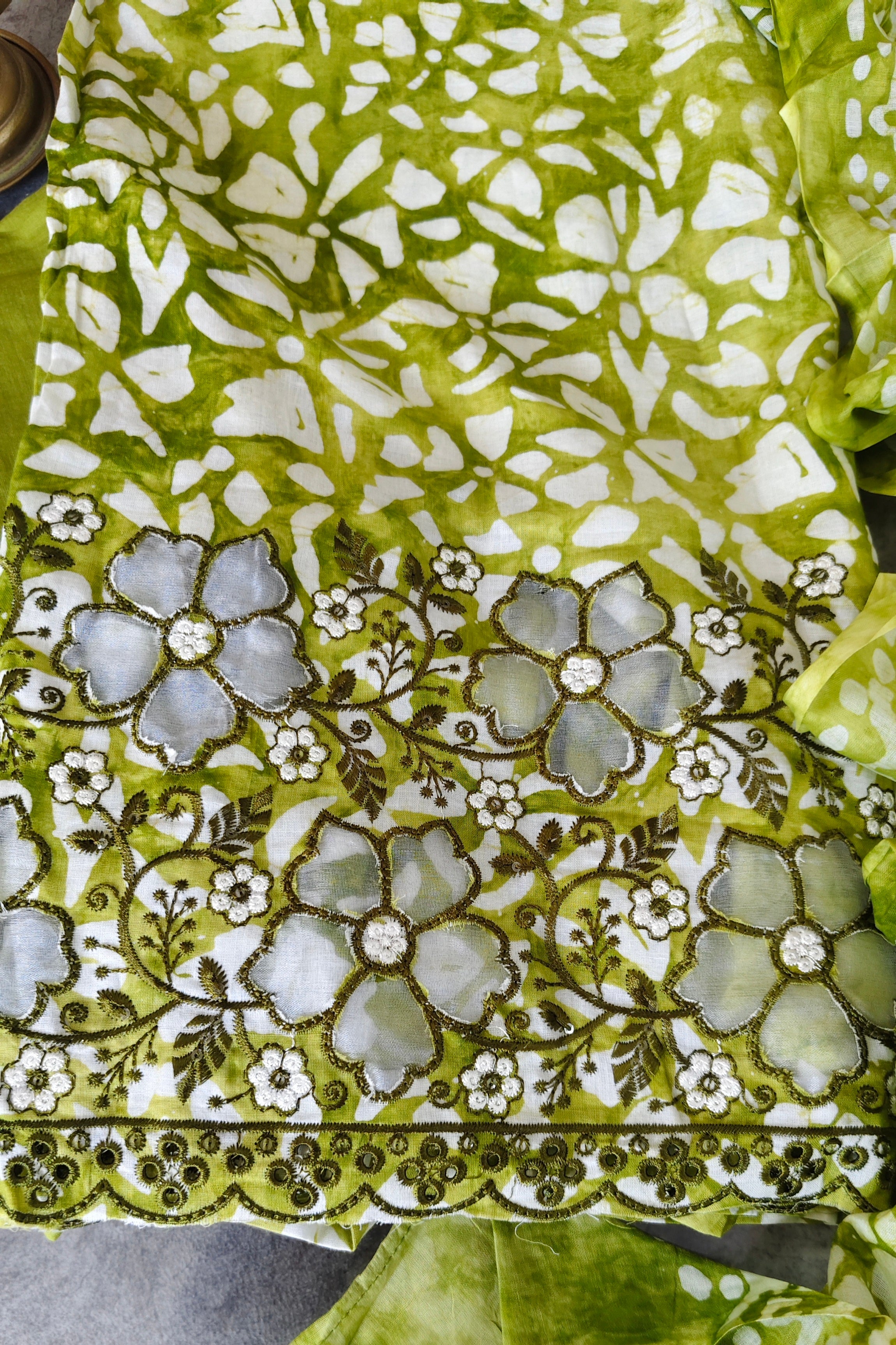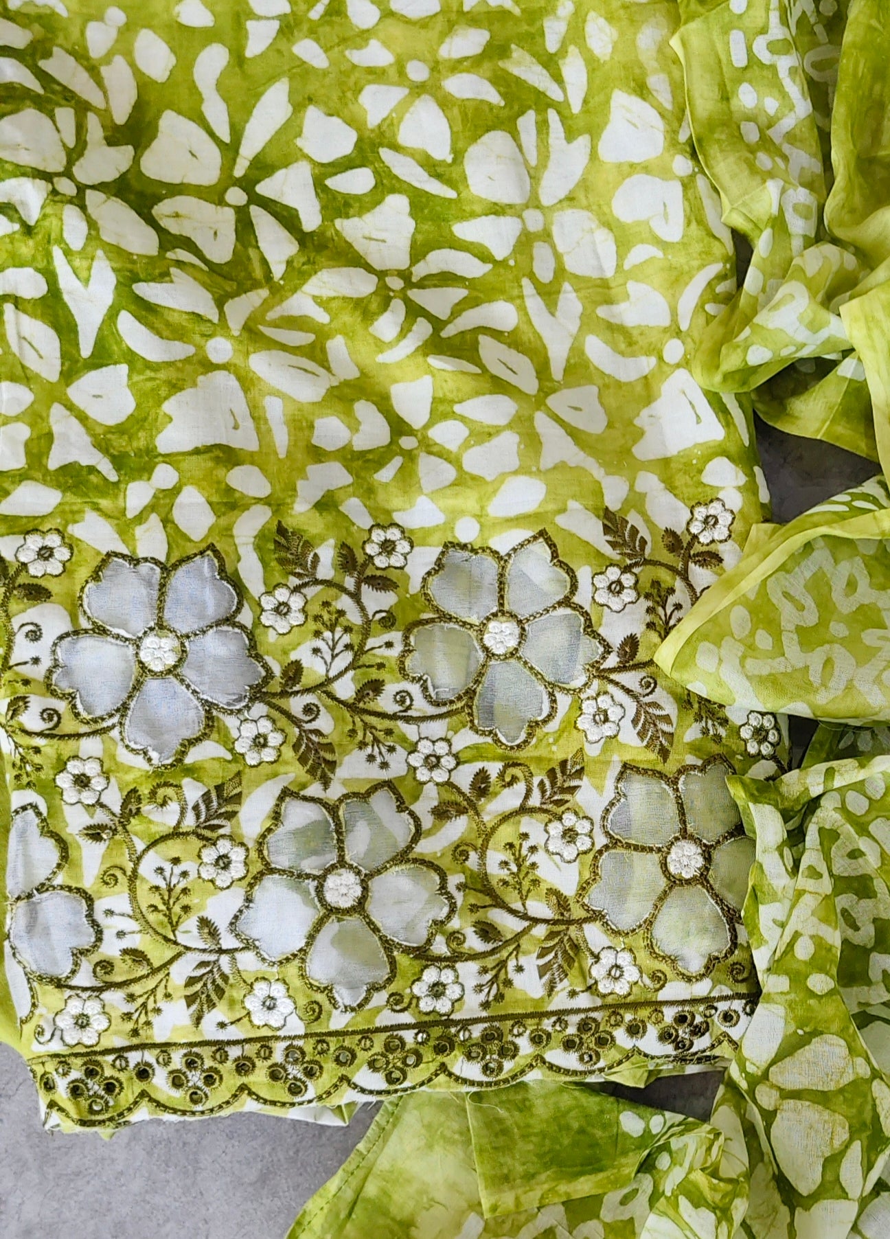 Bring effortless charm to your everyday look with this cotton batik print suit. The kurta features delicate laser-cut daman work, paired with a coordinated batik printed dupatta and soft cotton bottom fabric. Designed for comfort and style, it’s an ideal pick for casual outings and daily wear.