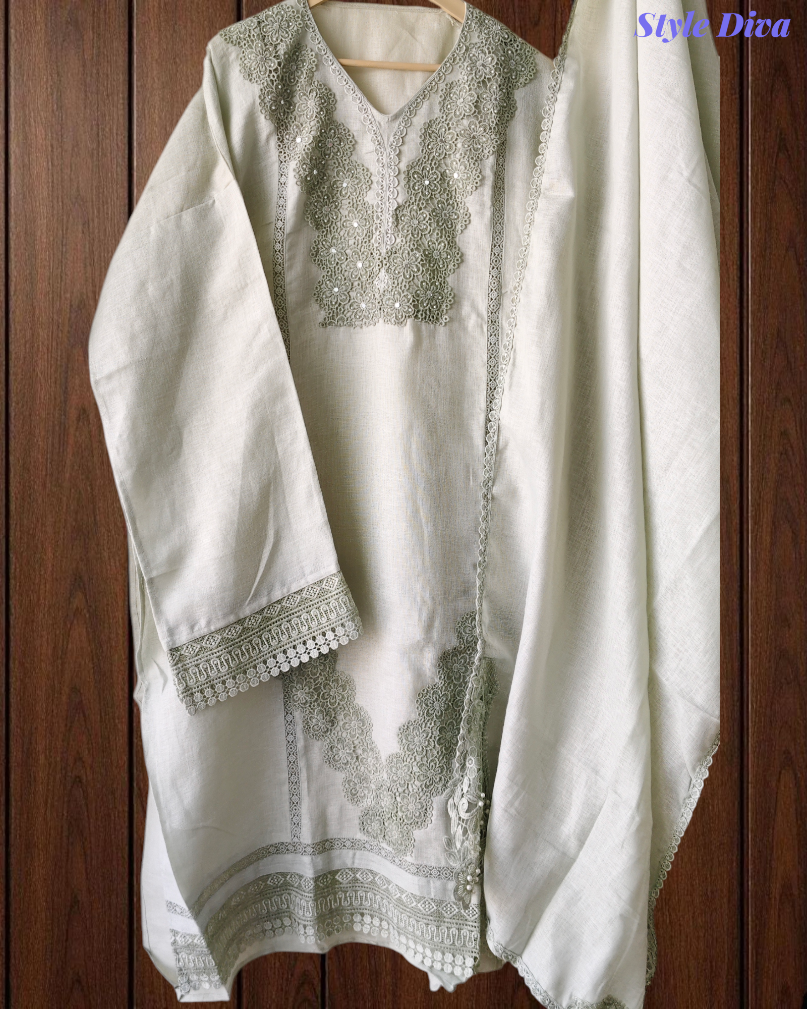 Kurta: Pure Cotton (Khadi) Pakistani-style kurta adorned with elegant crochet lacing that adds a handcrafted, artisanal charm.