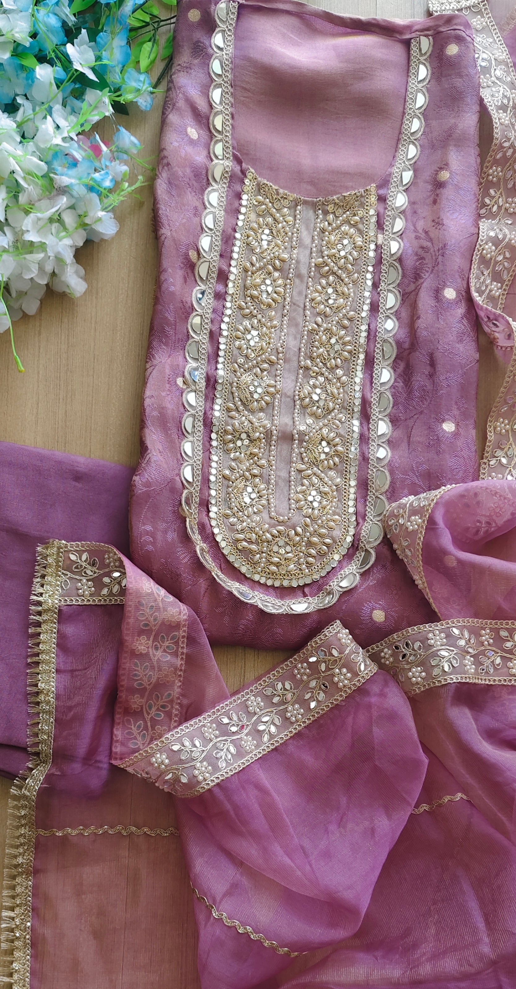 A graceful un-stitched shimmer tissue suit set designed for festive and party occasions. The pearl and mirror work adds elegant sparkle, while the organza dupatta and shantoon bottom ensure a refined and comfortable look.