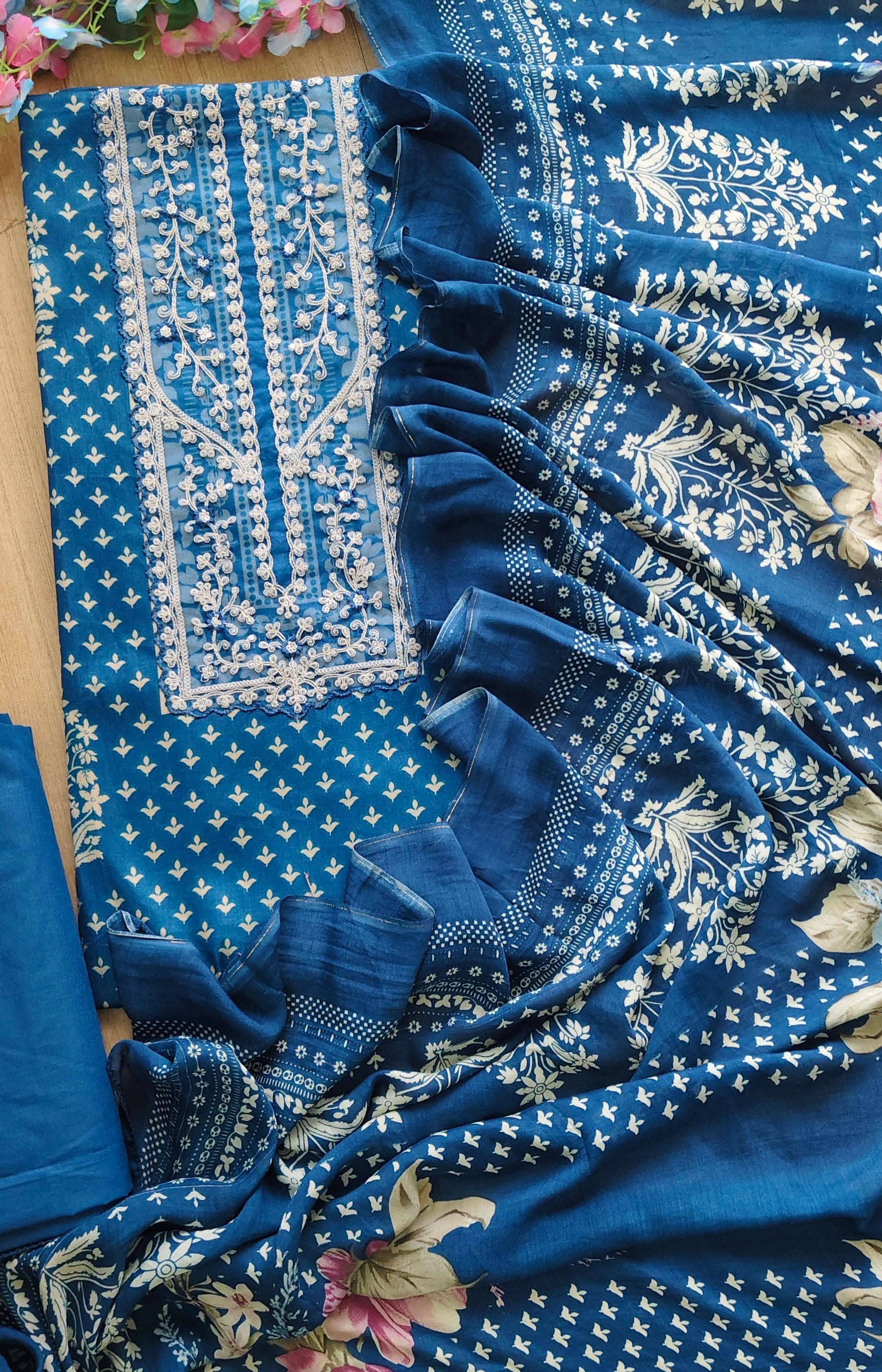 Elegant Glazed Cotton Un-Stitched Suit with Digital Print & Organza Embroidery Patch Work