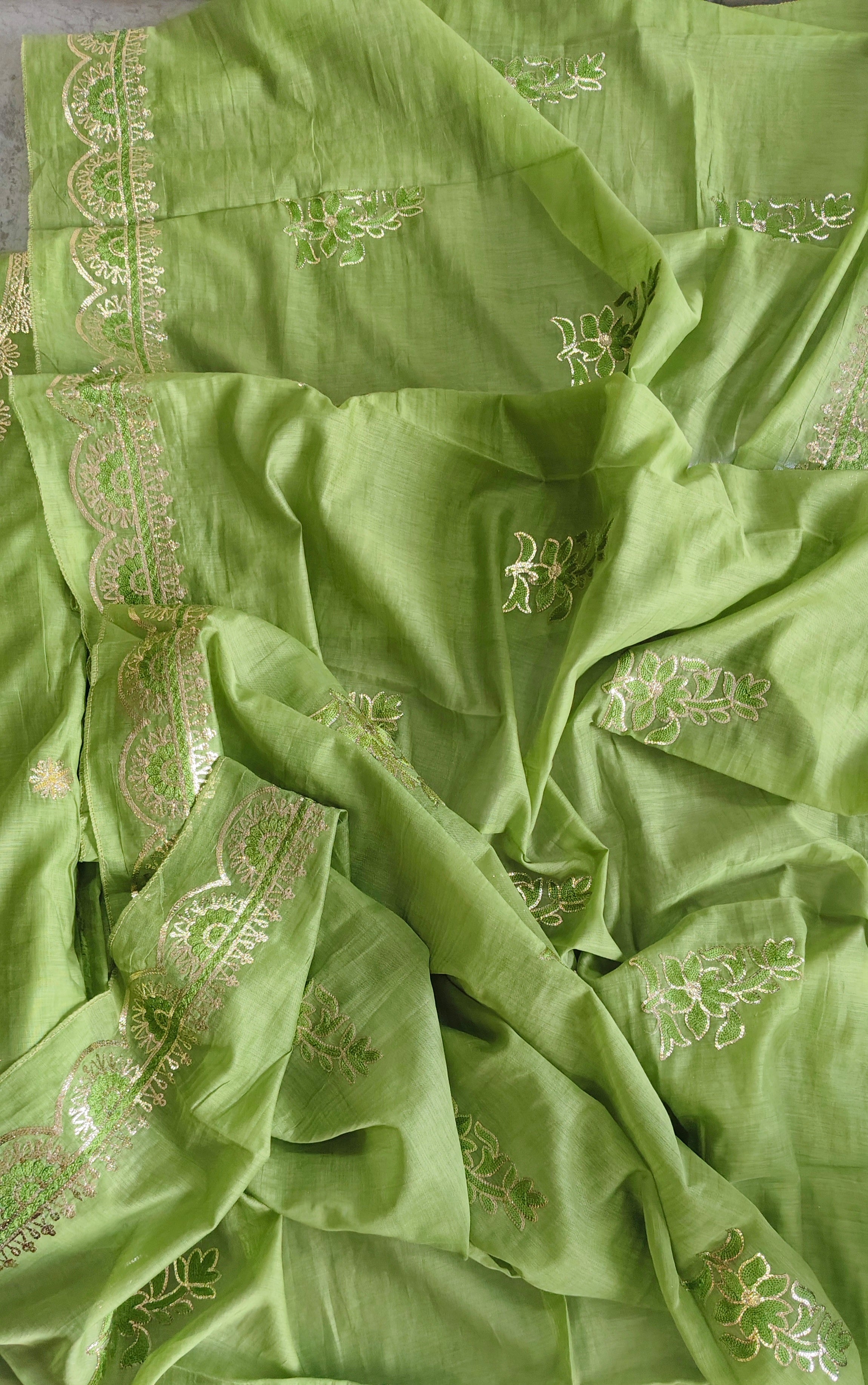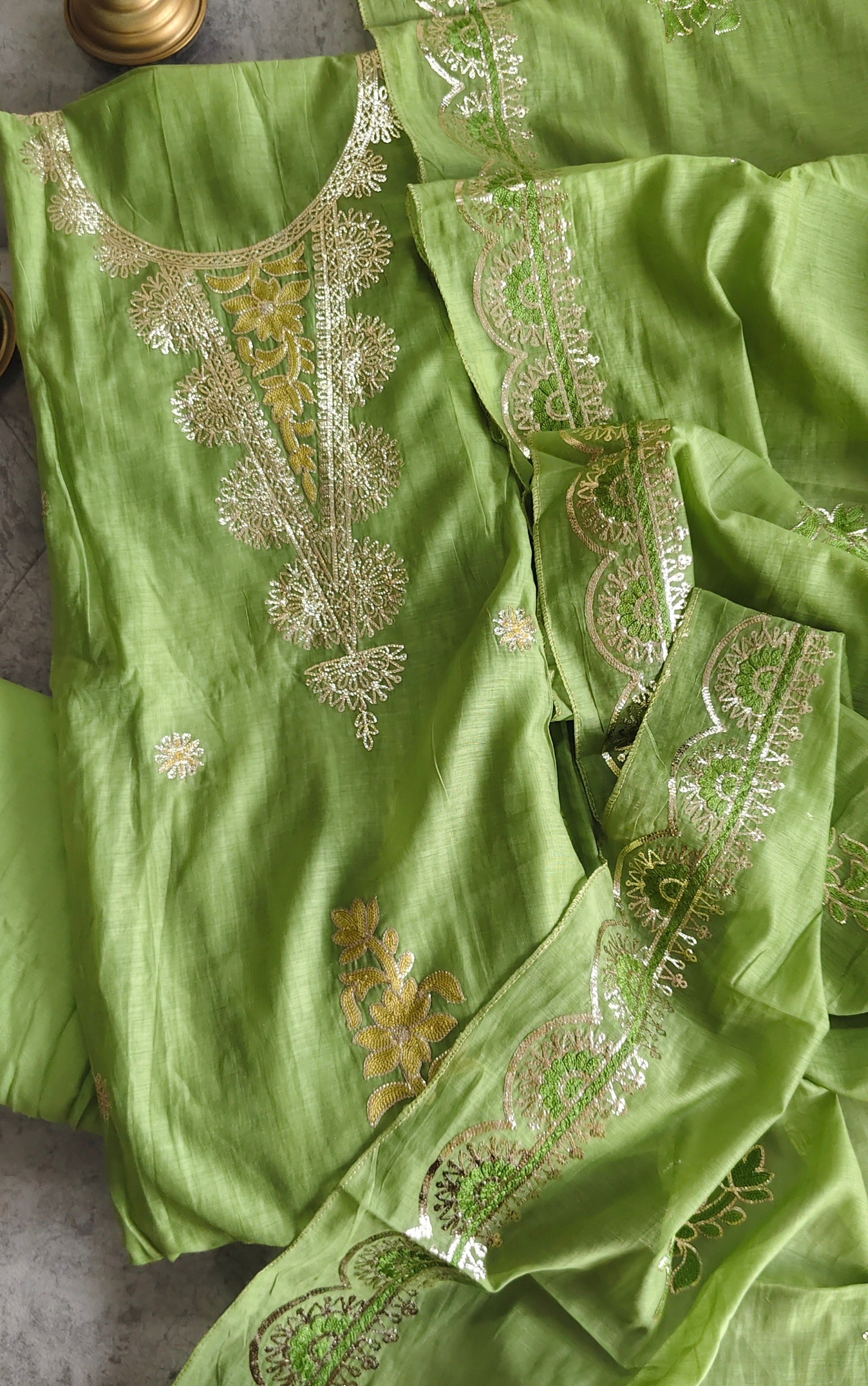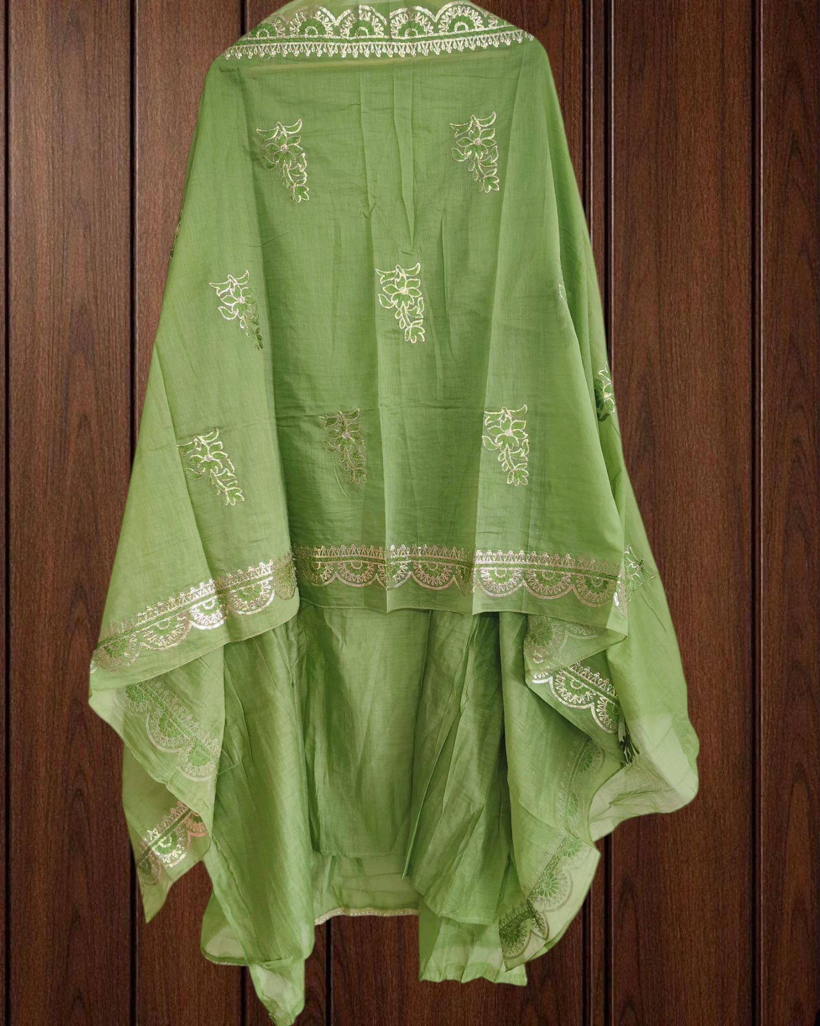 Dupatta: Matching Mul Chanderi Dupatta beautifully embellished with Pita and embroidery work, adding a graceful charm.