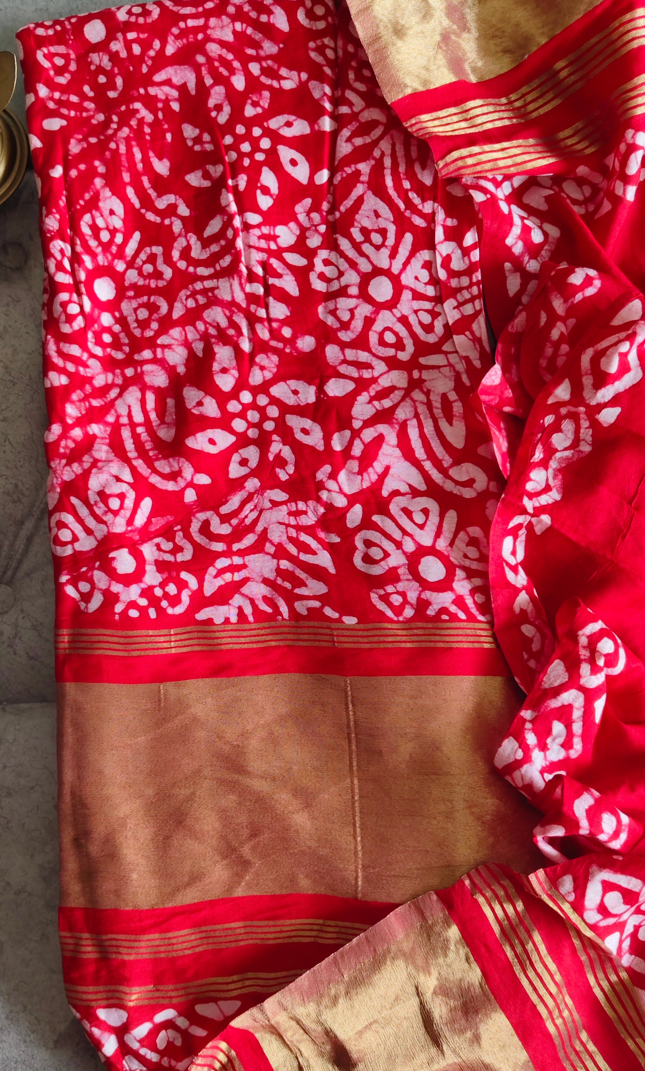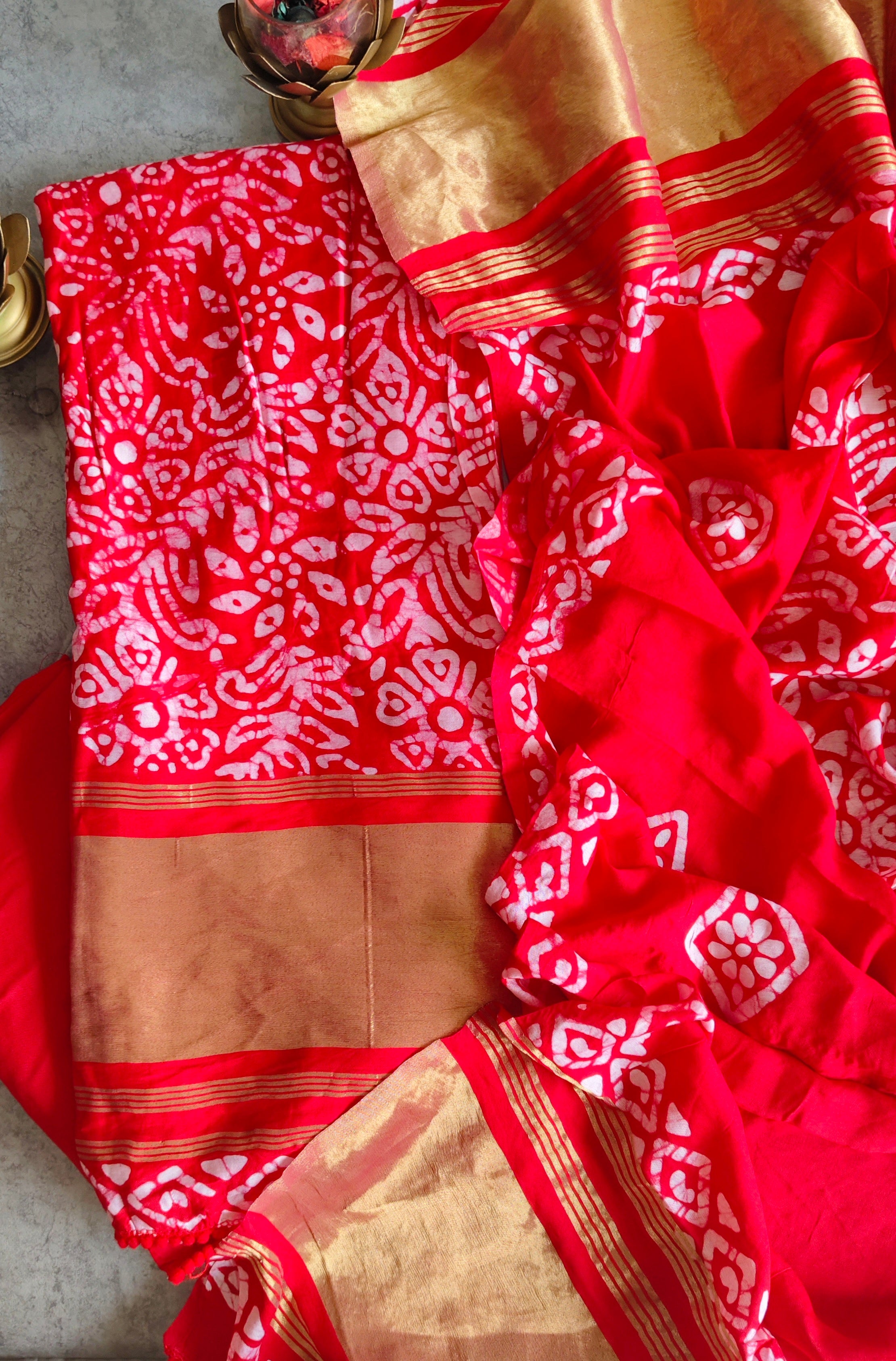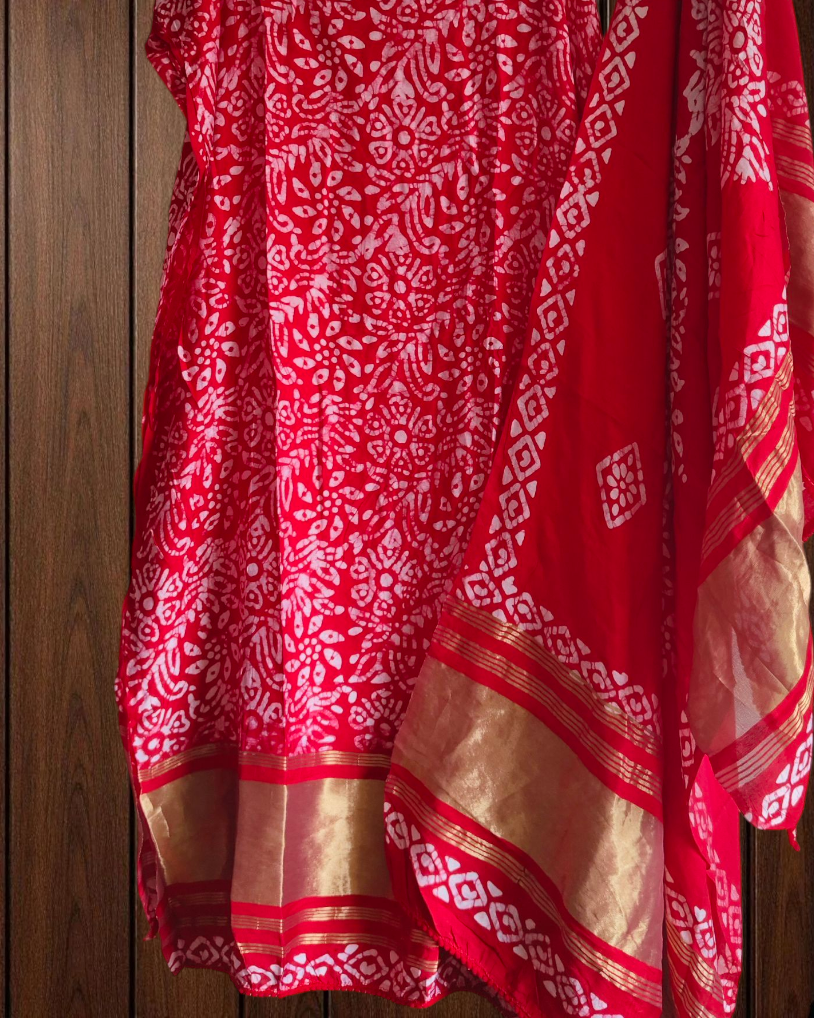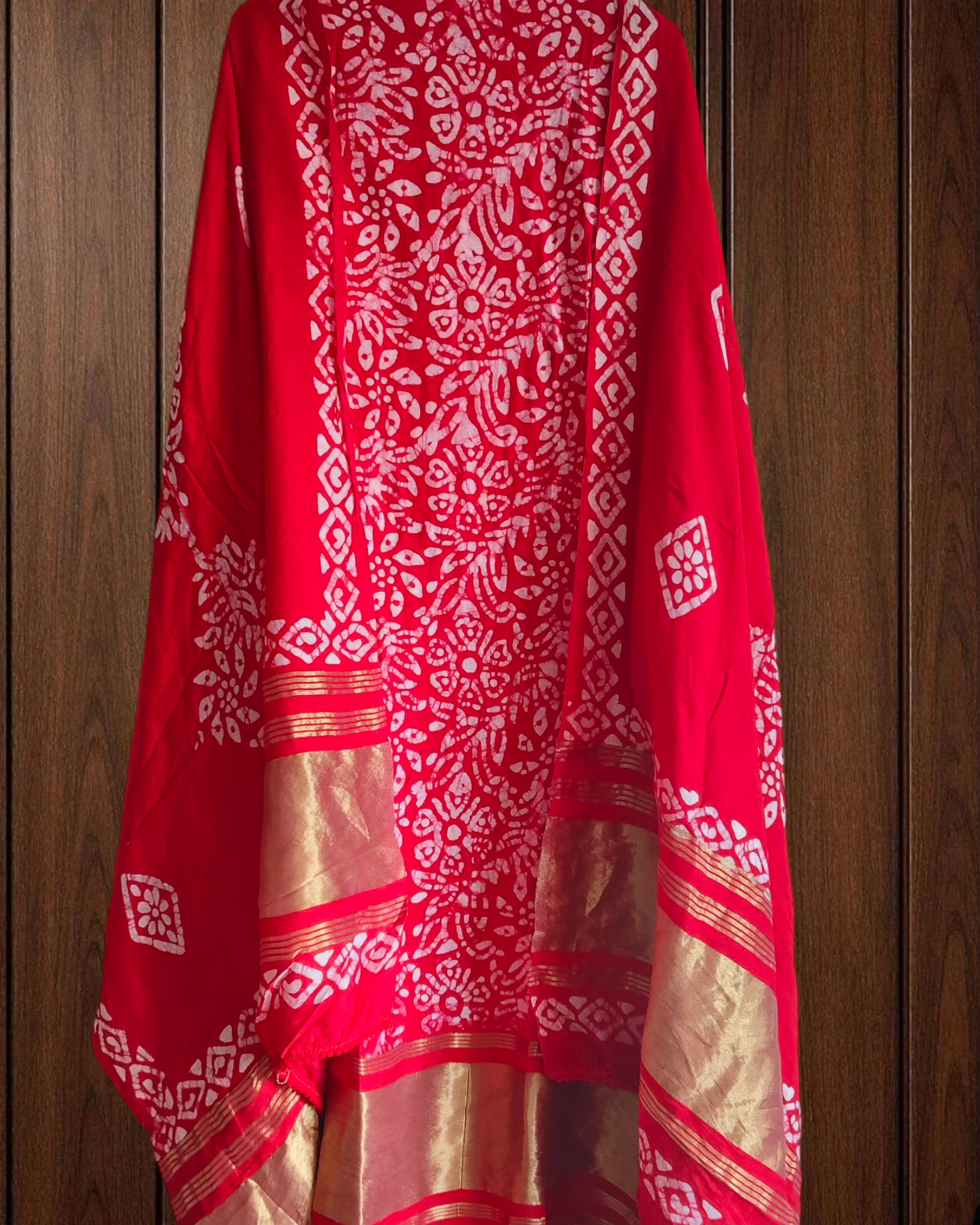Elegant Muslin Batik Print Suit with Banarasi Accents- RED COLOR