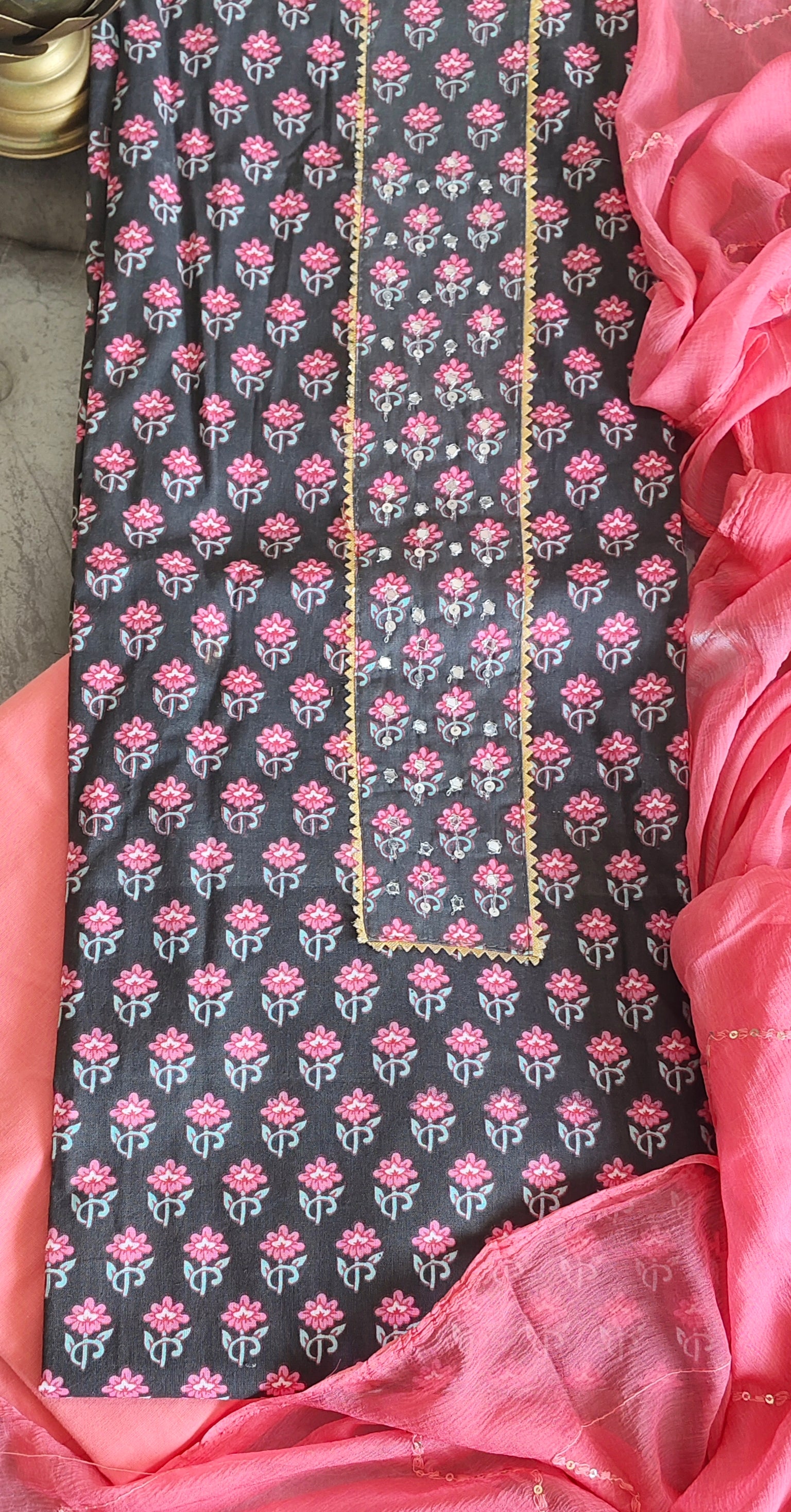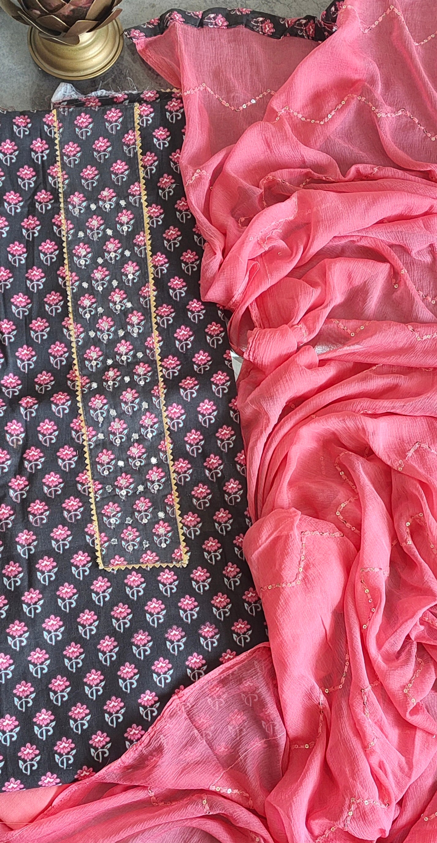 🌸 A perfect blend of comfort and charm, this cotton printed suit is accentuated with mirror and gotta detailing for a touch of festive sparkle. The chiffon dupatta with sequins adds an airy elegance, making it a versatile pick for casual outings or light occasions.