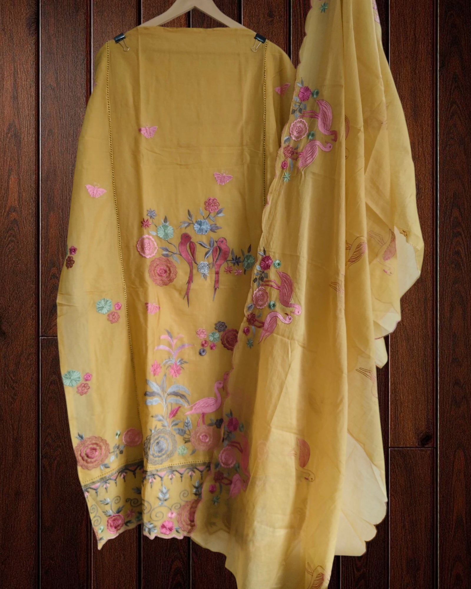 A timeless ensemble crafted from soft Mul Chanderi fabric, this suit captures the elegance of traditional Parsi embroidery in its finest form. The detailed threadwork on both the kurta and dupatta adds an air of refined sophistication, making it a perfect choice for festive occasions, semi-formal gatherings, or cultural celebrations.