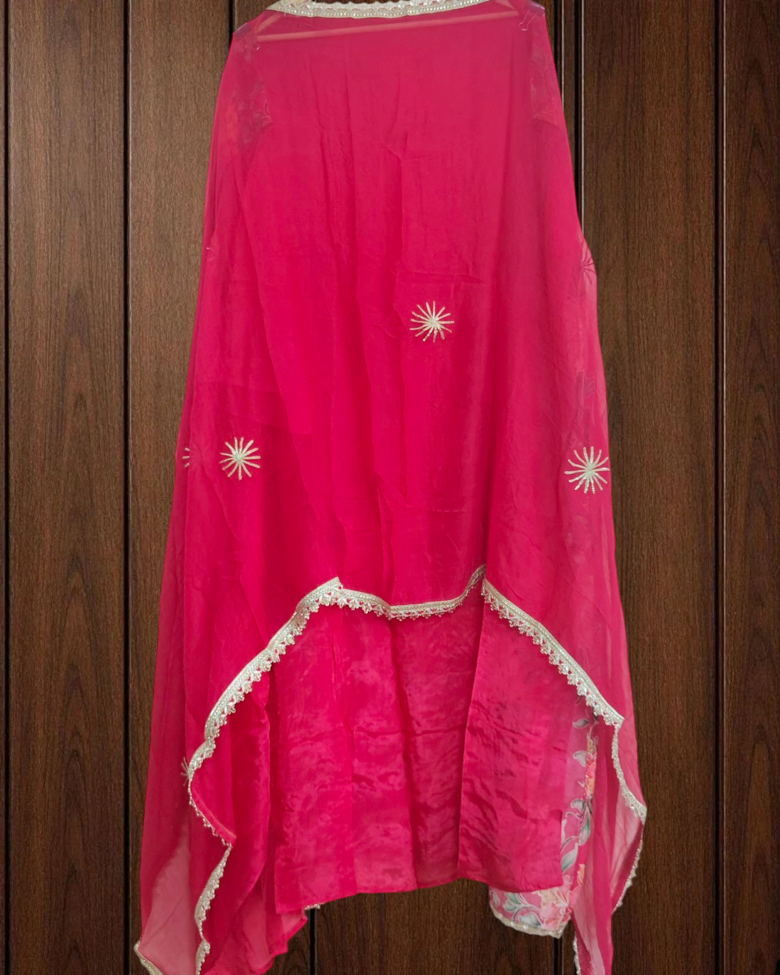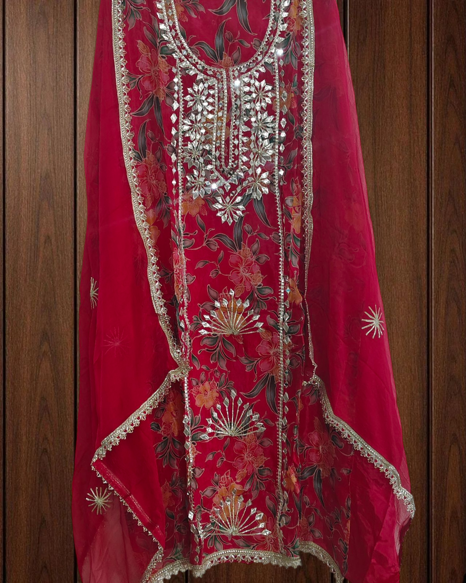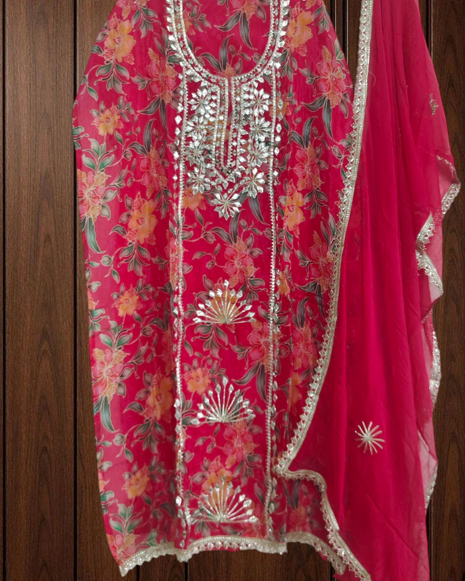 Drape yourself in elegance with this Glass Organza Digital Print Suit Set, adorned with all-over gotta work that adds a touch of festive sparkle. The chiffon dupatta features delicate gotta embroidery and a charming border, completing the look with grace. Paired with a soft rayon bottom, this unstitched ensemble is ideal for special occasions and celebrations, exuding effortless charm and sophistication.