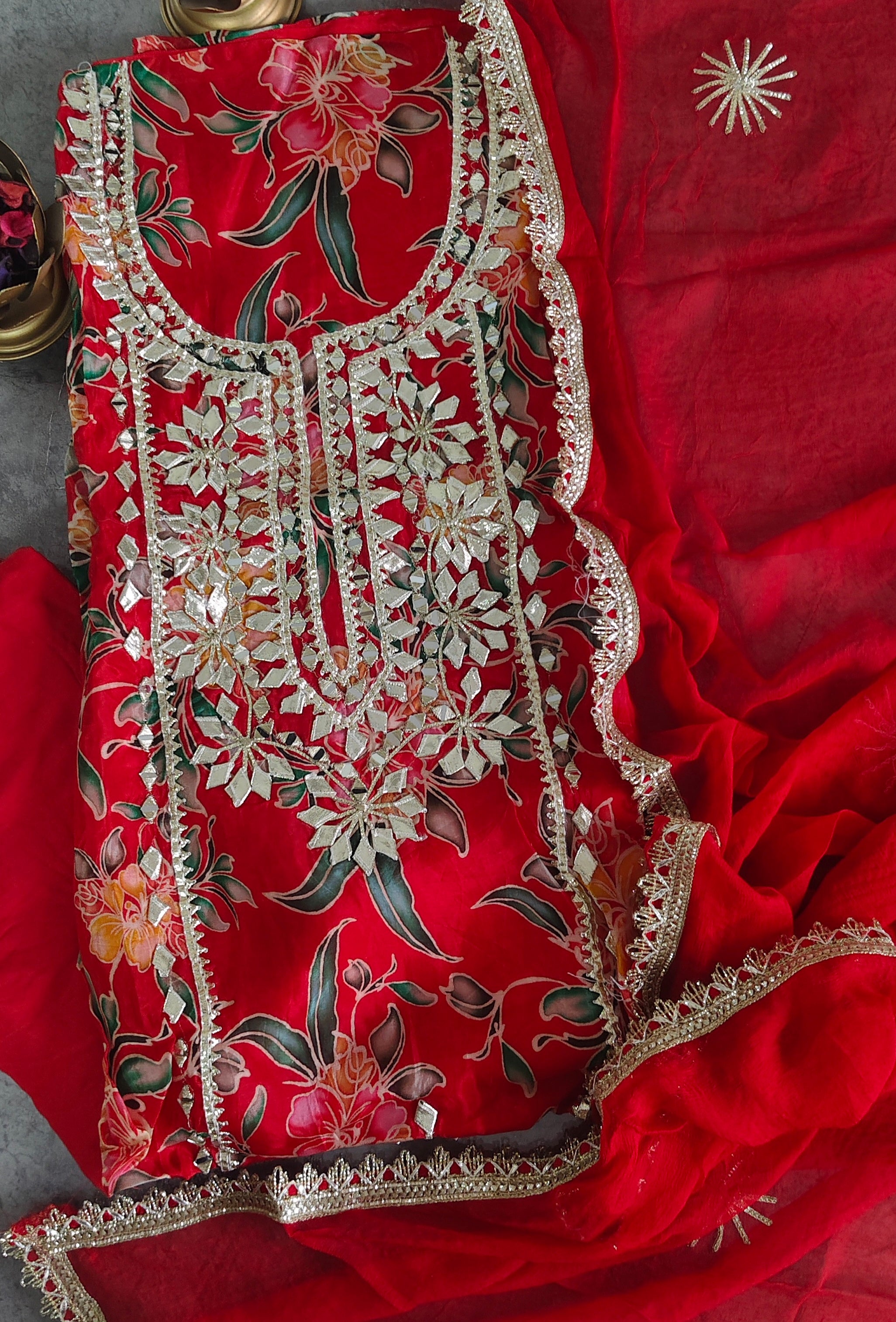 Drape yourself in elegance with this Glass Organza Digital Print Suit Set, adorned with all-over gotta work that adds a touch of festive sparkle. The chiffon dupatta features delicate gotta embroidery and a charming border, completing the look with grace. Paired with a soft rayon bottom, this unstitched ensemble is ideal for special occasions and celebrations, exuding effortless charm and sophistication.