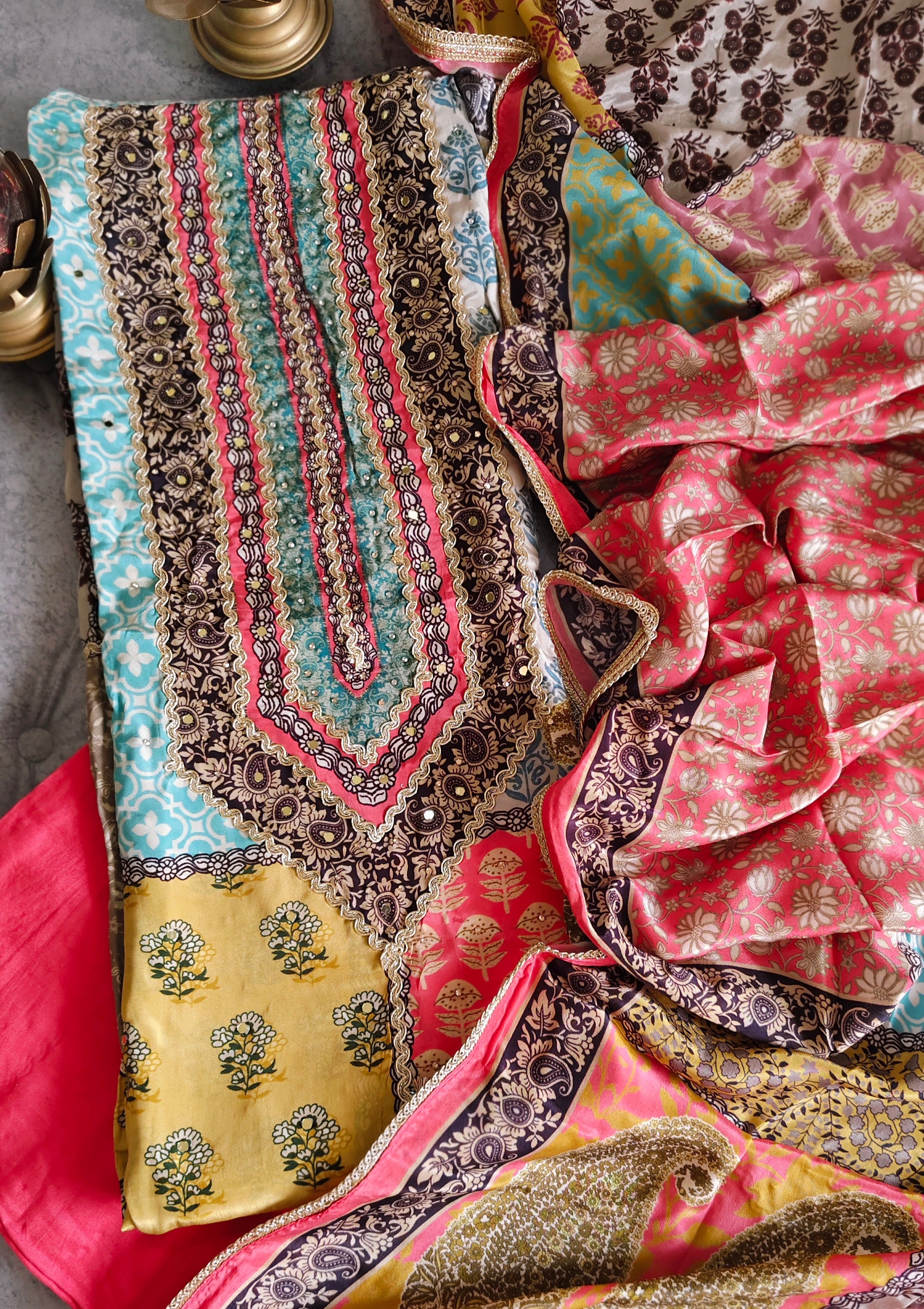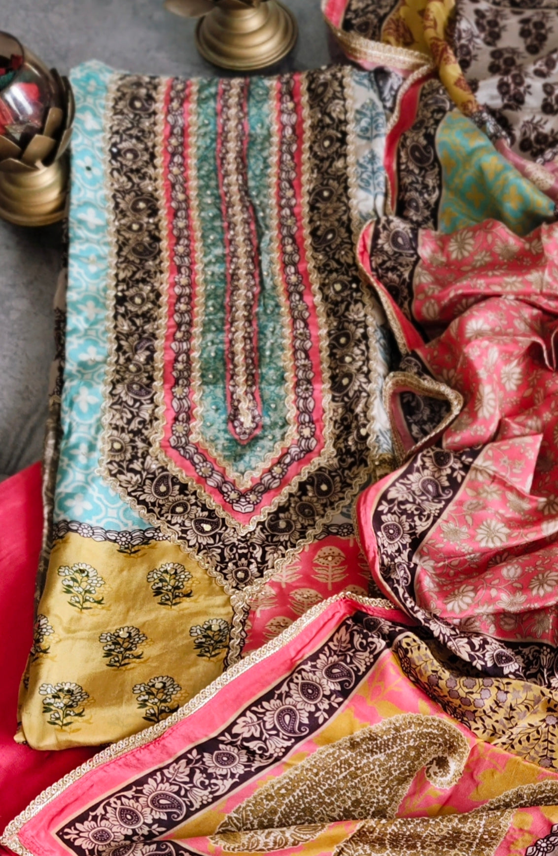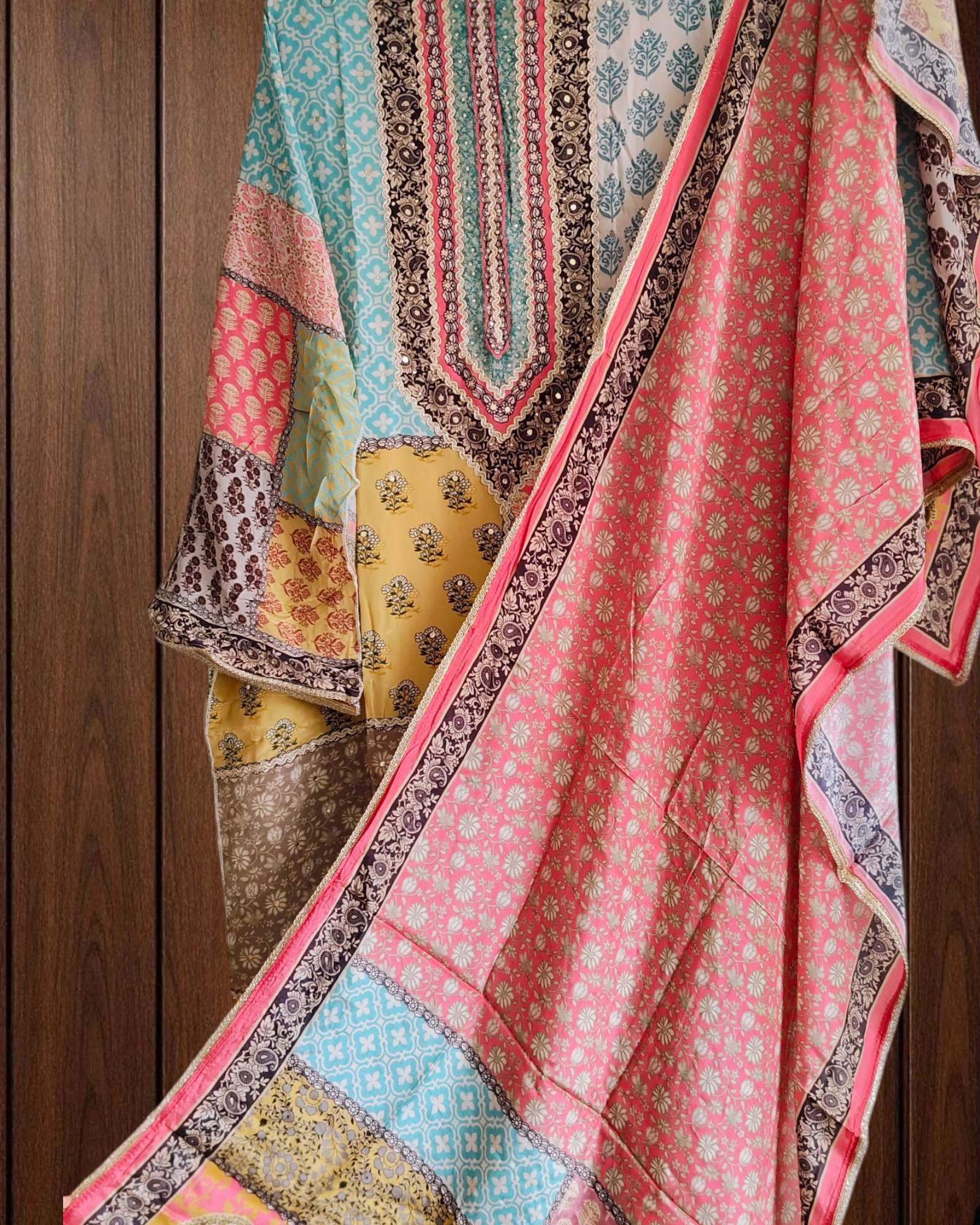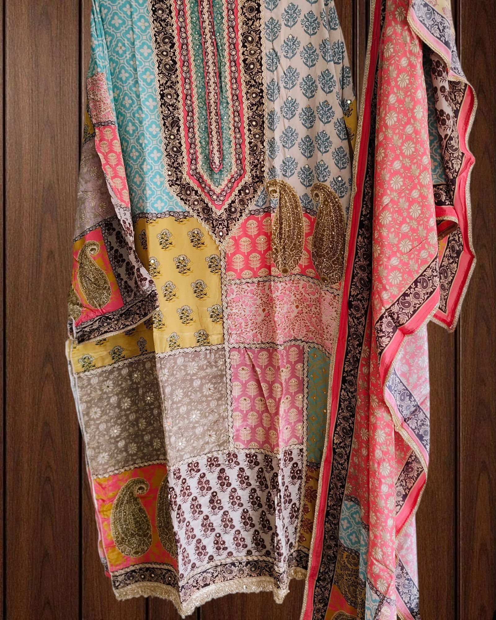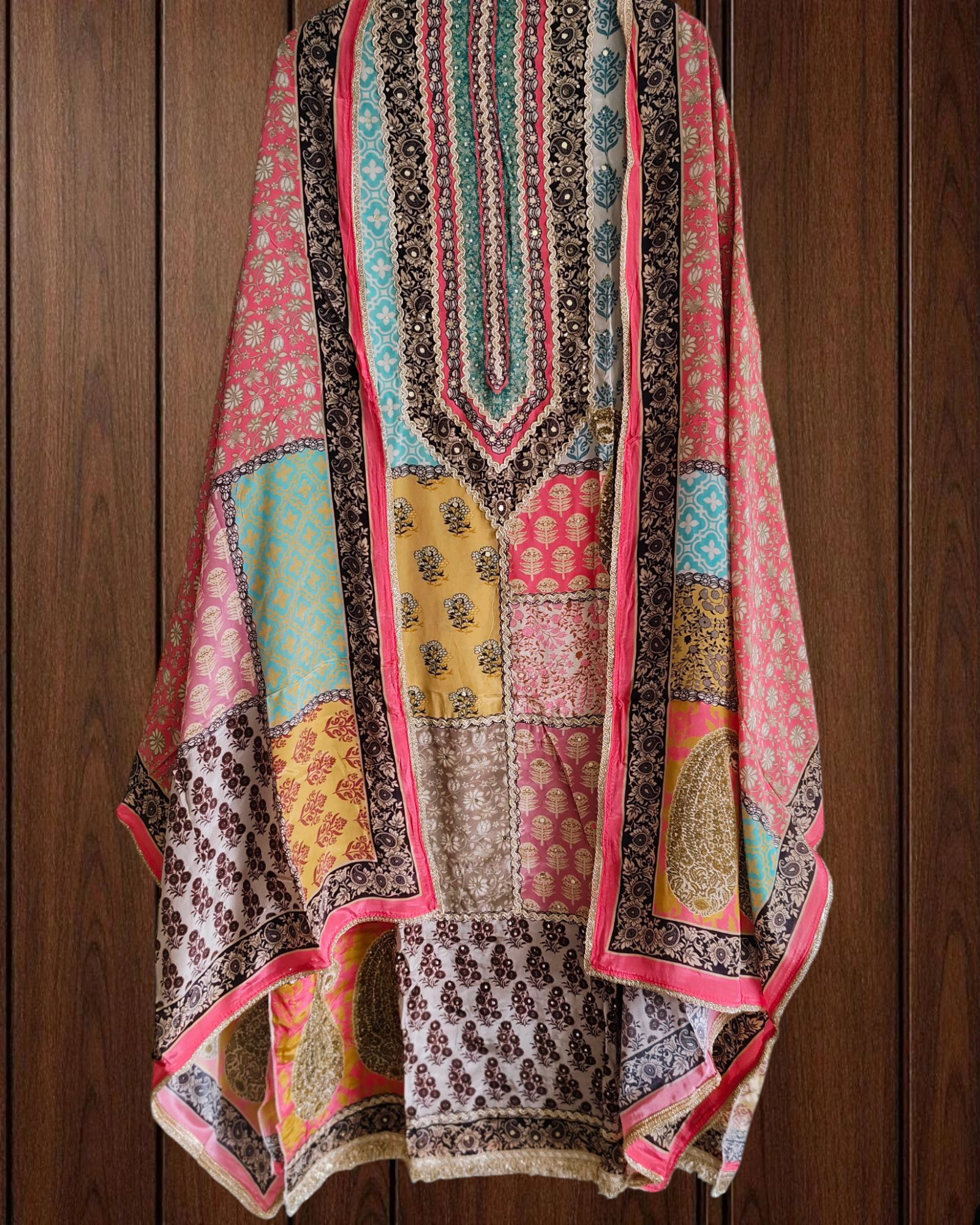 💫 This stunning Crepe suit beautifully blends traditional detailing with contemporary charm. The mirror work sparkles with every move, while the zari lacing adds an opulent finish. An elegant choice to elevate your festive and special occasion wardrobe.