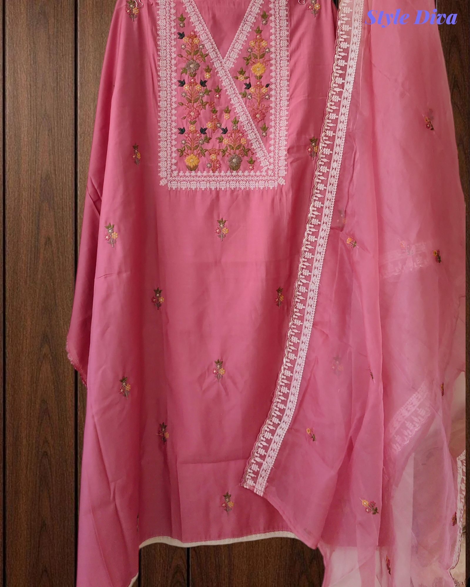 A graceful Modal un-stitched suit set featuring delicate Aari embroidery paired with a scalloped Organza dupatta. Designed for effortless elegance, this suit is perfect for semi-casual and festive occasions where comfort meets refined style.