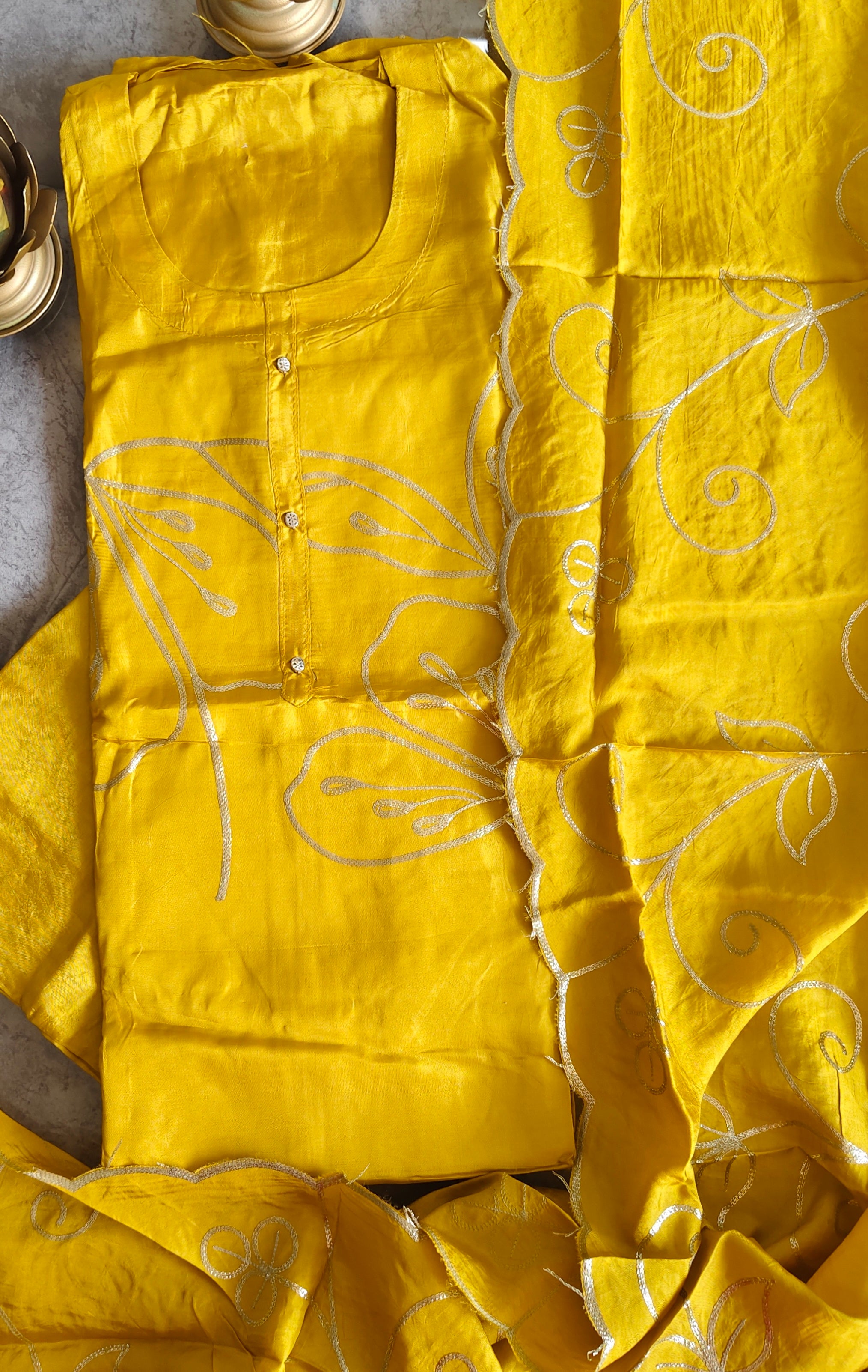 Add a touch of sophistication to your festive wardrobe with this Upara Silk Unstitched Suit Set. The kurta is beautifully detailed with traditional Pita embroidery, complemented by a scalloped-edge dupatta for a refined finish. Tailor it to perfection and let its luxurious silk texture elevate your party look.