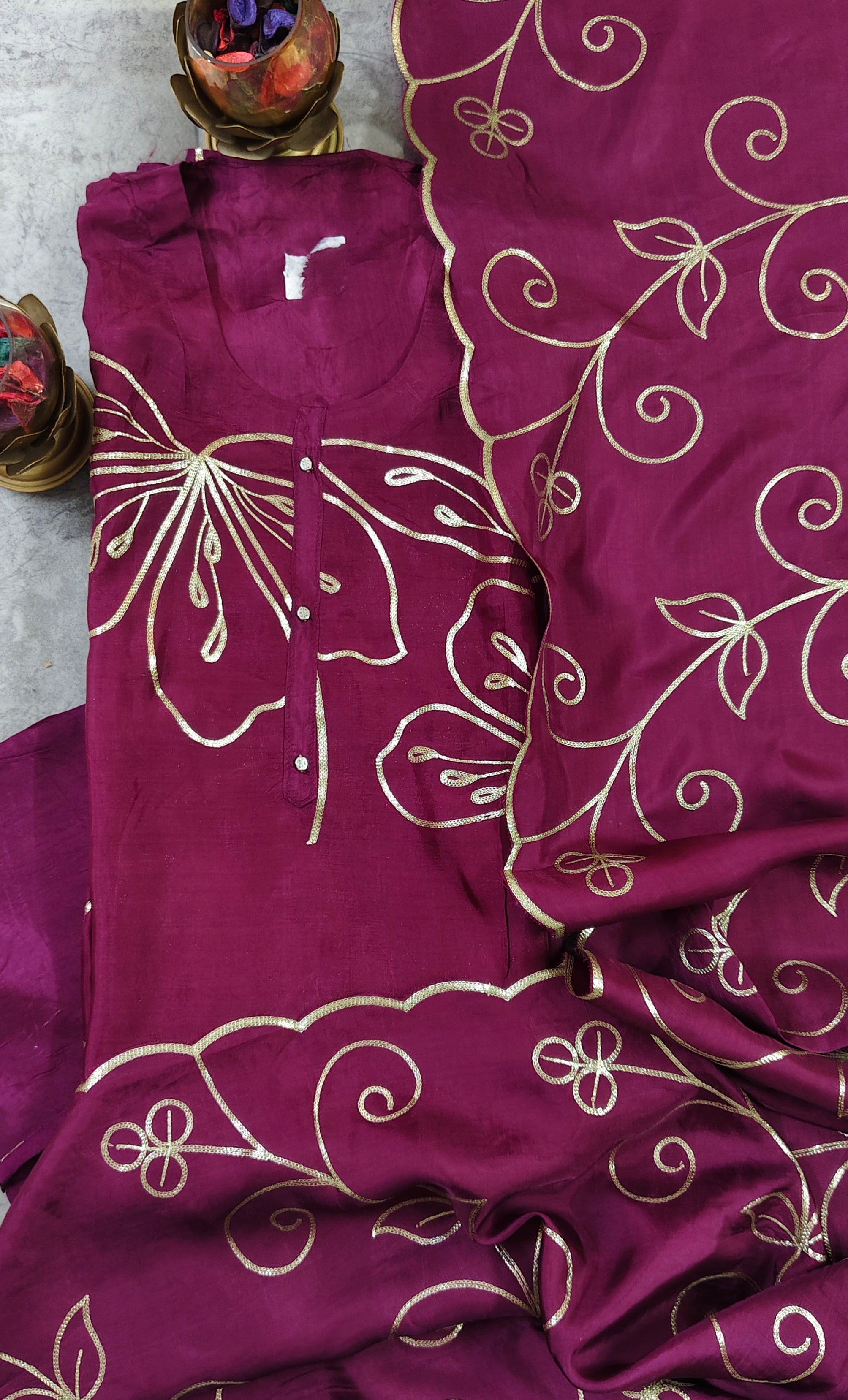 Add a touch of sophistication to your festive wardrobe with this Upara Silk Unstitched Suit Set. The kurta is beautifully detailed with traditional Pita embroidery, complemented by a scalloped-edge dupatta for a refined finish. Tailor it to perfection and let its luxurious silk texture elevate your party look.