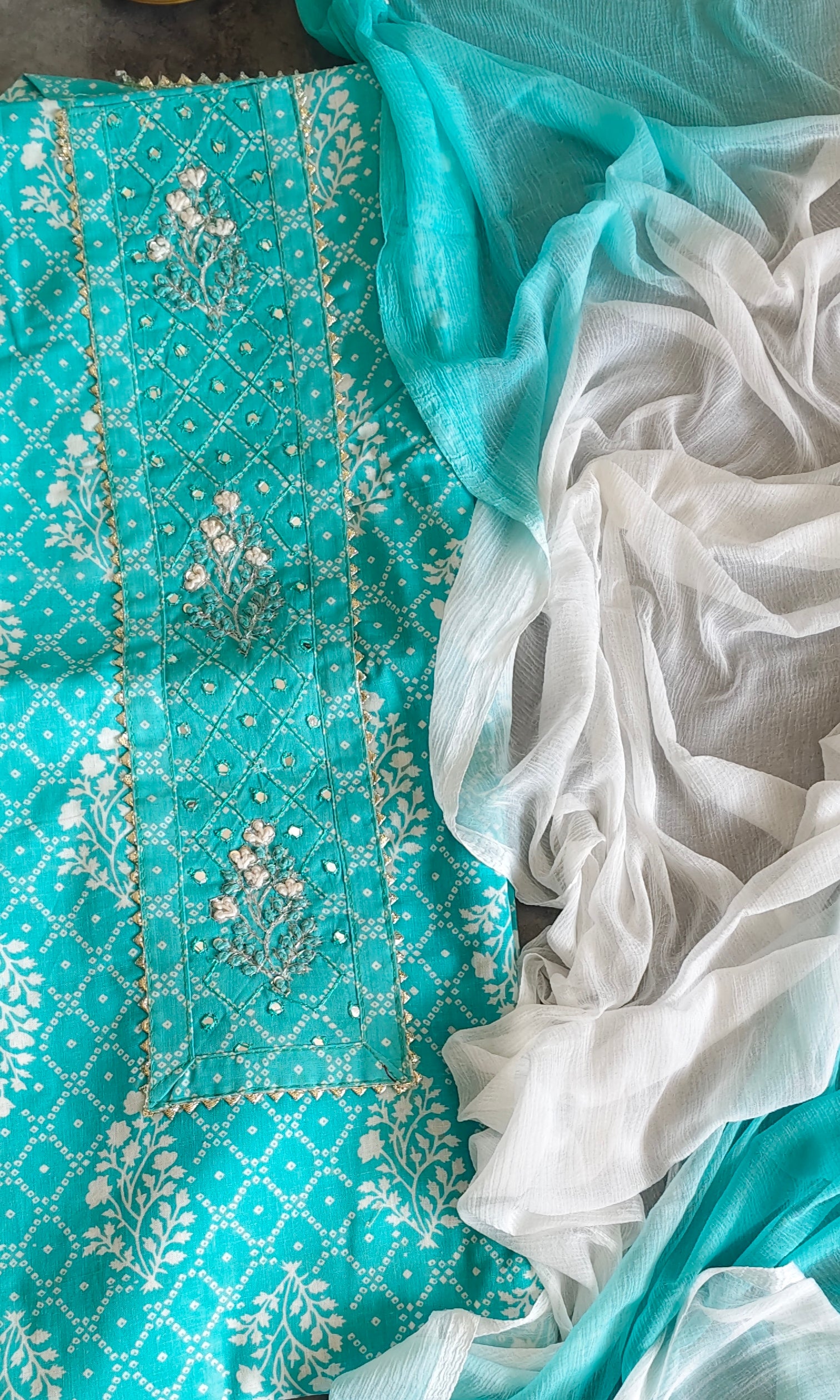 🌸 A perfect blend of comfort and charm, this cotton printed suit is accentuated with mirror and gotta detailing for a touch of festive sparkle. The chiffon dupatta with sequins adds an airy elegance, making it a versatile pick for casual outings or light occasions.