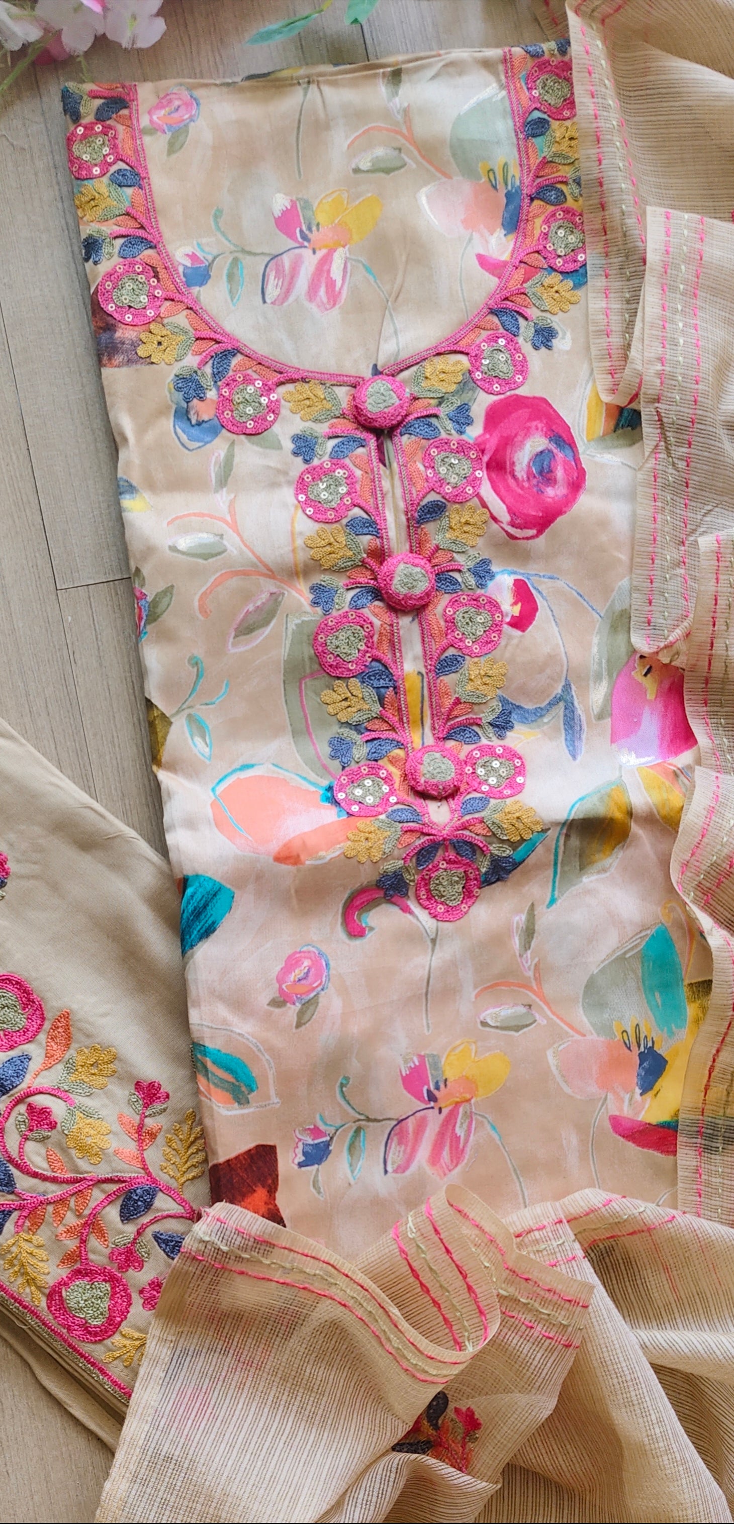 A graceful blend of comfort and tradition, this modal digital print suit is elevated with timeless Kashmiri embroidery. The soft modal kurta offers a smooth, breathable feel, beautifully complemented by a lightweight Kota dupatta detailed with fine embroidery. Paired with a rayon bottom fabric featuring coordinated Kashmiri work, this unstitched ensemble gives you the freedom to tailor it to your perfect fit. Ideal for festive gatherings and elegant day occasions, it reflects refined craftsmanship with effortless sophistication.