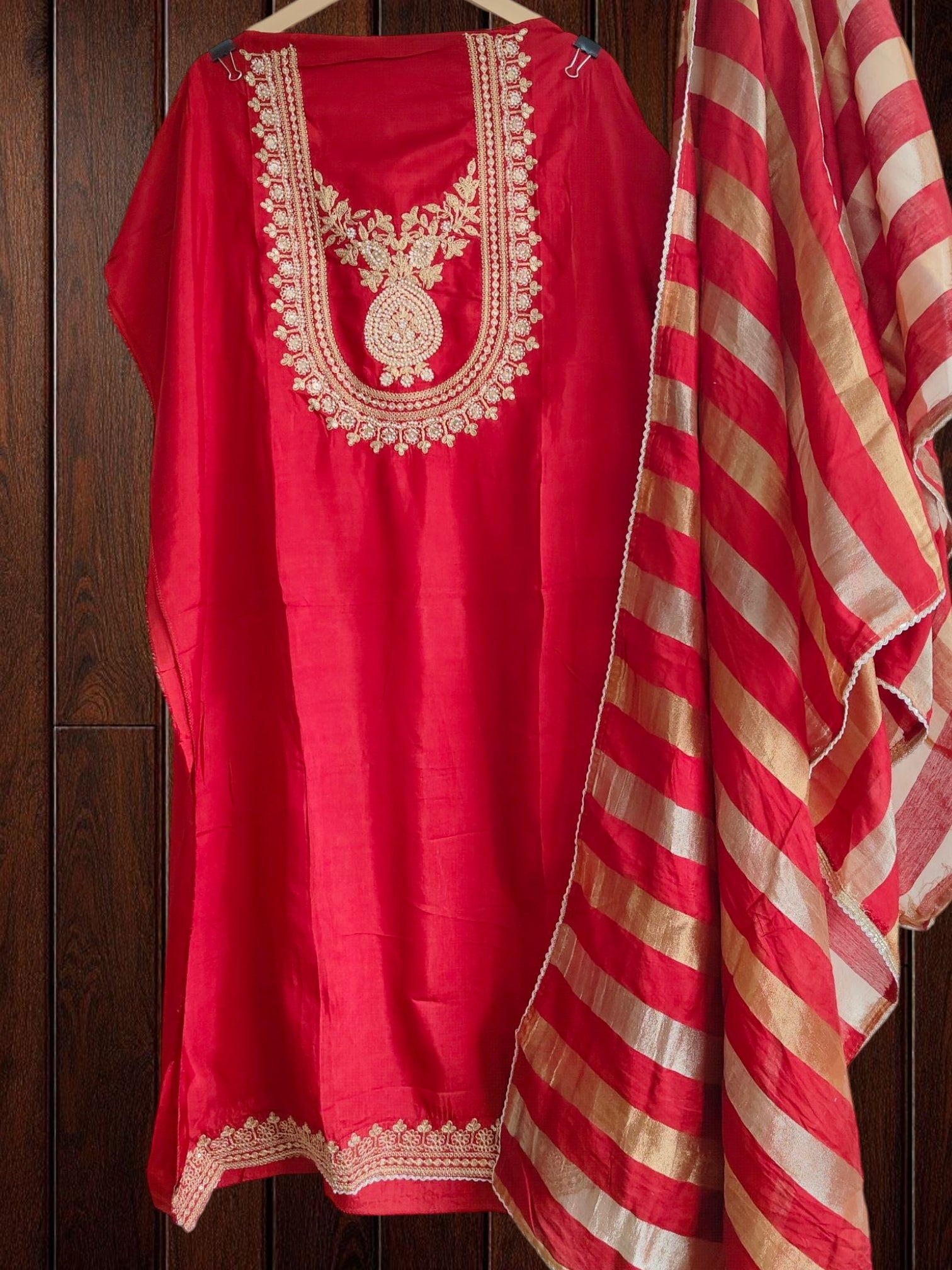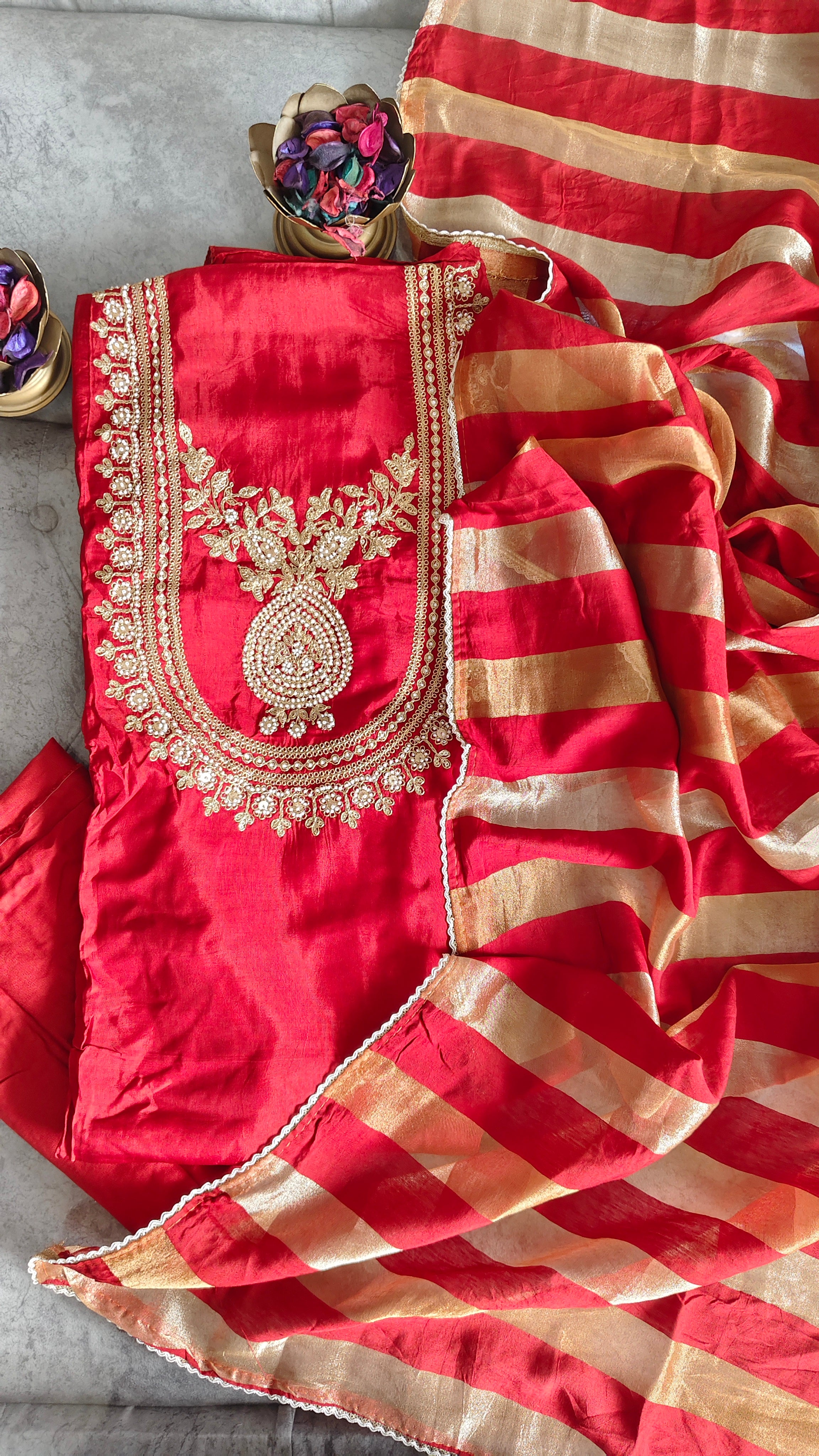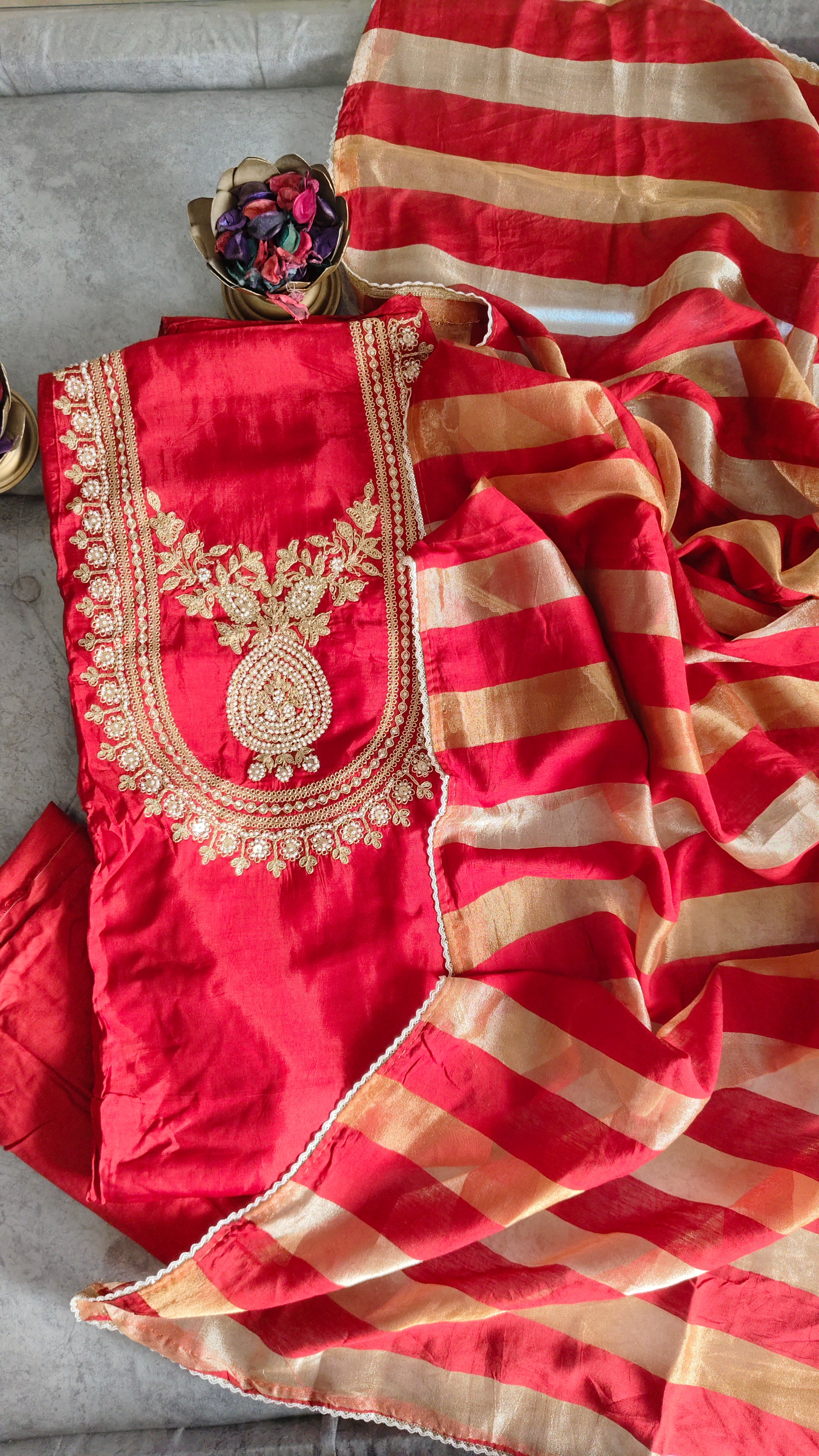 Experience timeless elegance with this Maheshwari Silk Unstitched Suit Set, crafted for festive and semi-formal occasions. The rich Zari embroidery on the kurta and the Banarasi-bordered dupatta add a regal touch, while the rayon bottom fabric ensures comfort with style. Perfect for celebrations, traditional gatherings, or gifting.