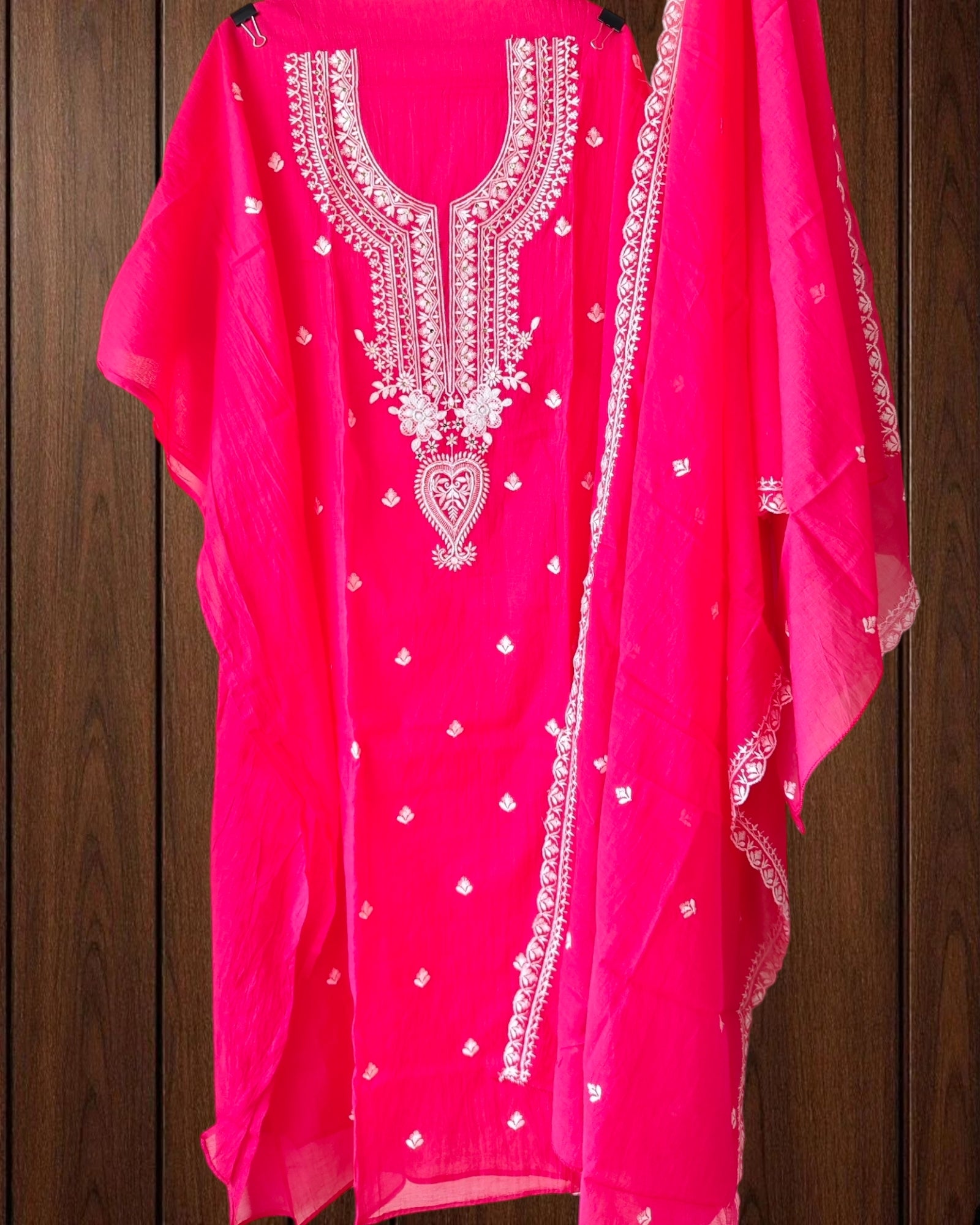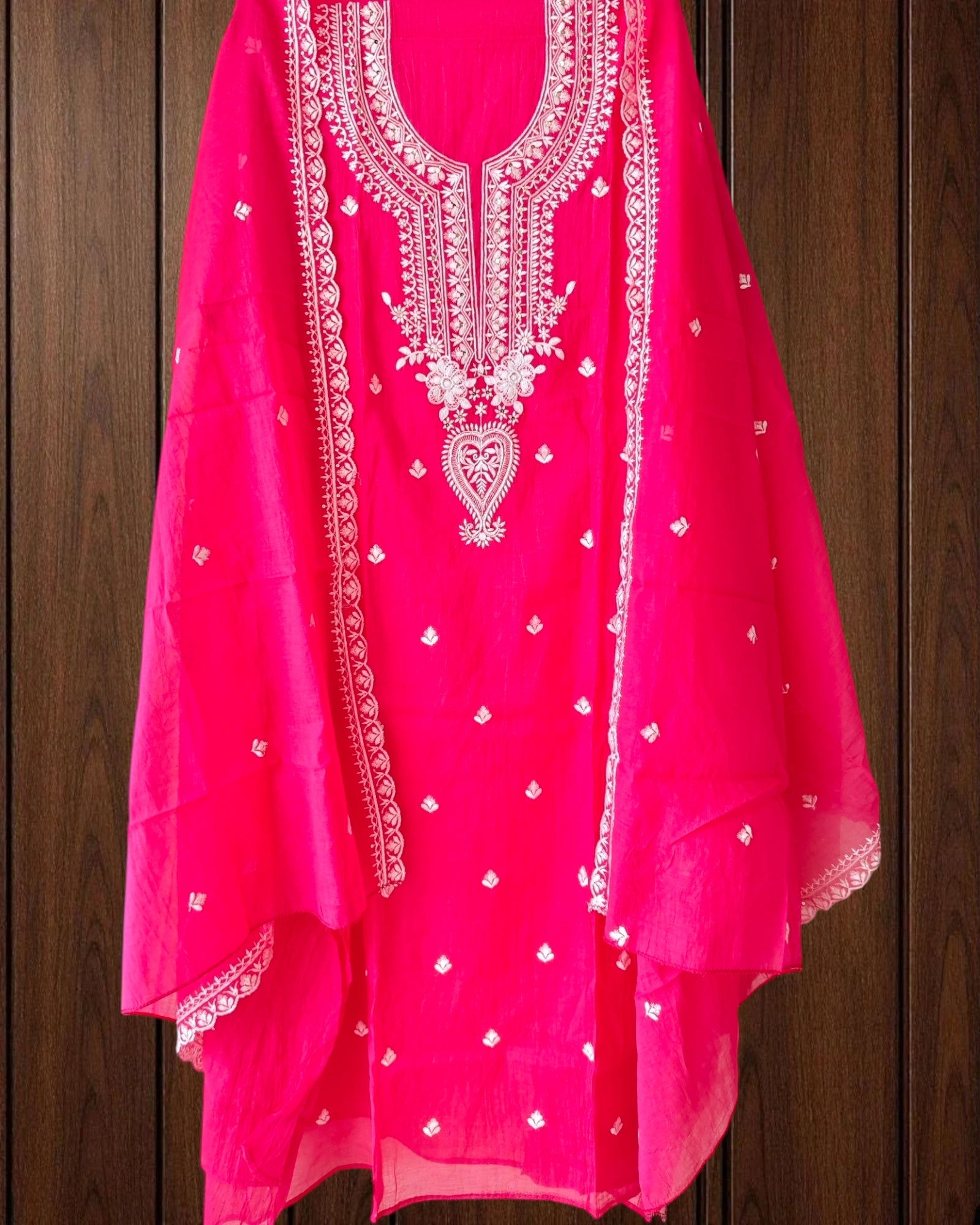 Crafted in soft and elegant Mul Chanderi, this unstitched suit set offers a beautiful blend of traditional pita work and delicate thread embroidery. The matching dupatta enhances the ensemble with coordinated artistry, creating a graceful and refined look. Paired with a comfortable rayon bottom, this set is perfect for festive gatherings, poojas, and semi-traditional occasions.