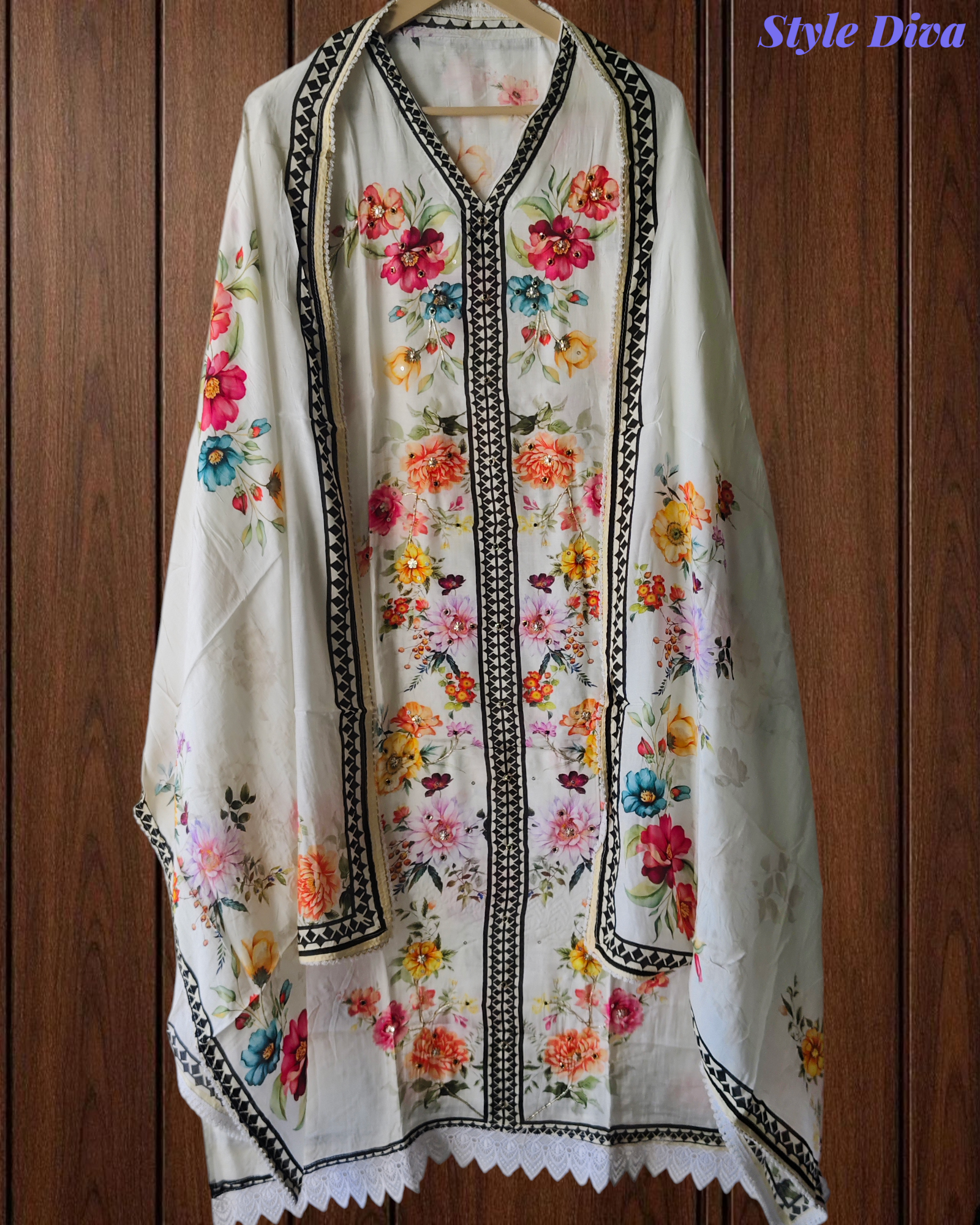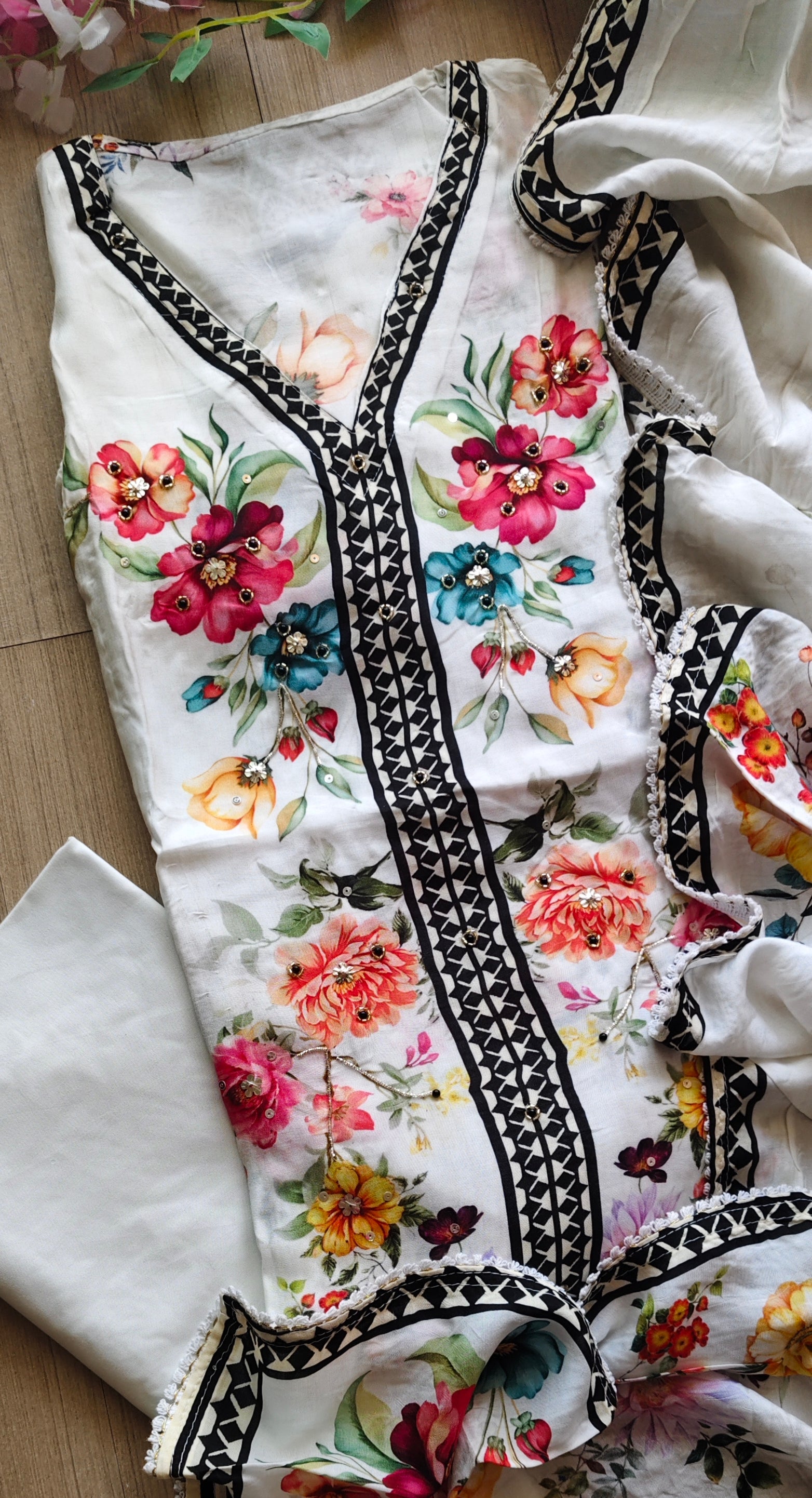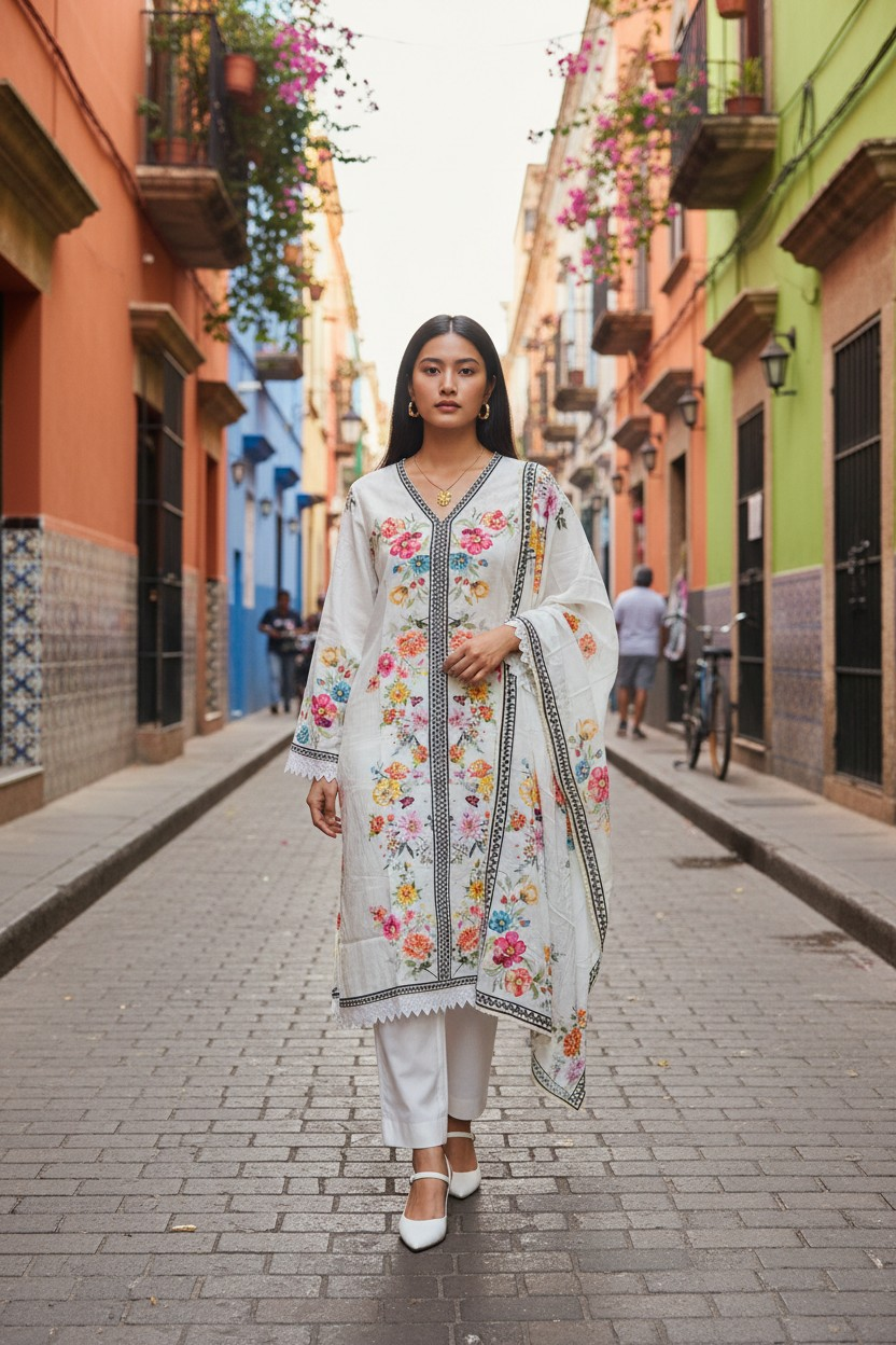 A graceful blend of soft muslin and refined detailing, this semi-stitched suit is designed to make a subtle yet striking statement. The digitally printed kurta is elevated with delicate crochet lacing and elegant sequence cut-dana highlights, adding just the right touch of shimmer. Paired with a coordinated muslin dupatta and comfortable rayon bottom fabric, this ensemble is perfect for festive gatherings, small celebrations, and elegant day functions. Style it effortlessly and let the detailing do the talking.