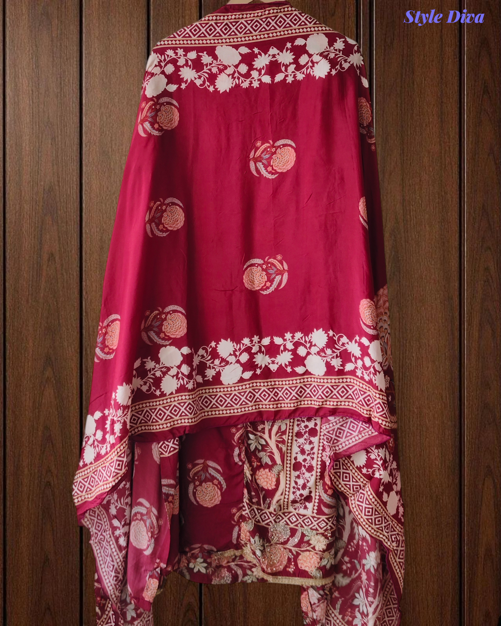 • Kurta: Muslin digital printed kurta embellished with overall zari embroidery and elegant Swarovski work for a rich festive appeal