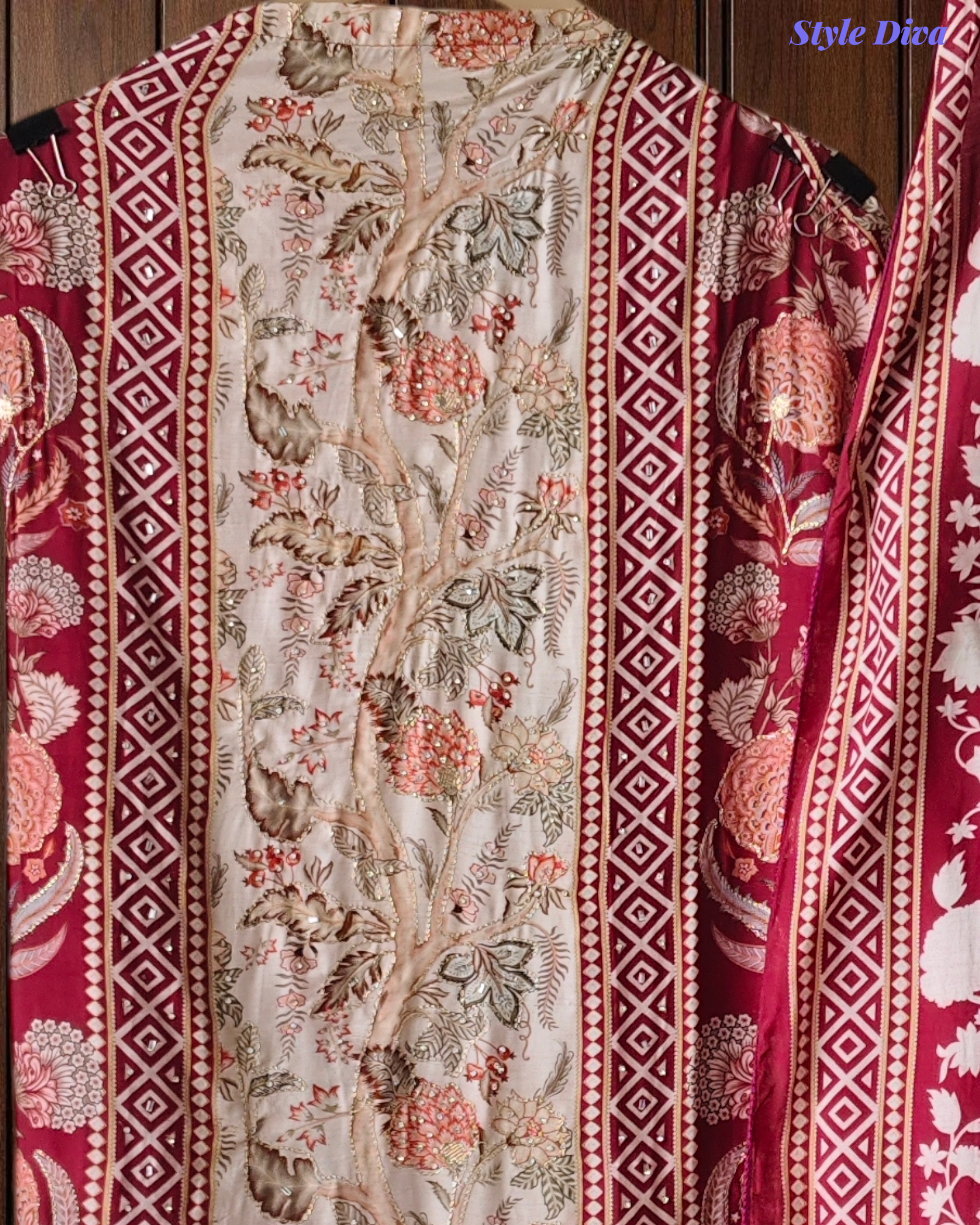 This muslin un-stitched suit features a beautifully digital printed kurta enhanced with intricate zari embroidery and shimmering Swarovski work. Paired with a matching muslin dupatta and rayon bottom, it is an elegant choice for festive celebrations and party occasions.