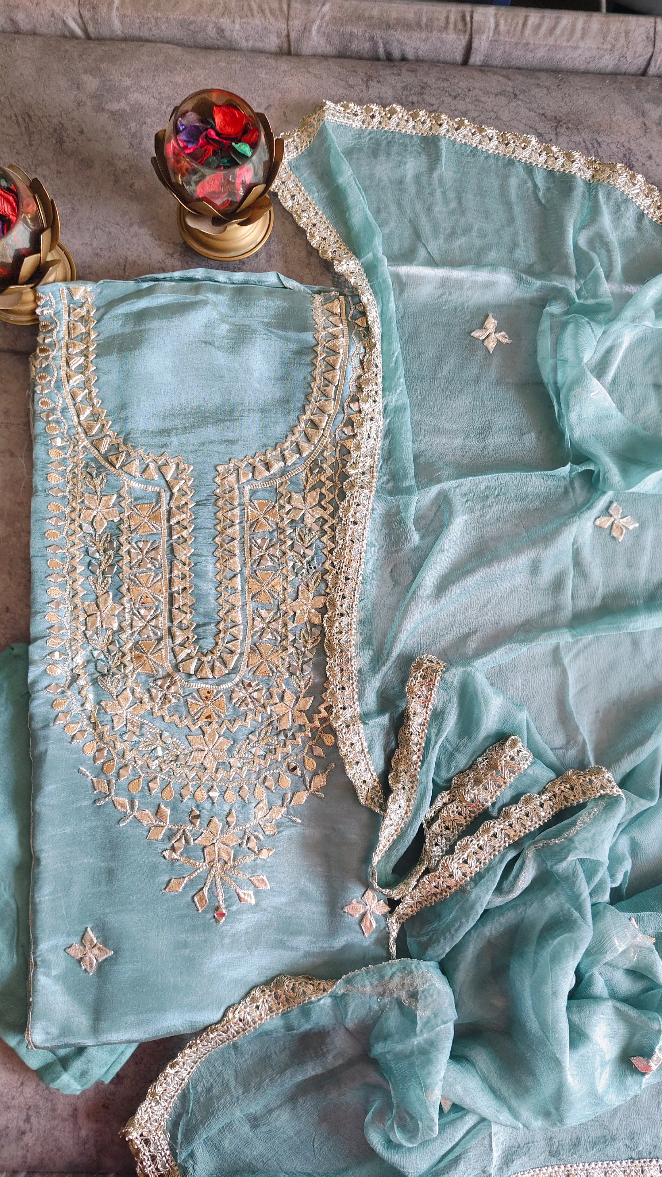 Opulent Elegance Shimmer Tissue Unstitched Suit with Gotta Detailing