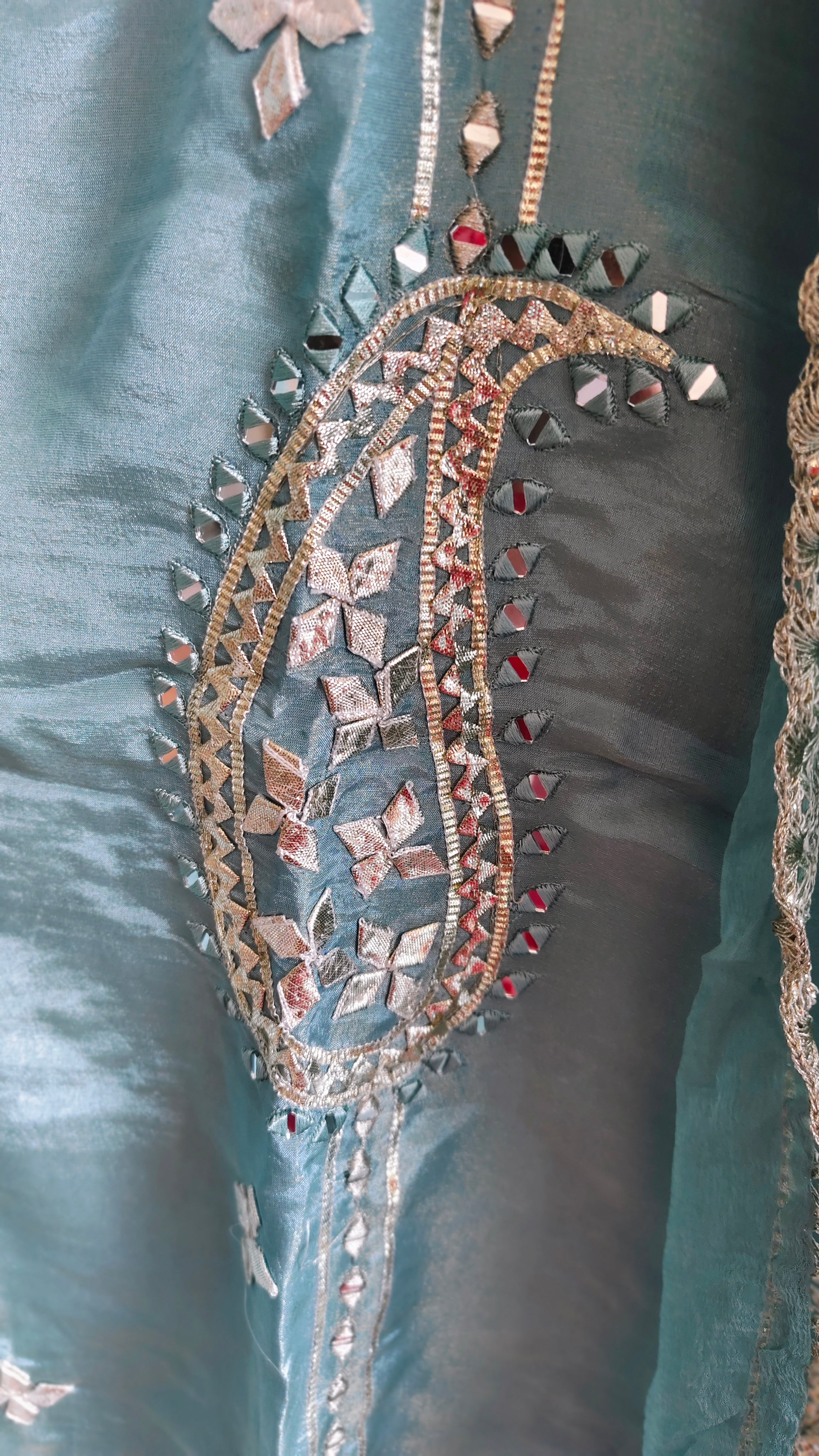 • Kurta: Elegant Shimmer Tissue Kurta adorned with traditional Gotta Work