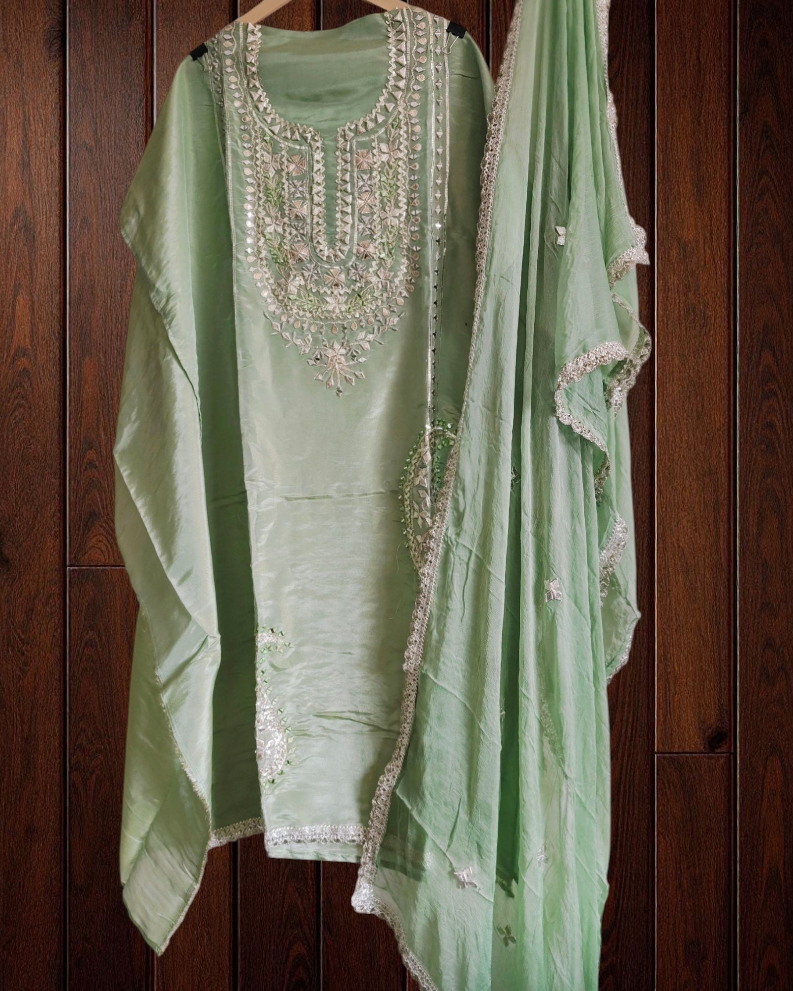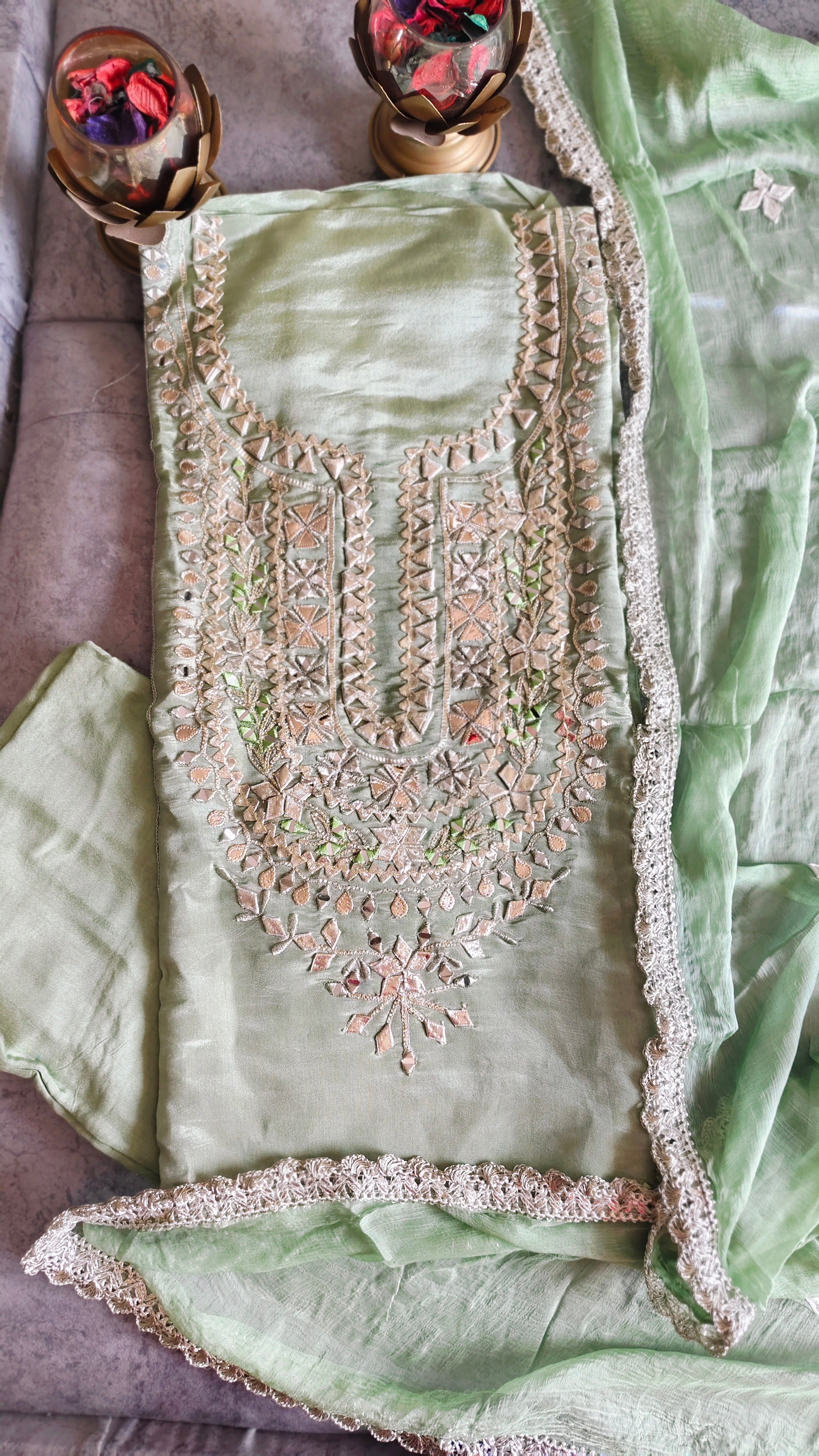 ✨ Add a touch of timeless grace to your wardrobe with this Shimmer Tissue Suit Set. The delicate gotta work on the kurta and dupatta enhances its festive appeal, while the soft rayon bottom ensures comfort without compromising on style. A truly classic ensemble for unforgettable occasions!