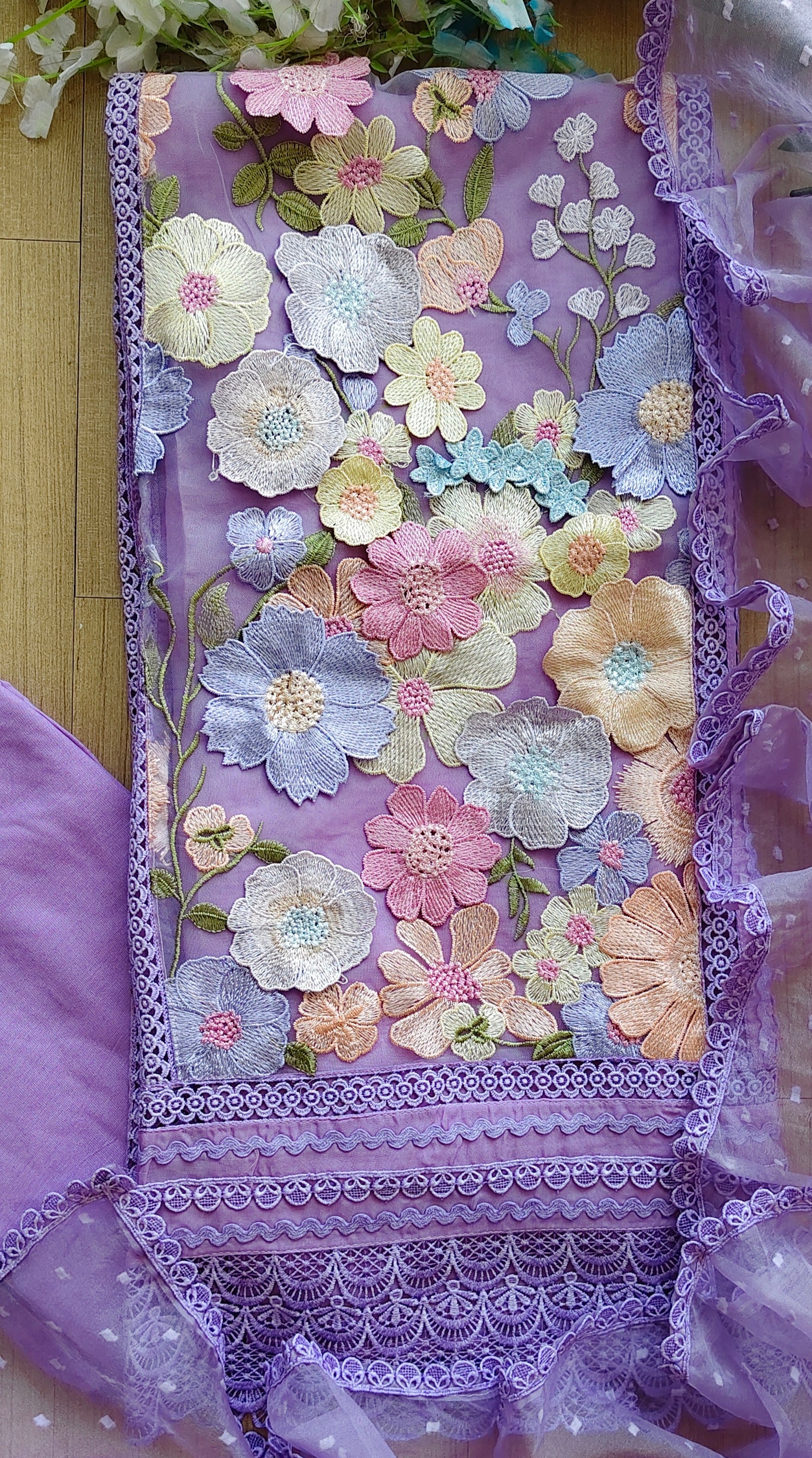 Organza 3D Embroidery Patch Work Unstitched Suit with Embroidered Dupatta