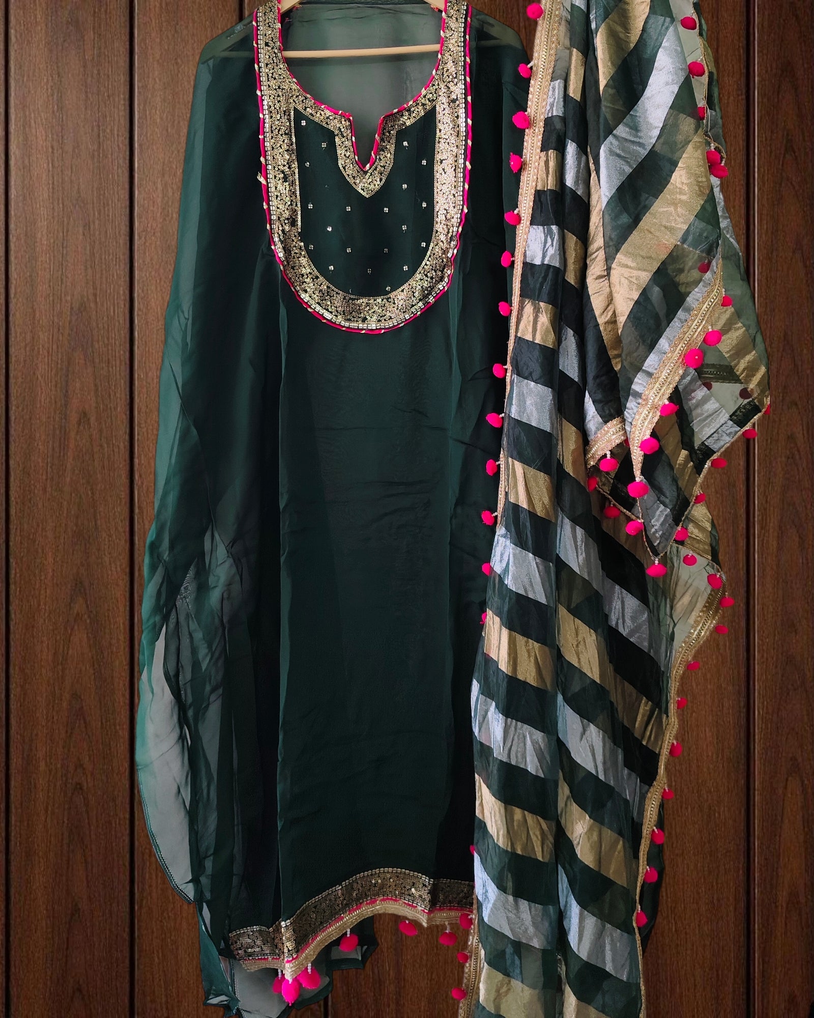 This unstitched suit set features a chic Organza kurta adorned with sparkling sequence work, paired with a tissue dupatta highlighted by cute pom-pom borders. The look is elegant yet youthful, making it perfect for parties and special occasions. Soft rayon bottom fabric adds comfort to your style.