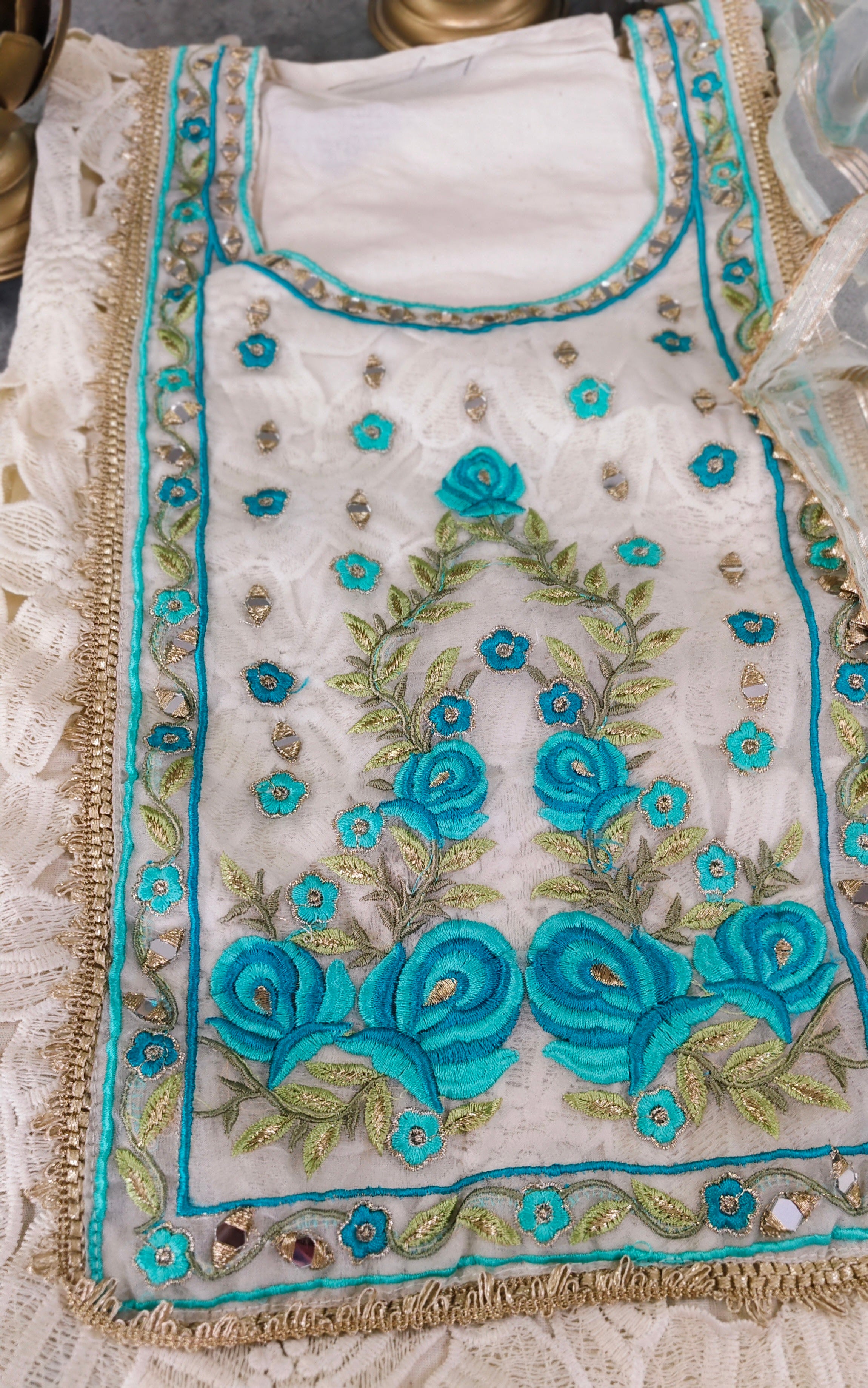 Bring effortless grace to your wardrobe with this semi-stitched Pakistani style suit set. Crafted from breathable self-design cotton, the kurta is enhanced with refined crochet lace detailing for a soft, feminine look. Paired with a matching net dupatta with elegant lacework and a comfortable cotton bottom, this ensemble is ideal for day functions, casual outings, or understated festive occasions.