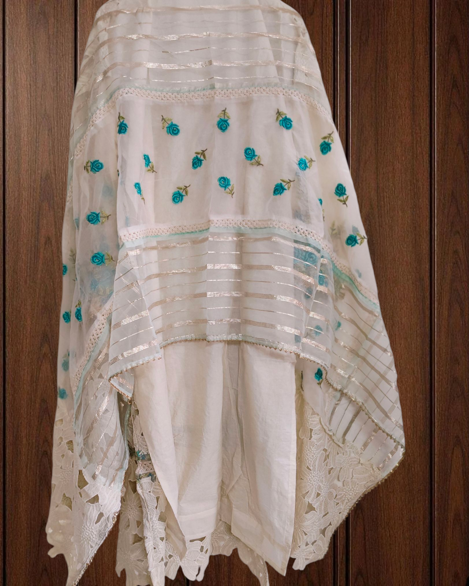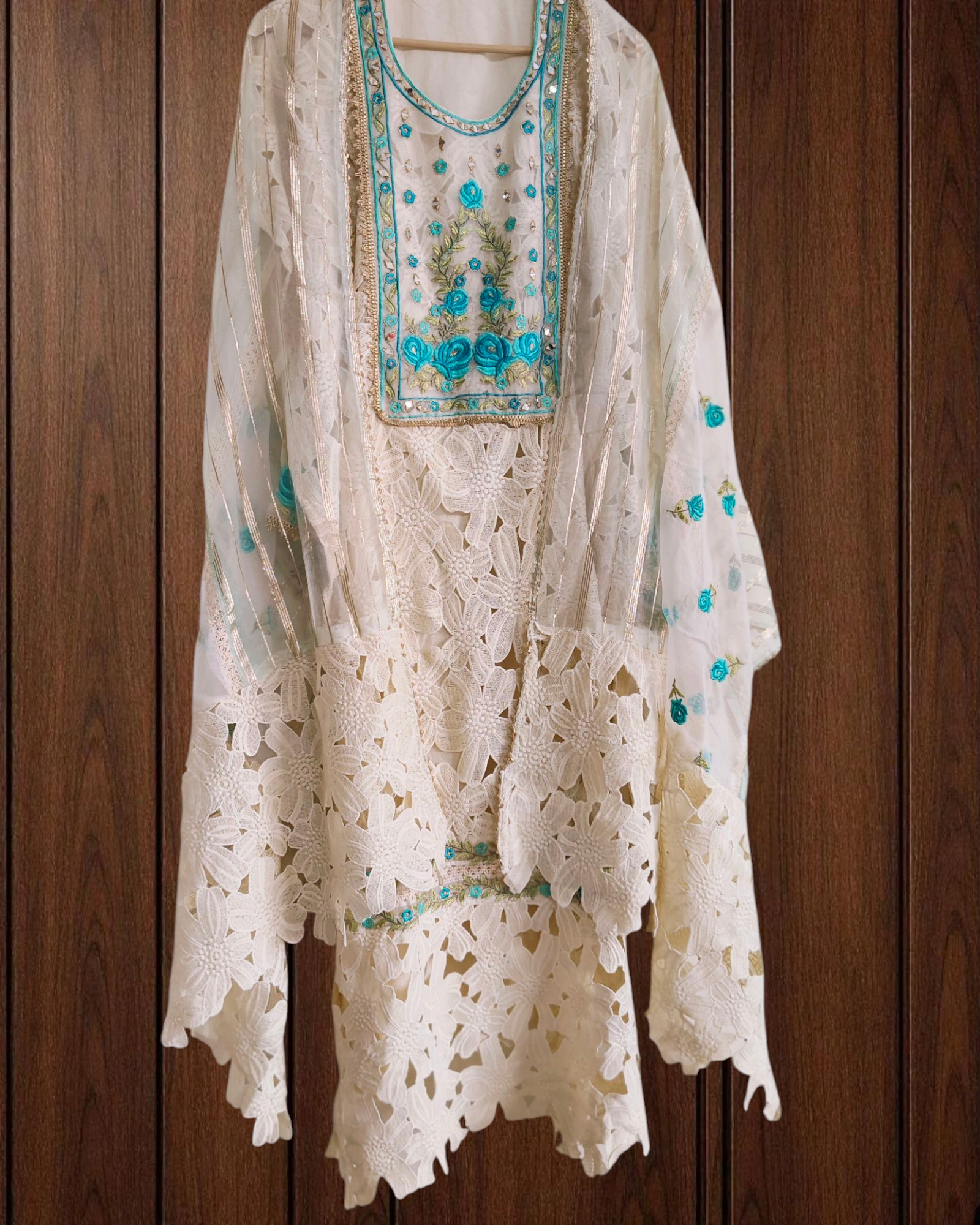 Work: Intricate Crochet Lacing on Kurta and Dupatta