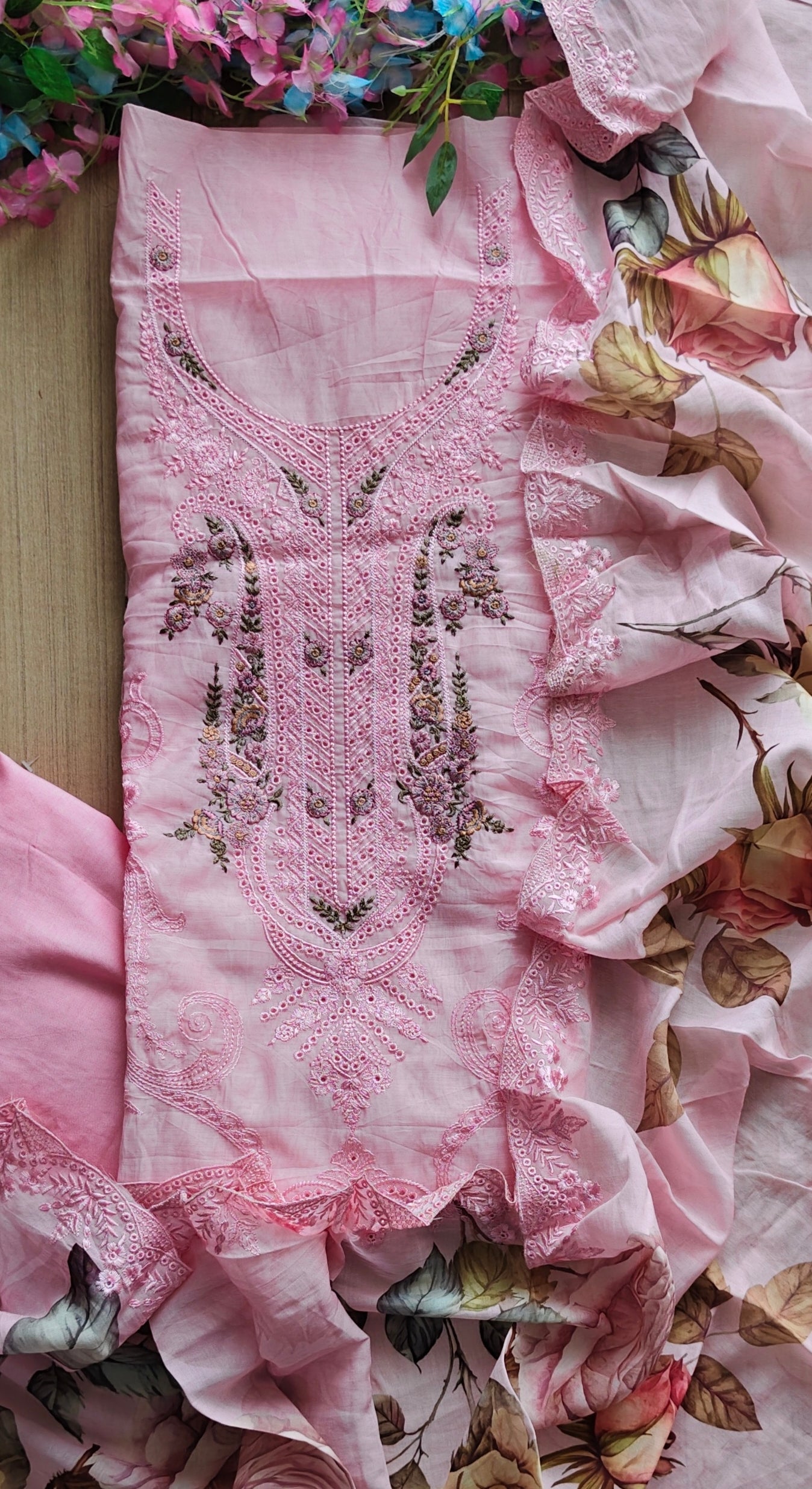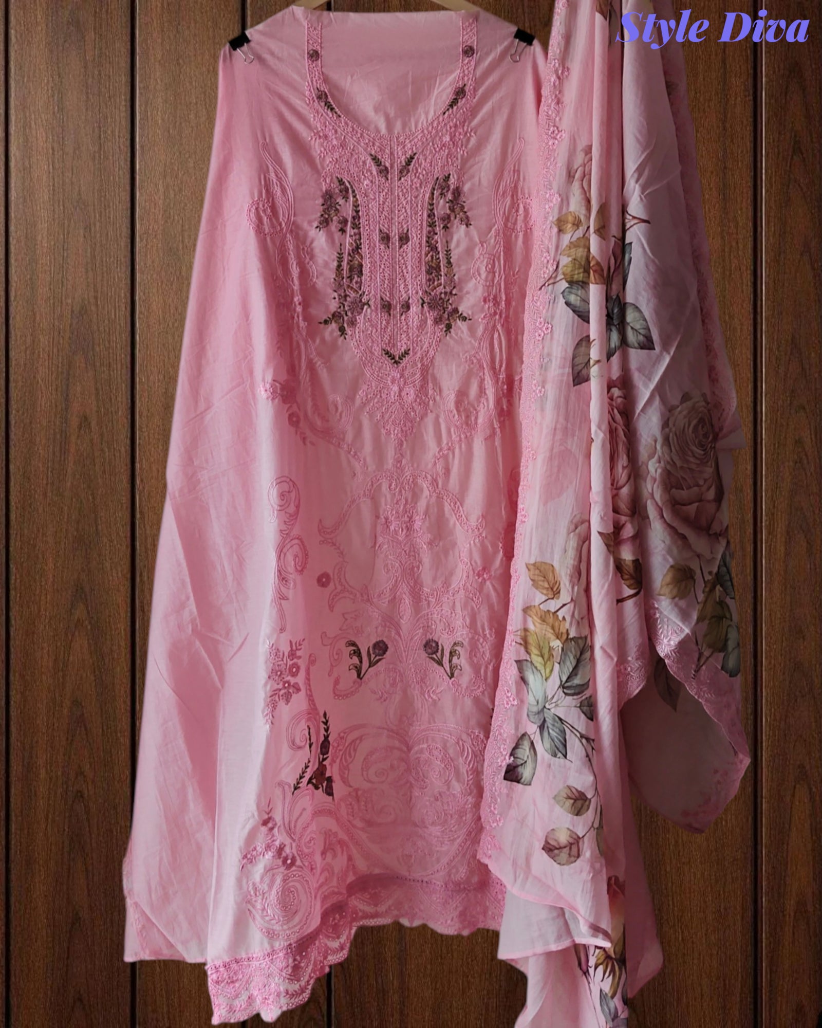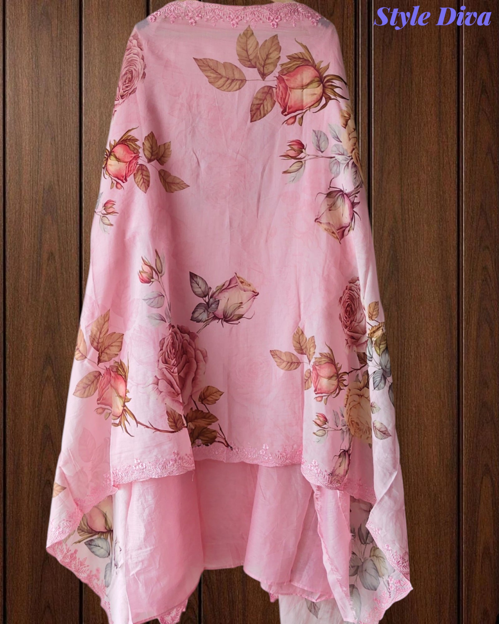 A graceful Pakistani style un-stitched suit set designed in premium mul chanderi fabric, featuring exquisite cut work embroidery and crochet lacing for a refined festive look. Paired with a beautifully printed dupatta with scalloped embroidered borders, this 3-piece set is perfect for elegant daywear, festive gatherings, and special occasions.