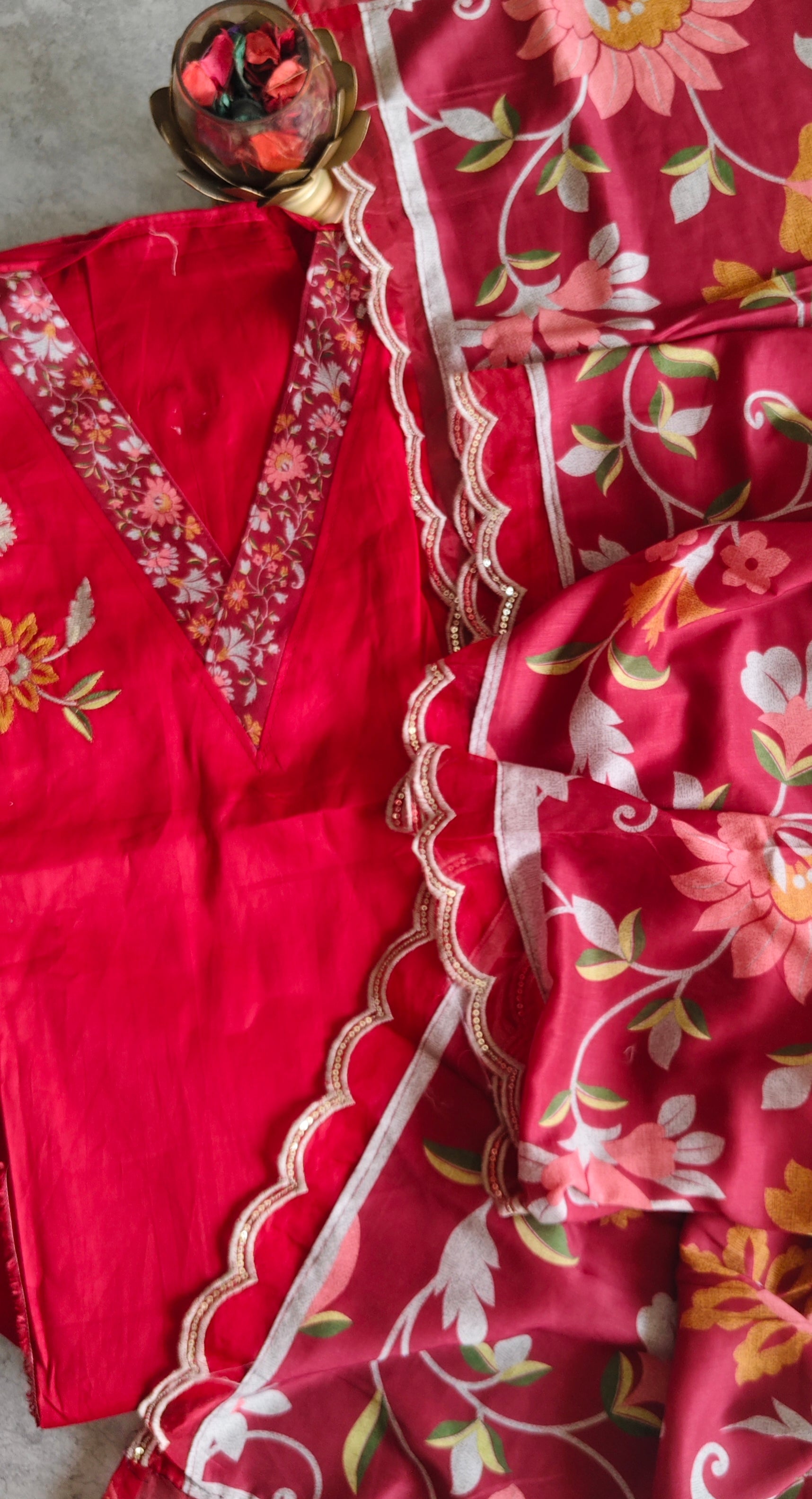 Embrace timeless elegance with this Jaam Cotton Embroidered Suit, featuring delicate embroidery enhanced with zari highlights that add a soft shimmer. The Muslin Digital Print Dupatta with an Organza Sequence Border exudes sophistication, creating a perfect blend of comfort, style, and grace — ideal for elevating your everyday look with subtle luxury.