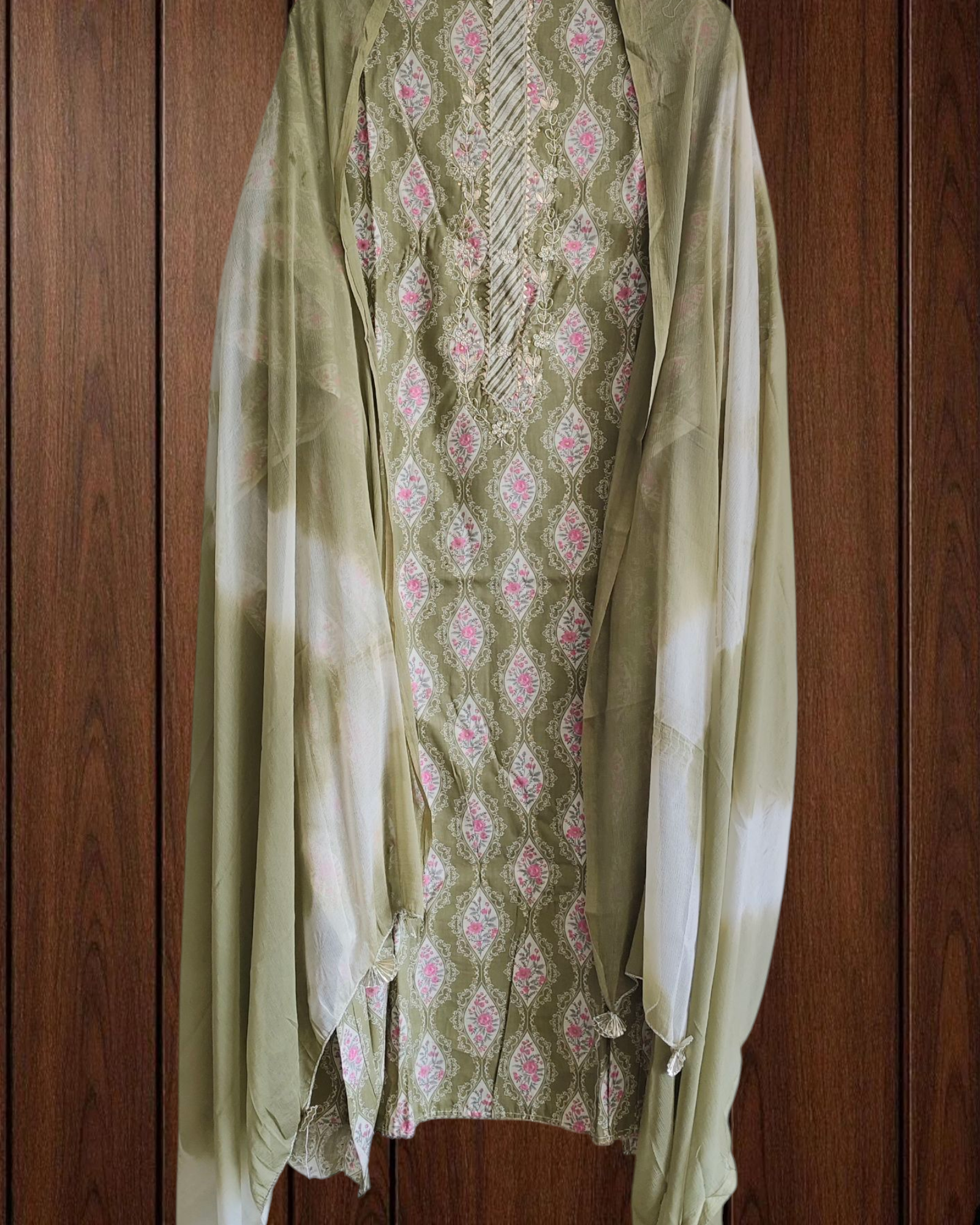 🌸 A graceful blend of comfort and charm, this cotton printed suit is adorned with traditional gotta hand-work, adding a festive shimmer to everyday wear. The dual-tone chiffon dupatta completes the look with breezy elegance, making it a versatile choice for both casual outings and light occasions.