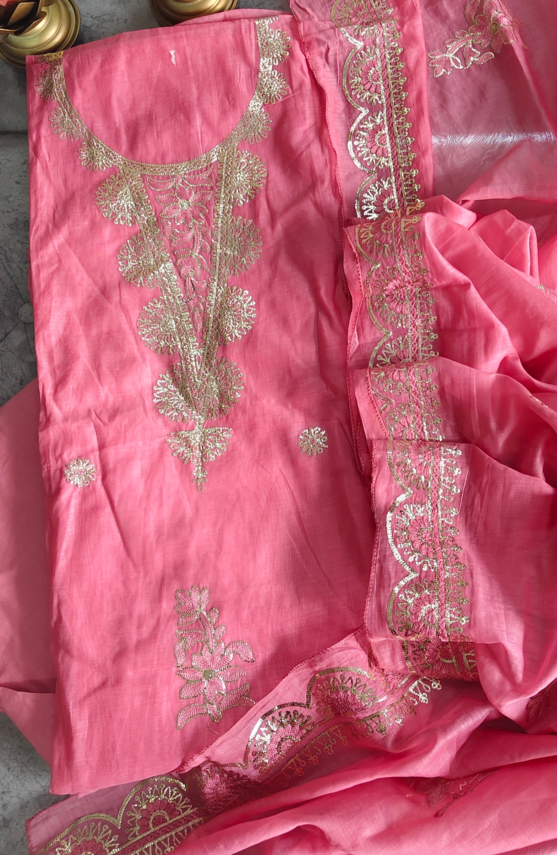 Elegant Mul Chanderi Un-Stitched Suit with Pita & Thread Embroidery Detailing