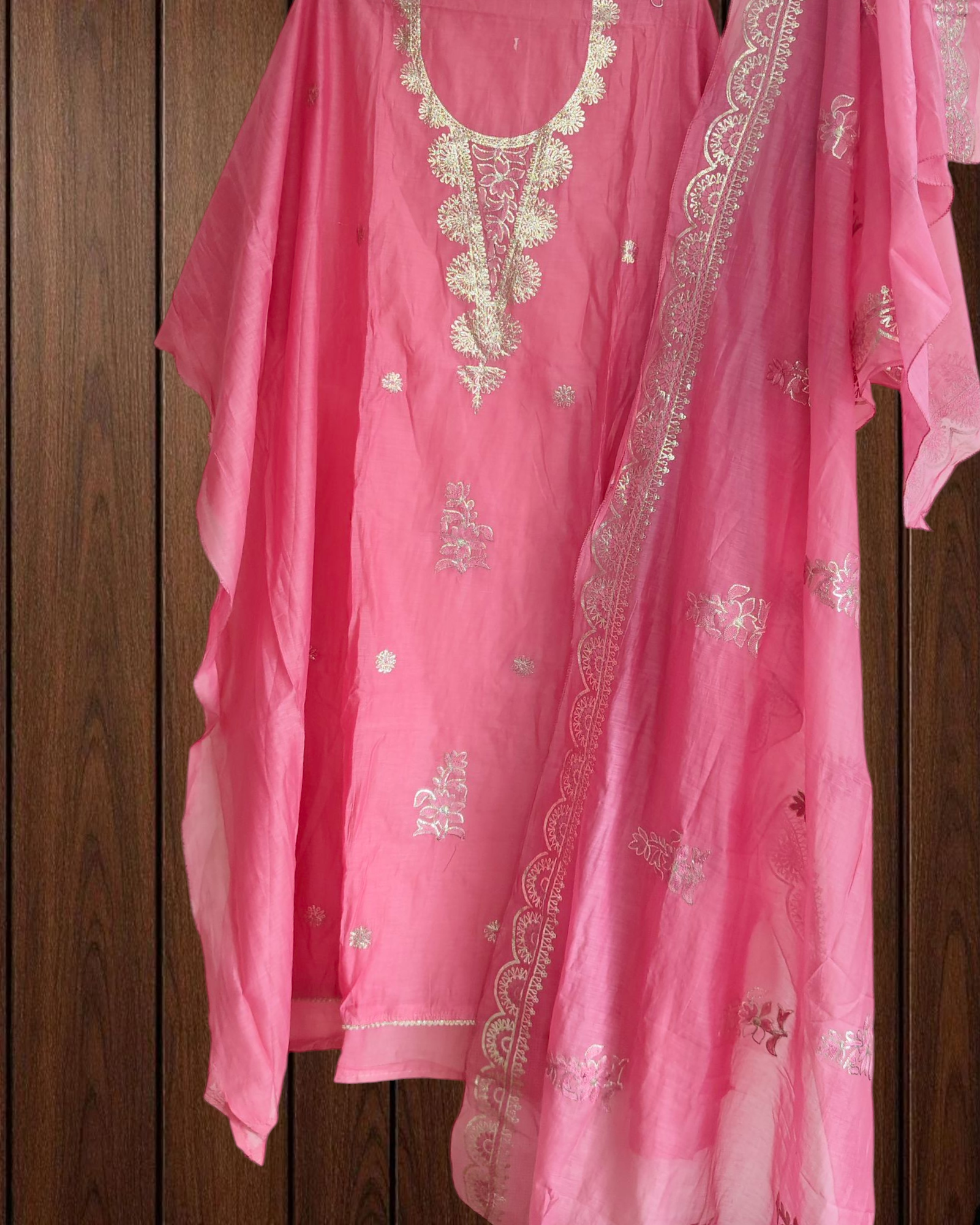 • Dupatta: Matching Mul Chanderi Dupatta beautifully embellished with Pita and embroidery work, adding a graceful charm.