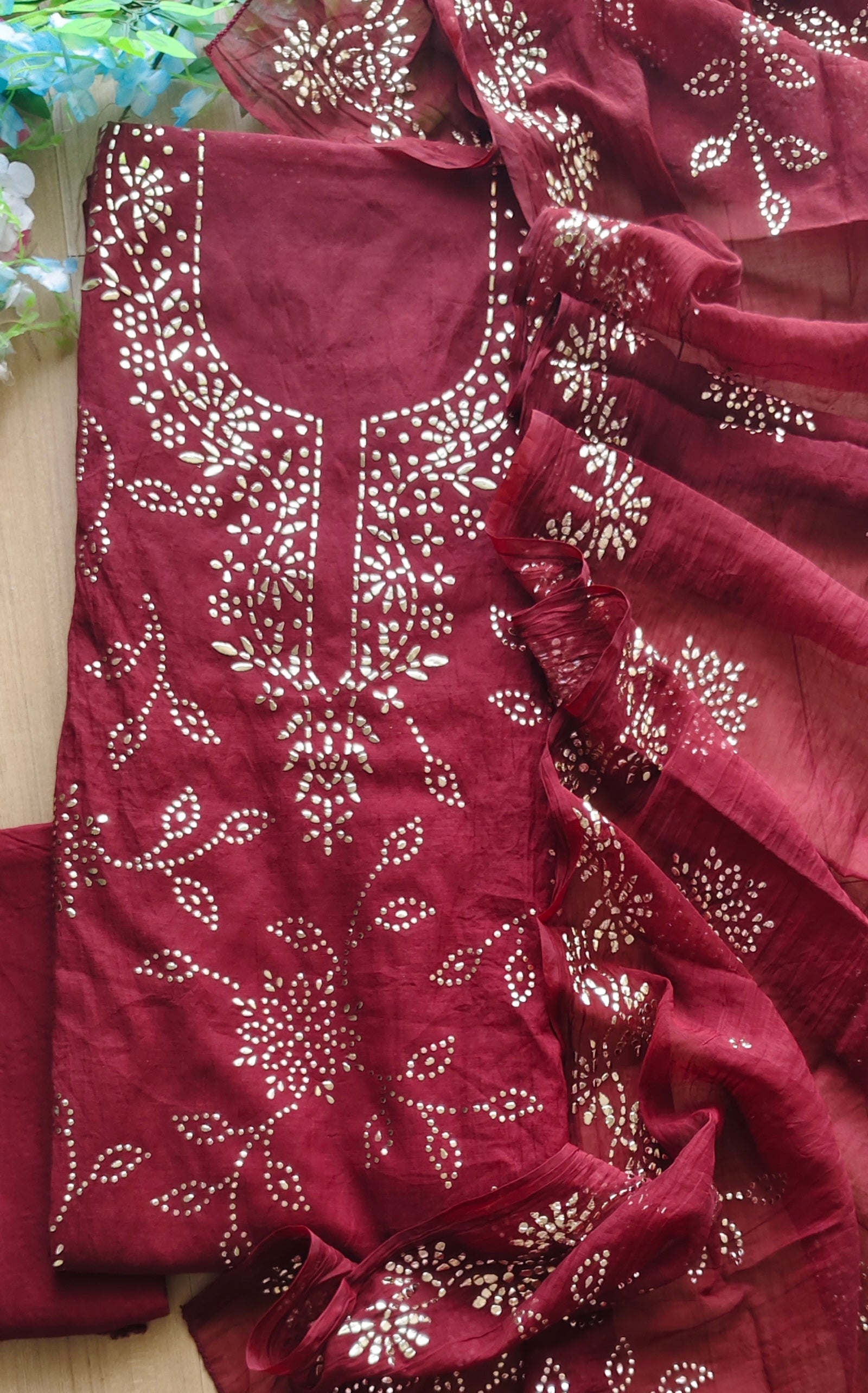 Step into subtle elegance with this exquisitely crafted unstitched suit set. The soft sheen of pure Mul Chanderi is beautifully adorned with intricate Mukesh work, making it a timeless piece perfect for festive gatherings and special occasions. Lightweight, breathable, and graceful — it's designed to make you shine effortlessly.