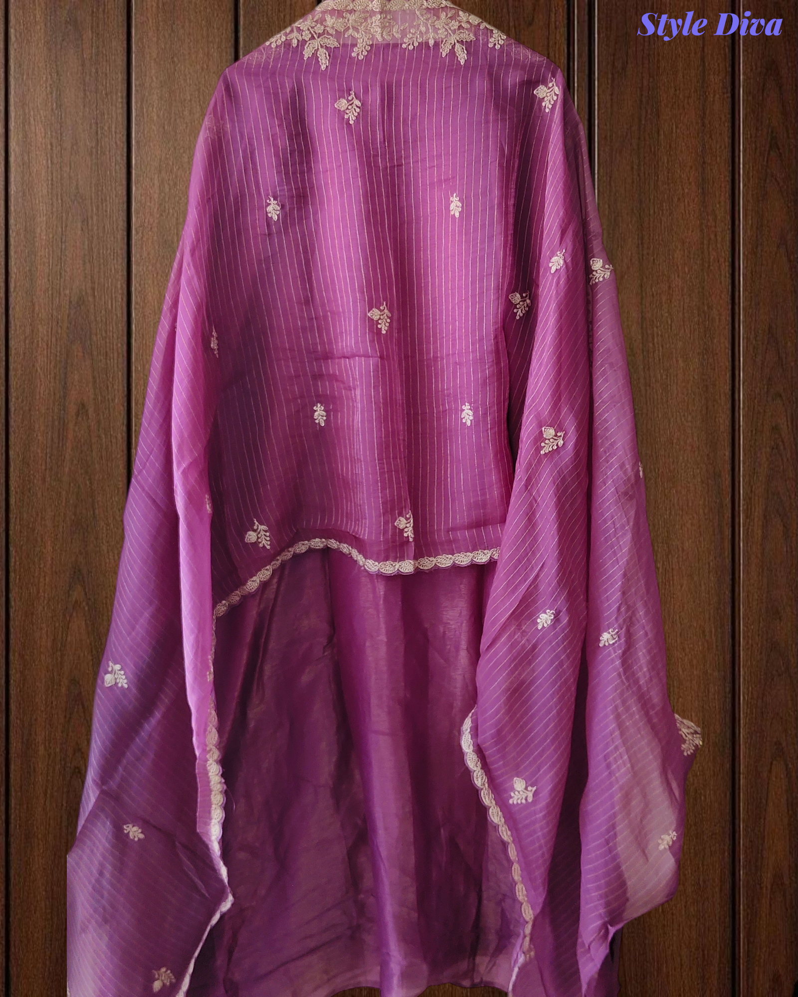 Kurta: Muslin shimmer kurta beautifully adorned with intricate zardosi work, offering a rich festive appeal with a subtle shine.