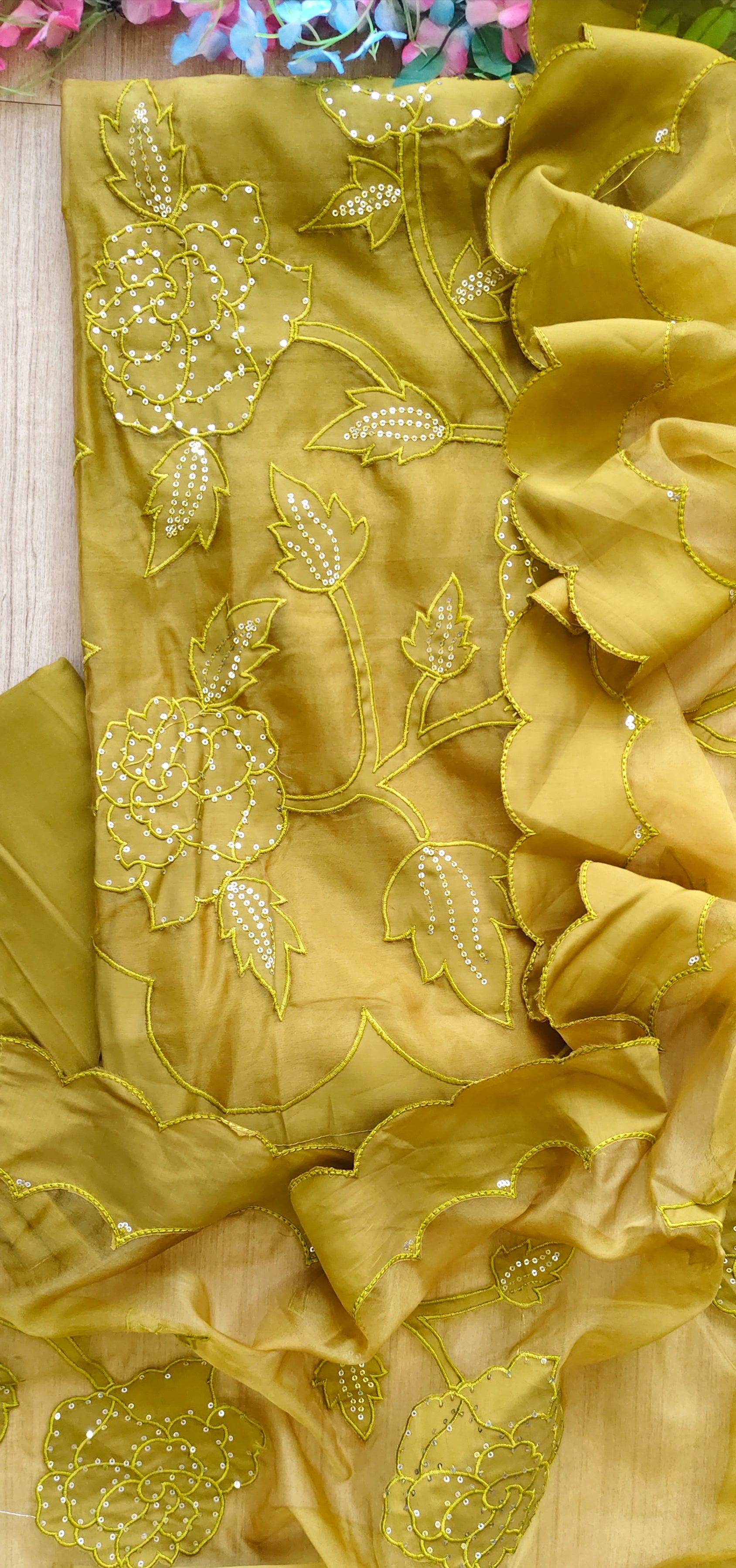 Grace meets craftsmanship in this exquisite Soft Mul Chanderi unstitched suit set, beautifully enhanced with intricate appliqué work and subtle sequence highlighting. Paired with a delicate organza dupatta adorned with coordinated detailing, this ensemble brings effortless elegance to your festive and party wardrobe — perfect for celebrations, gatherings, and special occasions.