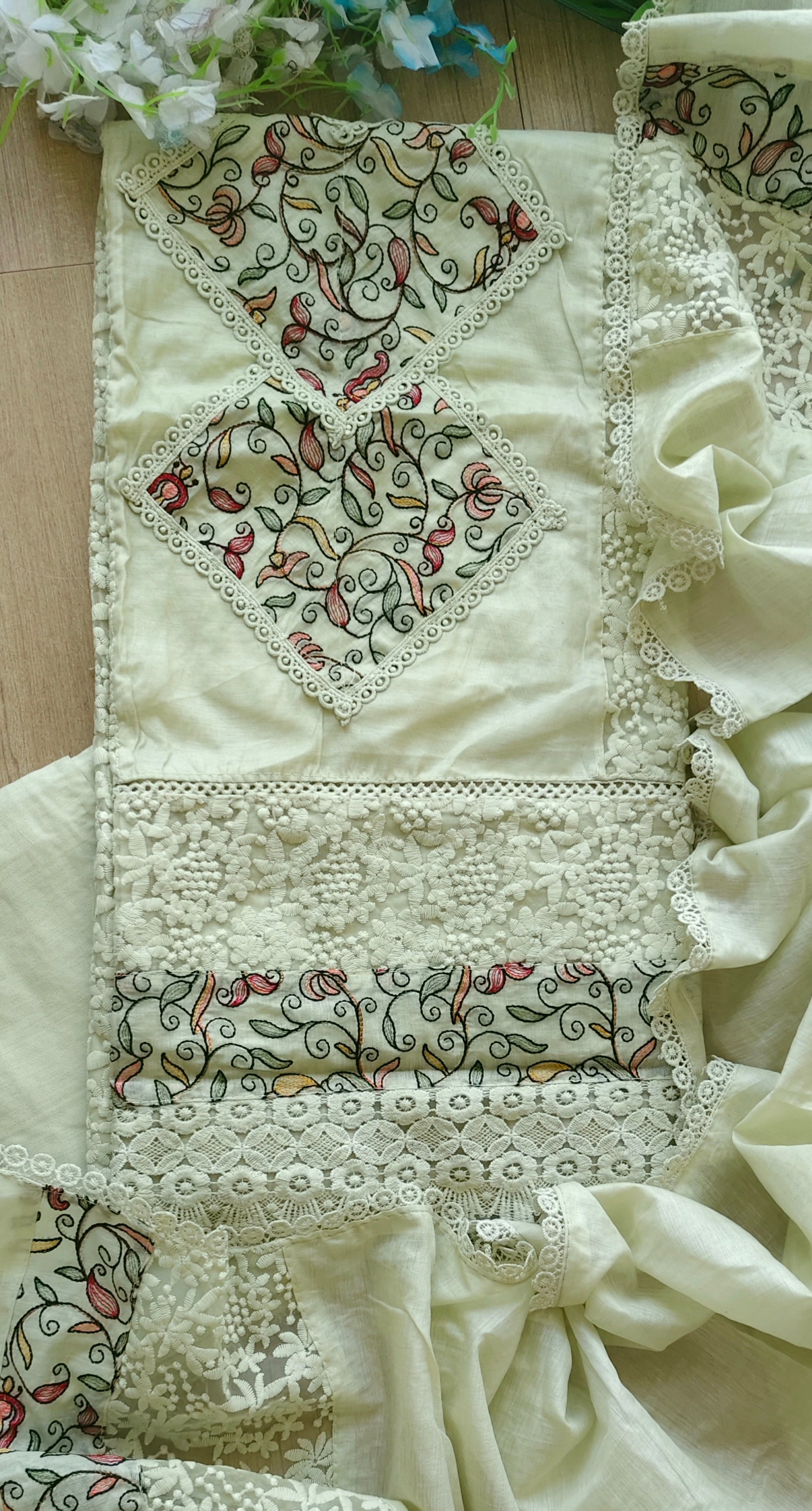 Elevate your ethnic wardrobe with this graceful soft mul chanderi ensemble. The kurta is beautifully enhanced with intricate applique work and refined crochet lacing, creating a look that feels both traditional and contemporary. The coordinated mul chanderi dupatta with applique detailing adds a touch of sophistication, while the soft rayon bottom fabric ensures day-long comfort.