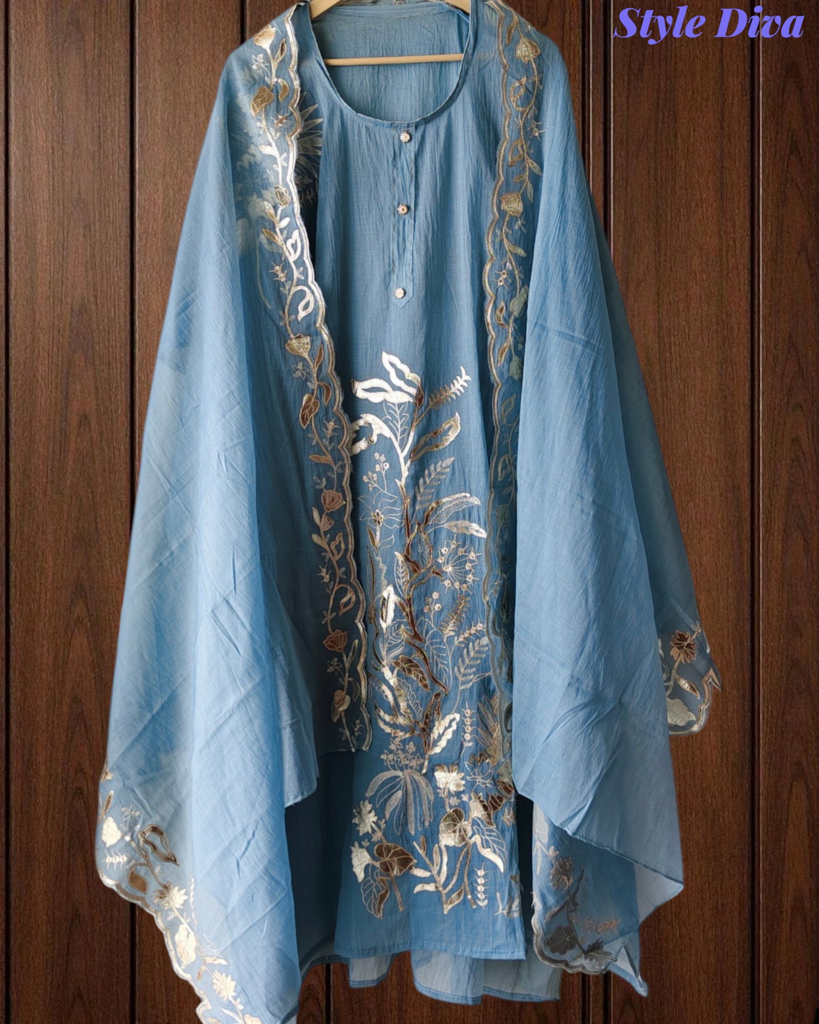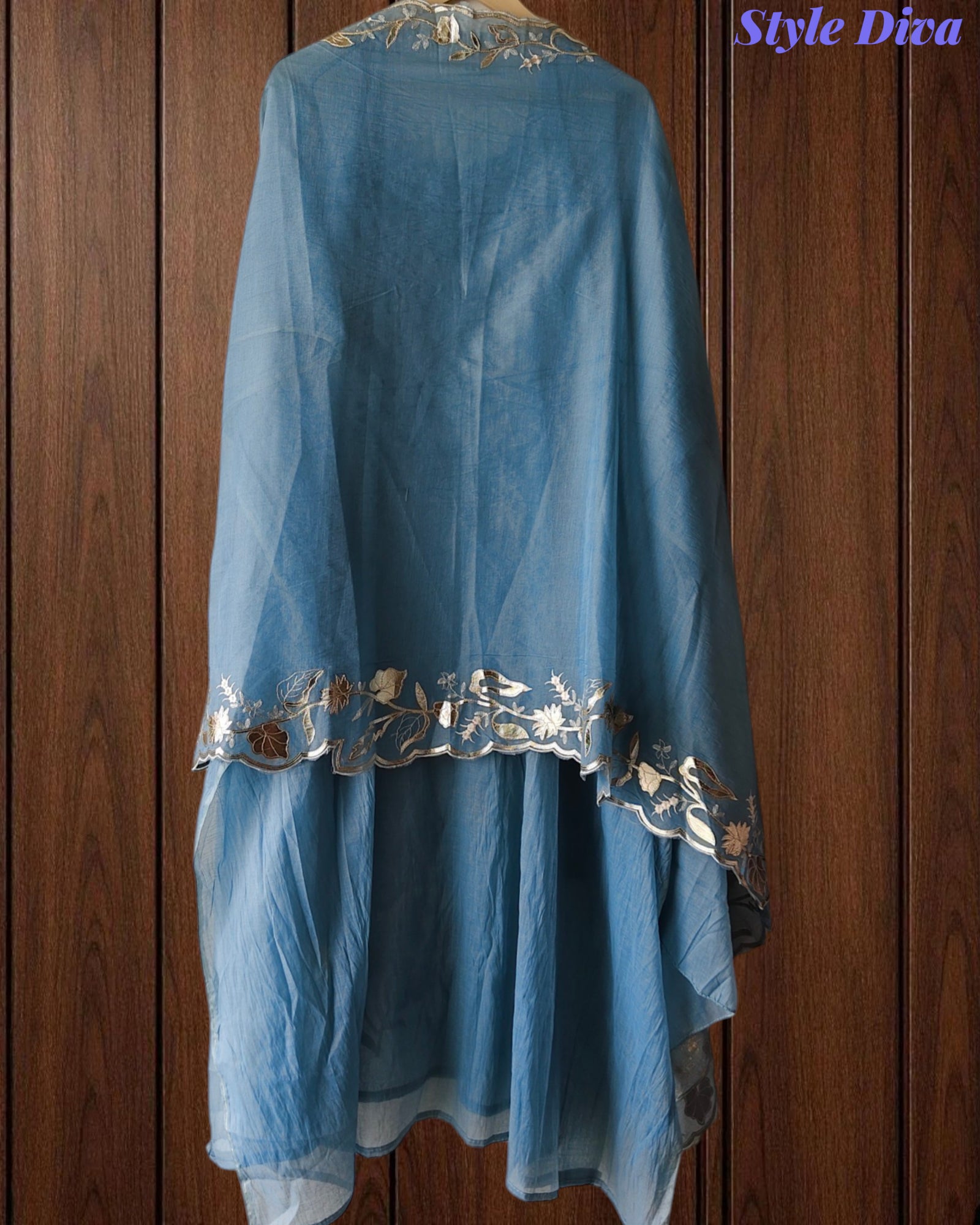 Step into timeless elegance with this Soft Mul Chanderi Gotta Work Un Stitched Suit, designed to bring grace and festive charm to your wardrobe. The kurta is crafted in soft Mul Chanderi fabric and adorned with delicate Gotta work that adds a subtle shimmer and traditional appeal. It is paired with a matching Mul Chanderi dupatta featuring coordinated Gotta detailing, creating a beautifully balanced ethnic ensemble. The soft rayon bottom fabric ensures comfort and ease of wear, making this suit an excellent choice for festive gatherings, celebrations, and party occasions. A perfect blend of sophistication and traditional craftsmanship.