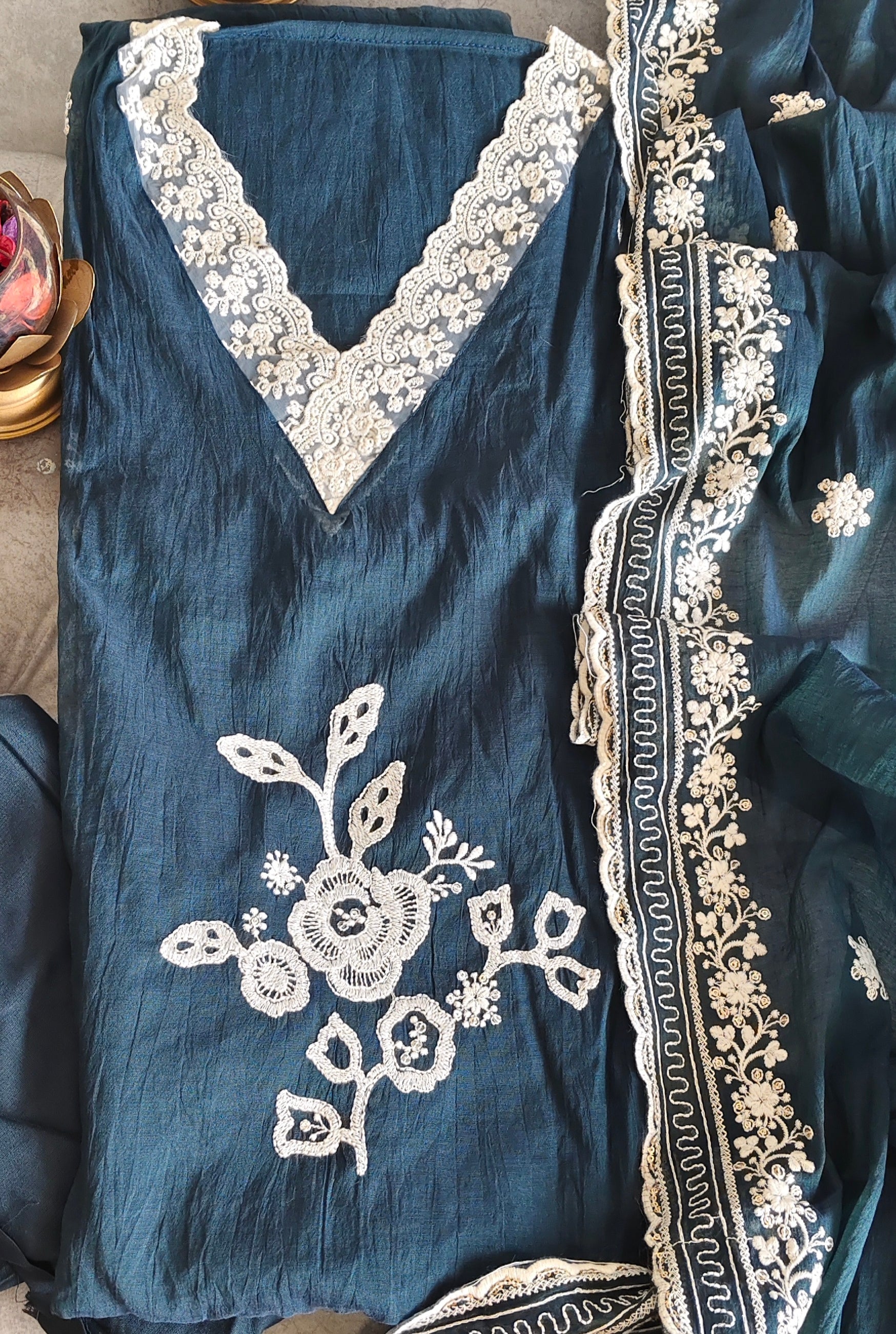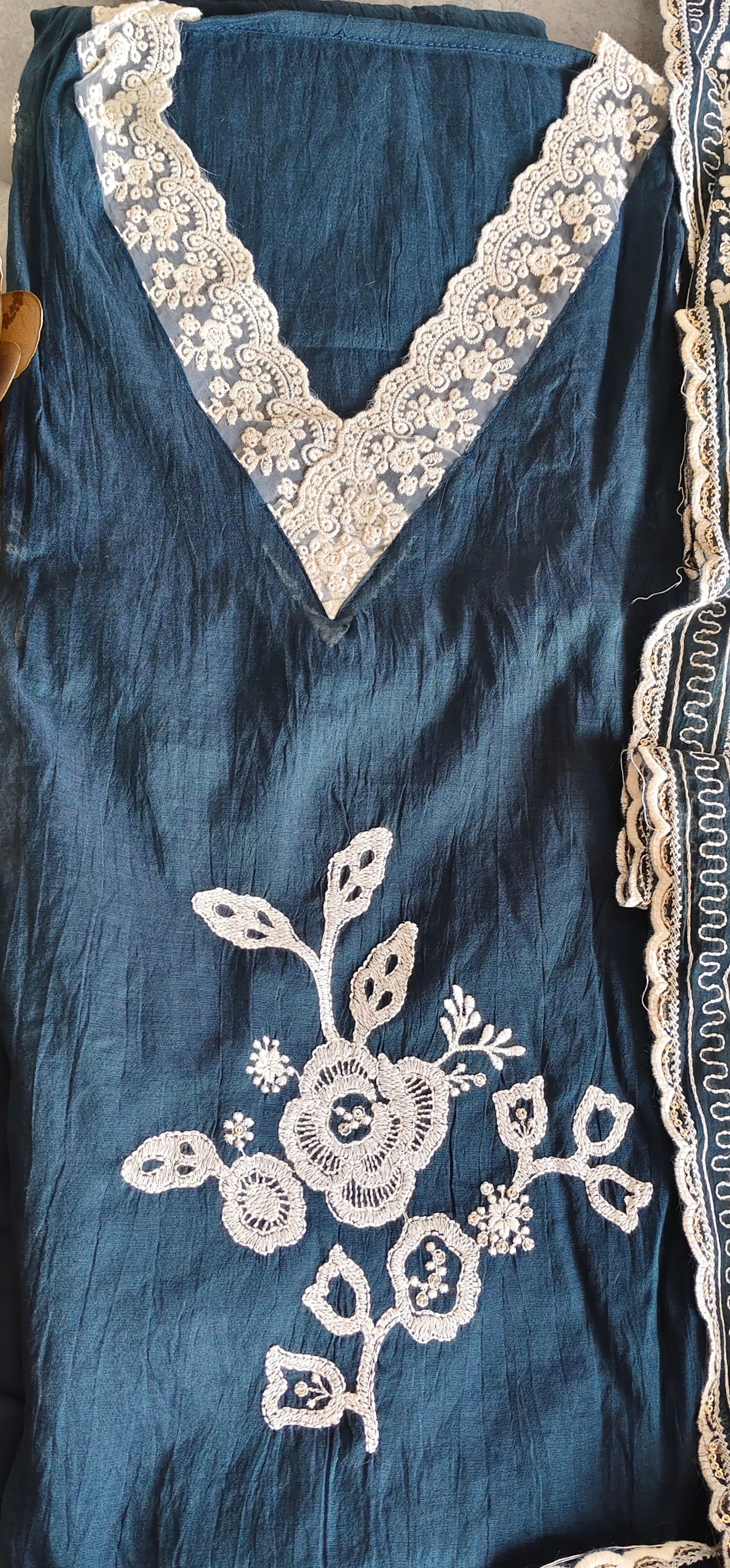 A timeless piece of artistry, this Mul Chanderi suit set showcases the elegance of traditional Parsi embroidery with the added charm of crochet lace detailing. Perfect for casual gatherings or graceful day wear, it offers both comfort and sophistication, allowing you to style it to your preference.
