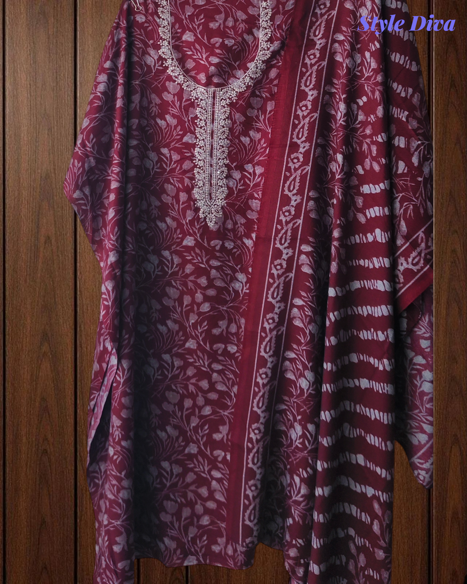 A beautifully crafted winter-ready pashmina suit set featuring floral prints and graceful neck embroidery. Paired with a digitally printed dupatta and solid matching bottom, it offers warmth, comfort, and effortless seasonal elegance.