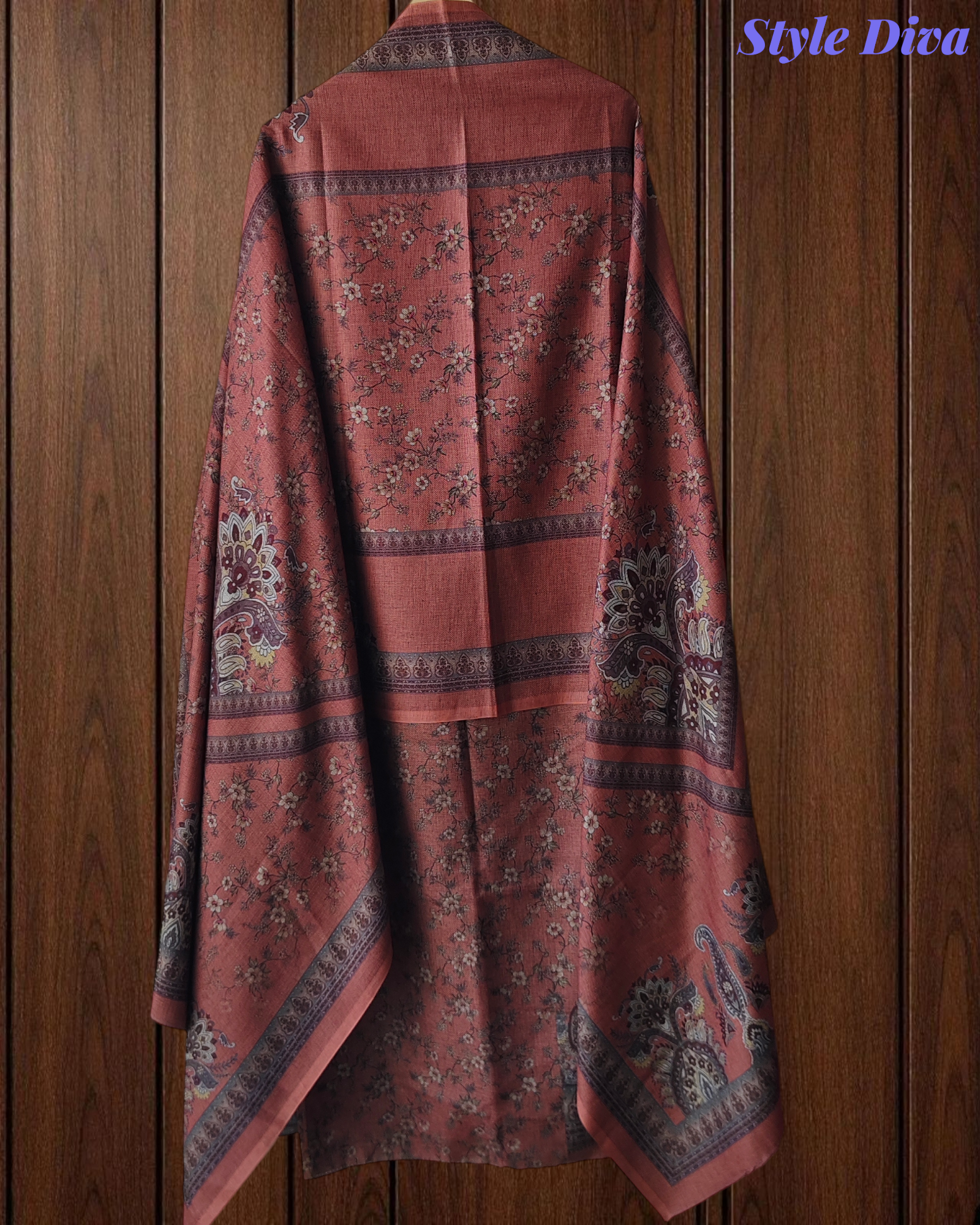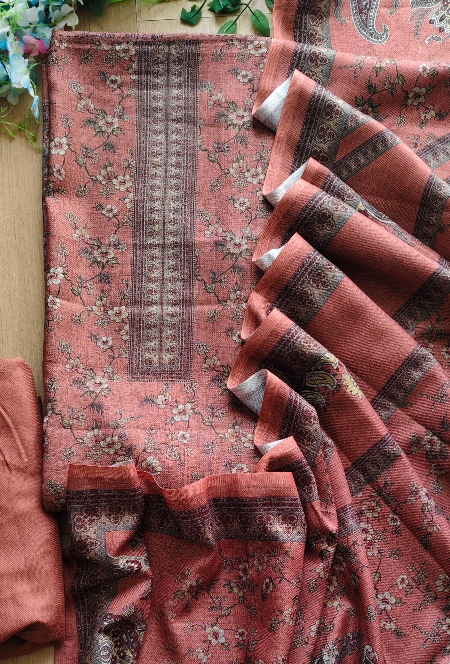 This premium pashmina floral digital printed suit set offers the perfect blend of warmth, comfort, and elegance. Paired with a solid color bottom fabric, it creates a classy winter ensemble suitable for everyday wear and light festive gatherings.