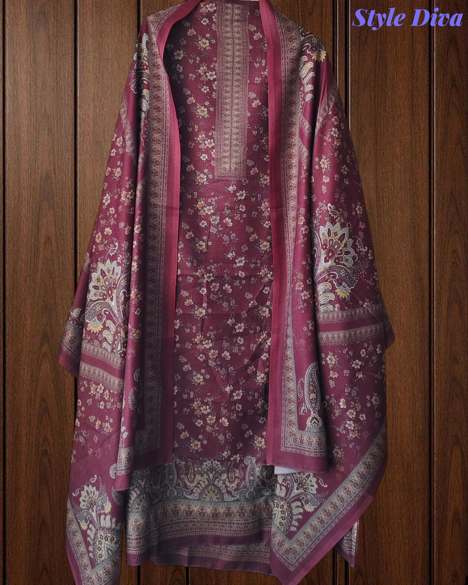 This premium pashmina floral digital printed suit set offers the perfect blend of warmth, comfort, and elegance. Paired with a solid color bottom fabric, it creates a classy winter ensemble suitable for everyday wear and light festive gatherings.