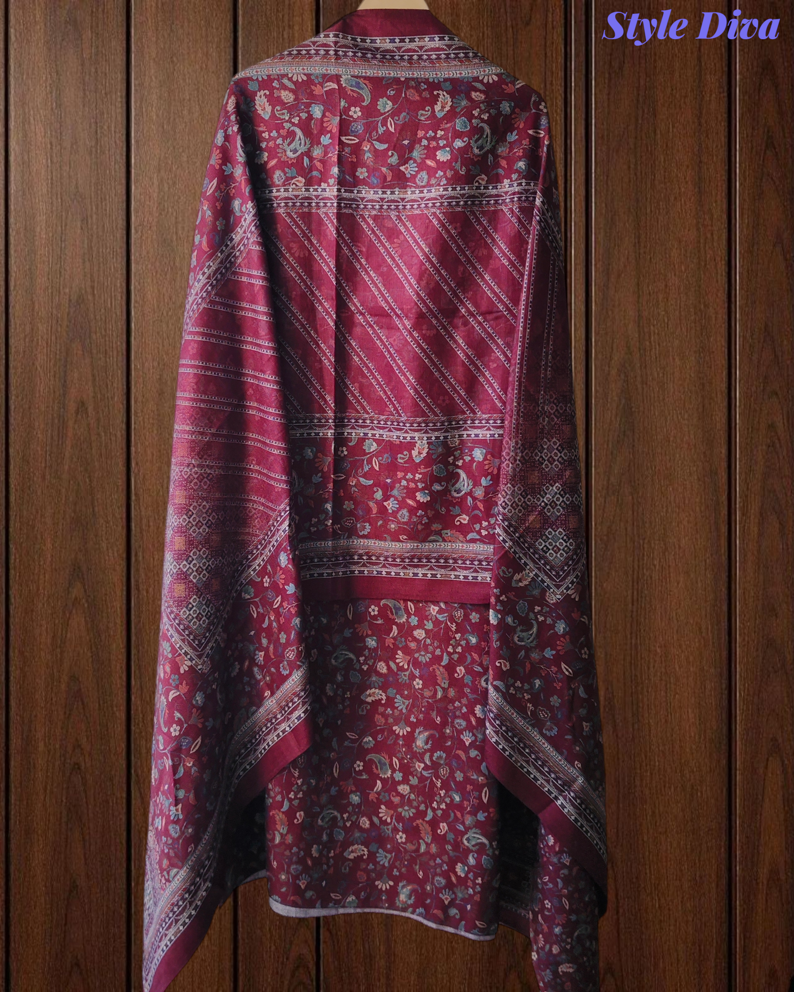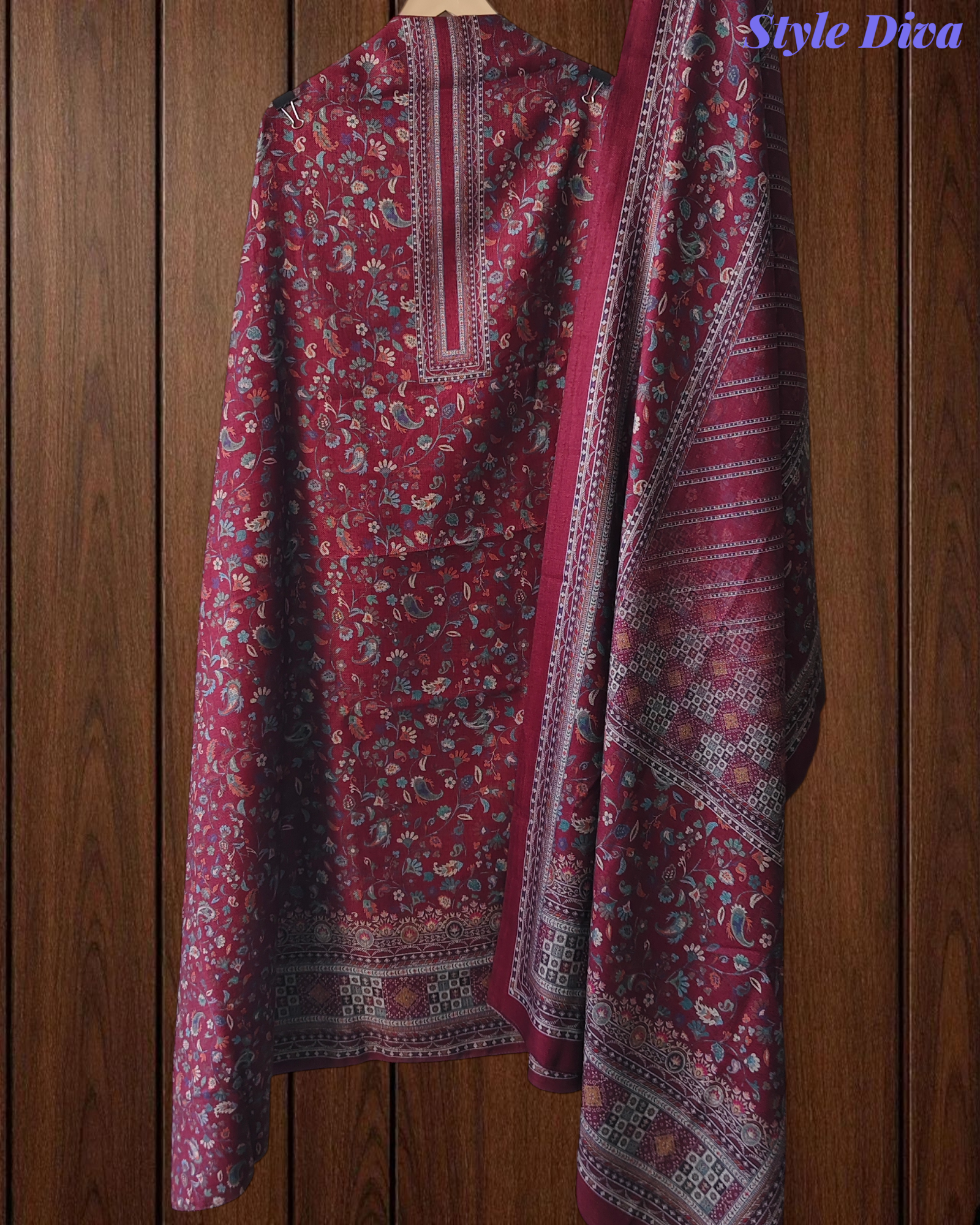 This premium pashmina floral digital printed suit set offers the perfect blend of warmth, comfort, and elegance. Paired with a solid color bottom fabric, it creates a classy winter ensemble suitable for everyday wear and light festive gatherings.